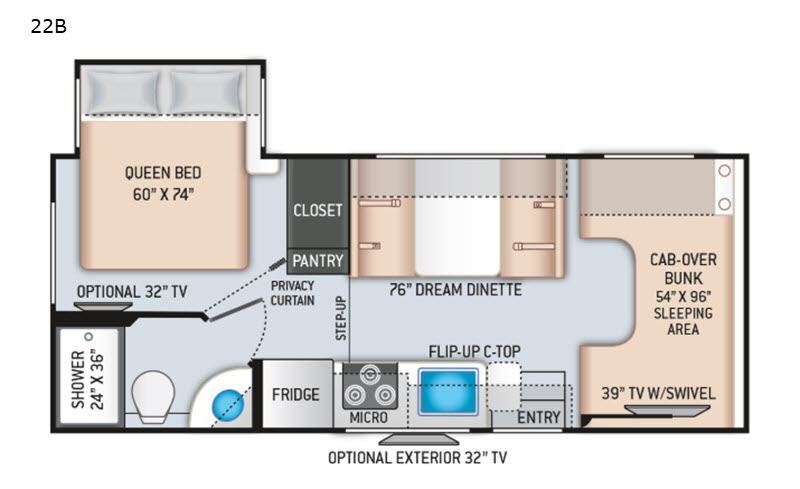This Four Winds coach is a great Class C gas motorhome for you to take on any road trip! With a rear corner bath layout, a single slide out for added space, and your choice of chassis and engine, you will quickly see the benefits this unit has to offer. After you are set up at your destination, head inside to enjoy the interior comforts. Here you will find a 76" Dream Dinette which can convert into additional sleeping space, a 54" x 96" bunk over the cab, and an RV queen bed in the rear semi-private bedroom. When you want to unwind for the day, you will love being able to watch your favorite program on the 39" TV above the cab! And don't forget to choose the optional exterior 32" TV to watch the big game outdoors!