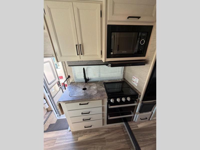 Easily head out for fun at a state park, the lake or your friend's ranch. This coach is easy to maneuver on the road or in town thanks to its compact size, yet has so many conveniences, you might not return home. The front cab over bunk is a perfect sleeping space for guests, the 39" TV allows you to watch shows when you want some inside time, and the dream dinette gives you a place to dine and relax. The cook will love all the kitchen amenities at their fingertips, plus the flip-up countertop extension is super handy. The rear corner bedroom offers a queen bed slide for more floor space, a privacy curtain and a closet, plus the full bathroom is a few steps away. You can also choose to add the optional exterior 32" TV for outdoor fun!