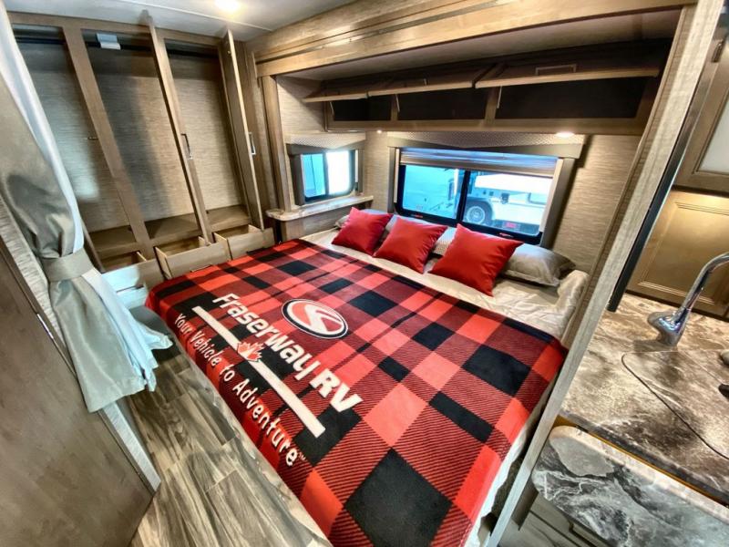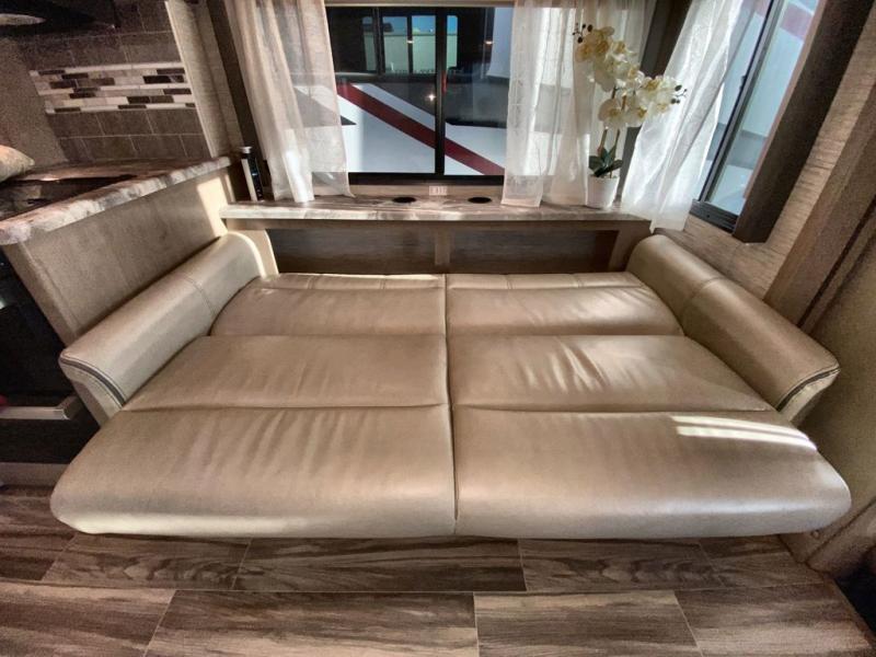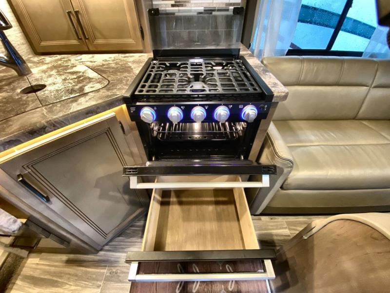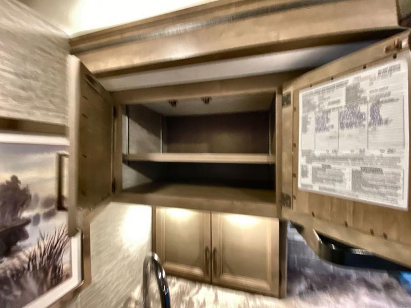 Sleep like a king each time you take this coach on vacation! You and your favorite person will always get a good night's rest even when you have family or friends staying over on the cab over bunk and furniture, plus you can close the privacy curtain if needed. You will have a rear closet for your clothing, and you might choose to add the optional 32" TV to watch your own shows at night. Everyone can take turns getting cleaned up in the full bathroom with a 30" x 36" shower, and there is a closet just outside to stow linens or guest's belongings. The kitchen amenities include a gas cooktop with a glass cover and a microwave oven with option to add a convection microwave oven, and a large stainless steel sink on one side and a double door refrigerator and pantry on the other giving you everything you need to feed everyone. And the jack-knife sofa plus the dream dinette offer a cozy place to visit.