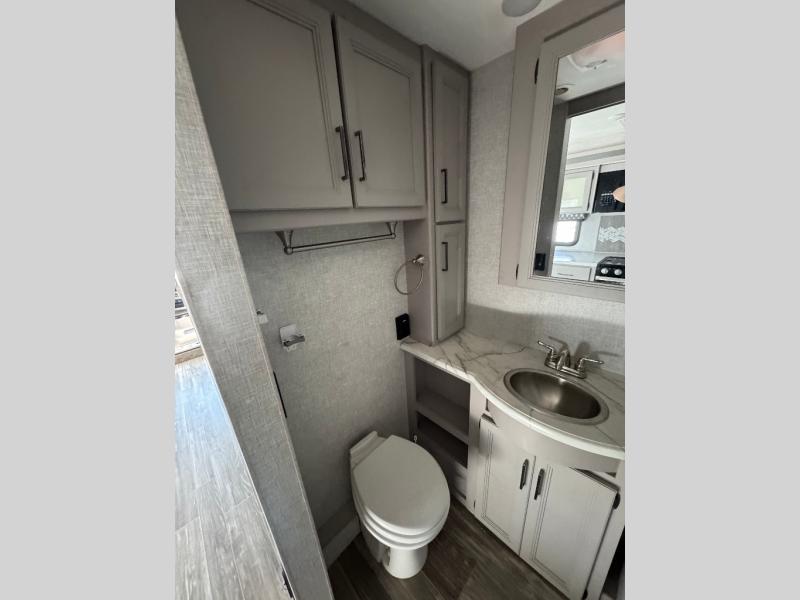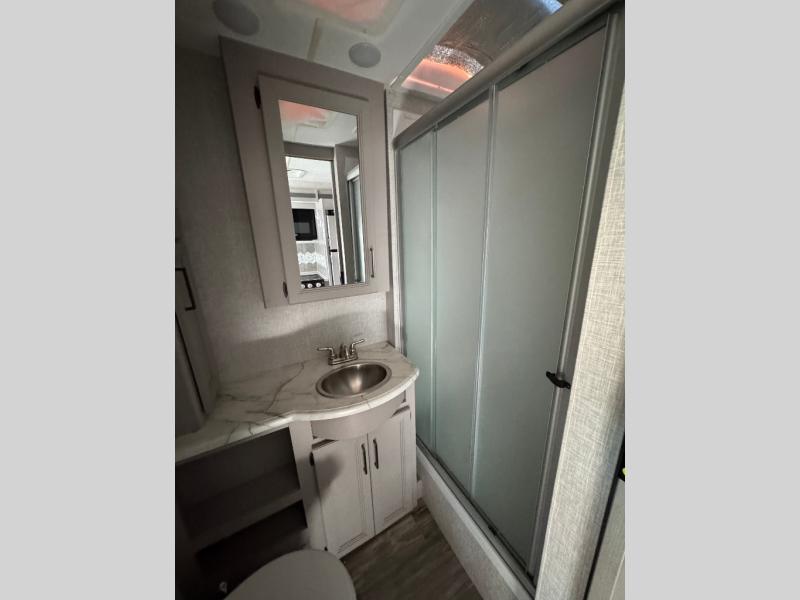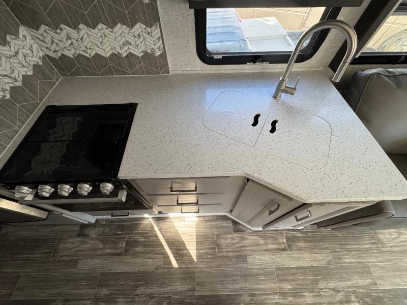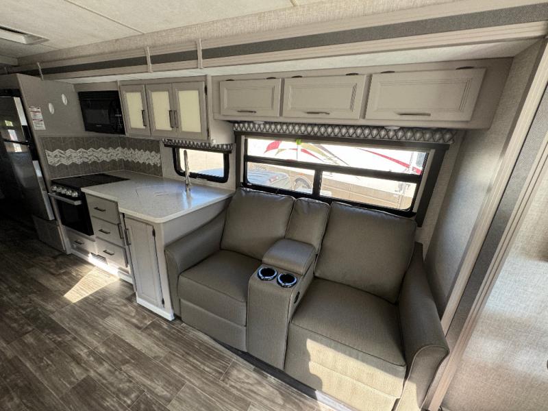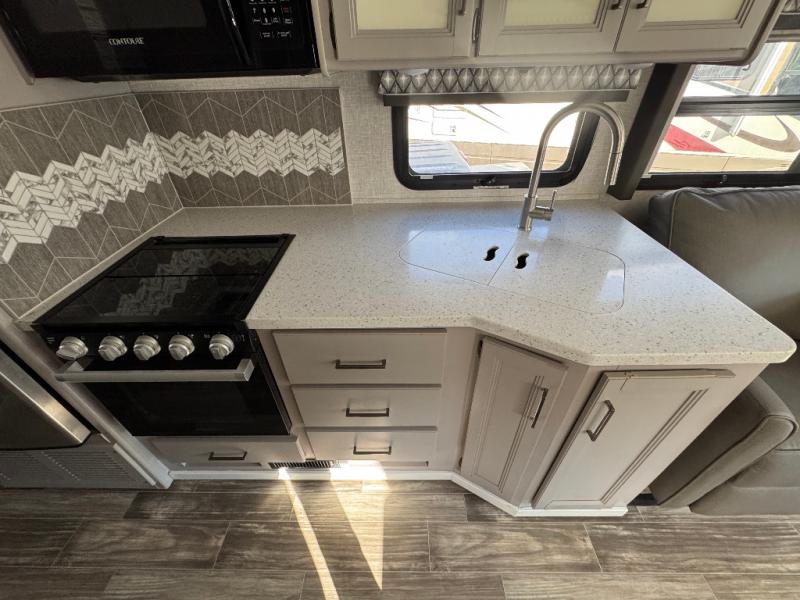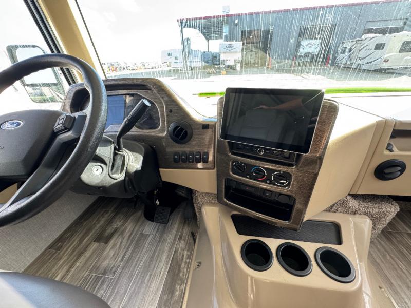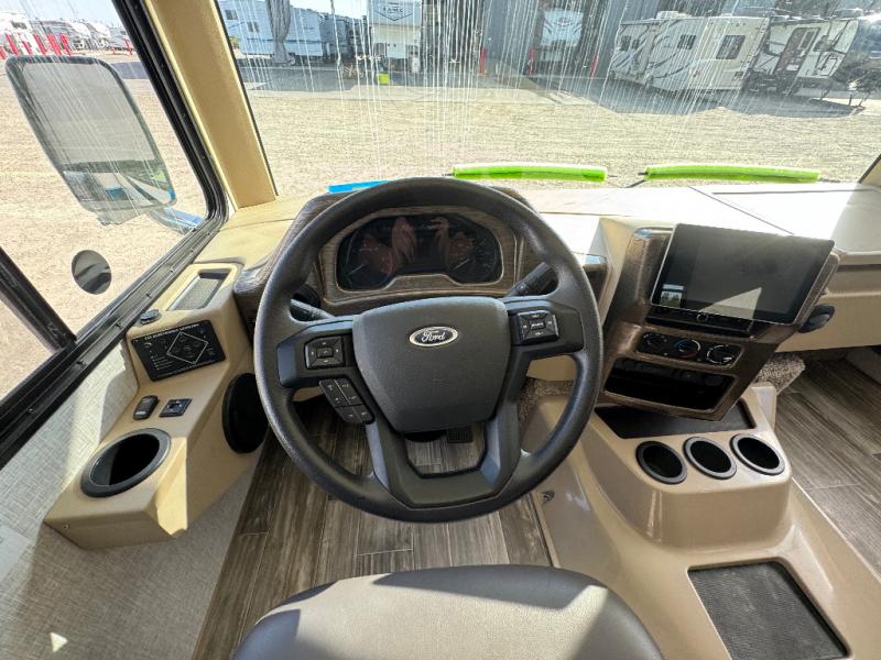 With any Hurricane Class A gas motorhome by Thor Motor Coach you will appreciate solid construction materials, like the welded tubular steel floor and the Vacu-Bond laminated roof, walls, and floor with block foam insulation. Each model sits on a Ford F-53 chassis with a 7.3L Triton V8 engine for power you can feel, plus there is an 8,000 lb. trailer hitch with a 7-pin round connector to pull your car along. The Rapid Camp+ multiplex system with Bluetooth will allow you to easily set up camp from the convenient 7" touchscreen provided, and the Winegard ConnecT WiFi extender +4G will let you catch up on work if needed. The Hurricane includes pressed laminated countertops inside, as well as residential vinyl flooring, decorative glass and tile backsplash in the kitchen, and many more at-home comforts.