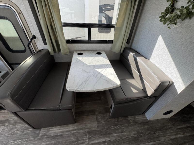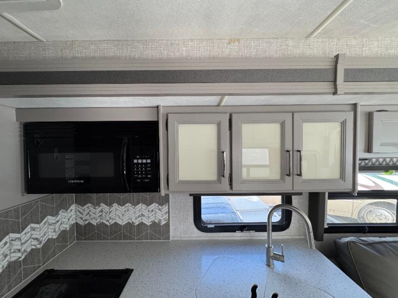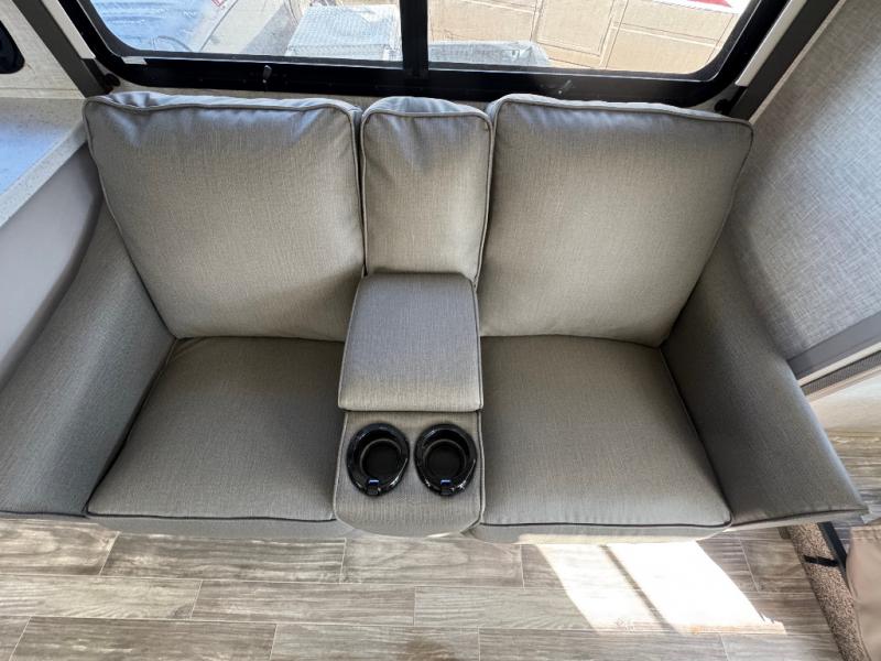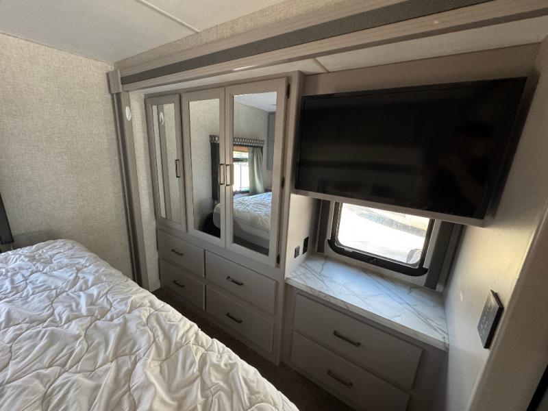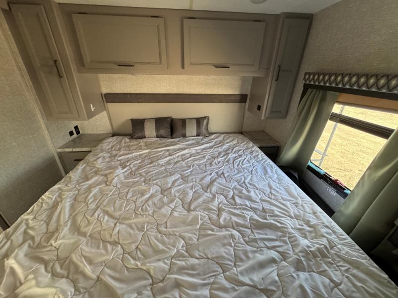 Family trips across the country are made complete in this spacious coach! The swivel captain's chairs can become a part of the living area once you park, and your guests can relax on the Dream Dinette or sofa bed. Lunch can be made on the three burner gas cooktop, or in the 30" over-the-range microwave oven, and clean up will be a breeze in the large double bowl stainless steel sink. This model also includes an outdoor kitchen with a refrigerator and a sink to store cold drinks and clean up before dinner. You will love having your own bedroom to retreat to each night, and here you'll find a king bed, a 32" TV, plus a closet to keep your clothes and shoes tidy!
