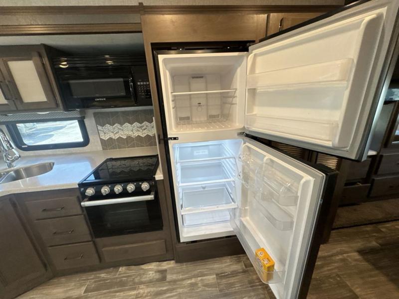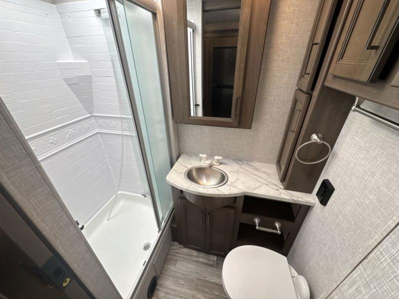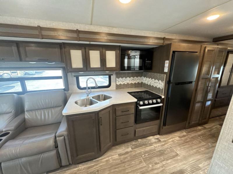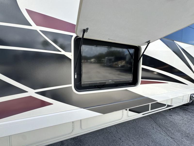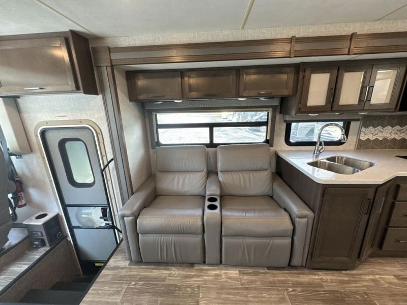 You're going to love the amount of space you have in this coach thanks to the full-wall slide across from the large slide out. Kick back on the theater seating with footrests directly across from the 49" TV in the living area, or play a game at the Dream Dinette. There is a second living area TV in great view from the drop-down overhead bunk as well! Preparing meals each day will be a breeze with a 30" over-the-range microwave, a three burner cooktop, plus a residential refrigerator to hold perishables. You'll find it so easy to stay clean with a full bath on board, complete with a glass door and a shower skylight to let natural light in. When it's time to call it a night, you'll love retreating to the rear bedroom with a king bed, your own 32" TV, and a closet for pj's!