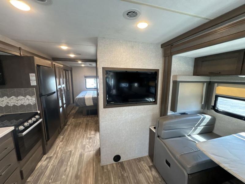 With any Hurricane Class A gas motorhome by Thor Motor Coach you will appreciate solid construction materials, like the welded tubular steel floor and the Vacu-Bond laminated roof, walls, and floor with block foam insulation. Each model sits on a Ford F-53 chassis with a 7.3L Triton V8 engine for power you can feel, plus there is an 8,000 lb. trailer hitch with a 7-pin round connector to pull your car along. The Rapid Camp+ multiplex system with Bluetooth will allow you to easily set up camp from the convenient 7" touchscreen provided, and the Winegard ConnecT WiFi extender +4G will let you catch up on work if needed. The Hurricane includes pressed laminated countertops inside, as well as residential vinyl flooring, decorative glass and tile backsplash in the kitchen, and many more at-home comforts.