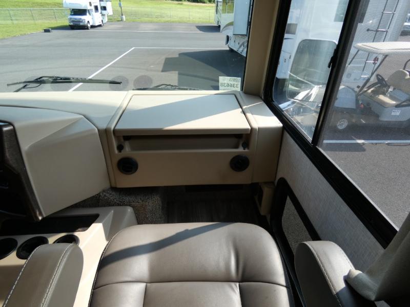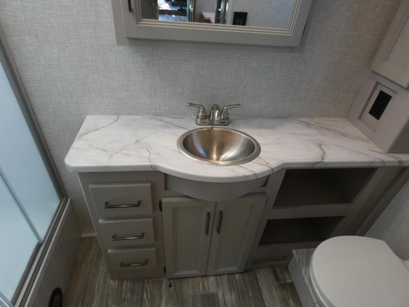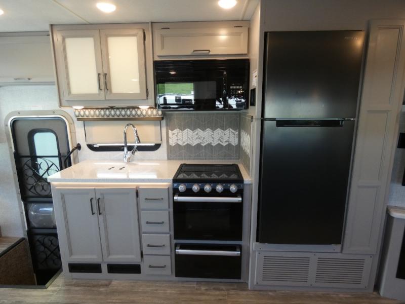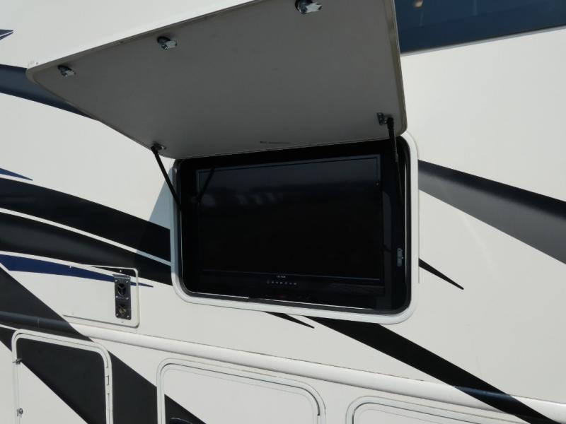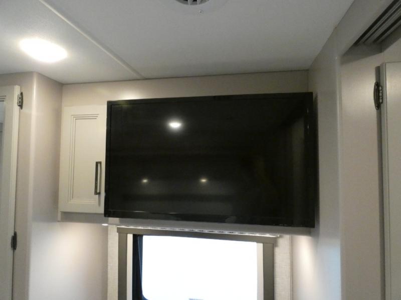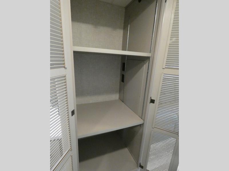 A bath and a half in this coach make it perfect for trips with friends and family. You will have tons of space provided by the two slide outs, plus a sleeping capacity of six to seven people each night. The expanding sofa bed has a great view of the 39" TV, and the Dream Dinette will be great for meals times and game night. Whip up a hearty meal on the three burner gas cooktop, or use the convenient over-the-range microwave oven. There is also a 12 cu. ft. residential refrigerator and a pantry for food storage. You'll be very pleased with the master bedroom that includes a king bed, a 32" TV, and a closet to keep your clothes wrinkle-free. There is even a second closet with stackable washer and dryer prep to make life on the road easier than ever.