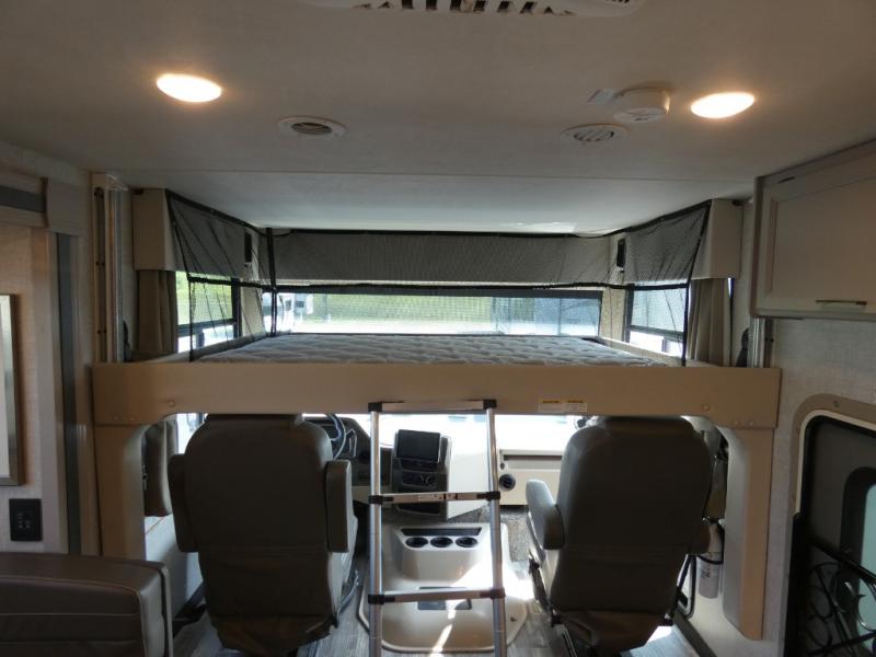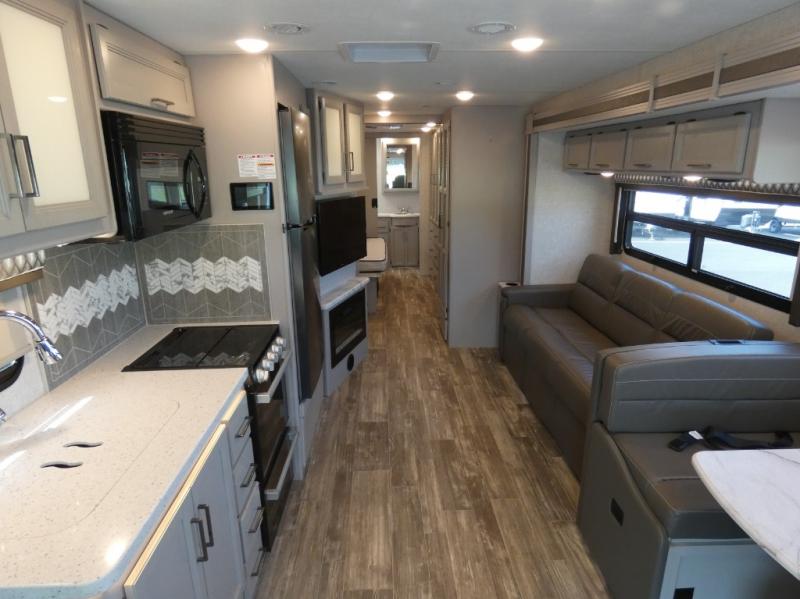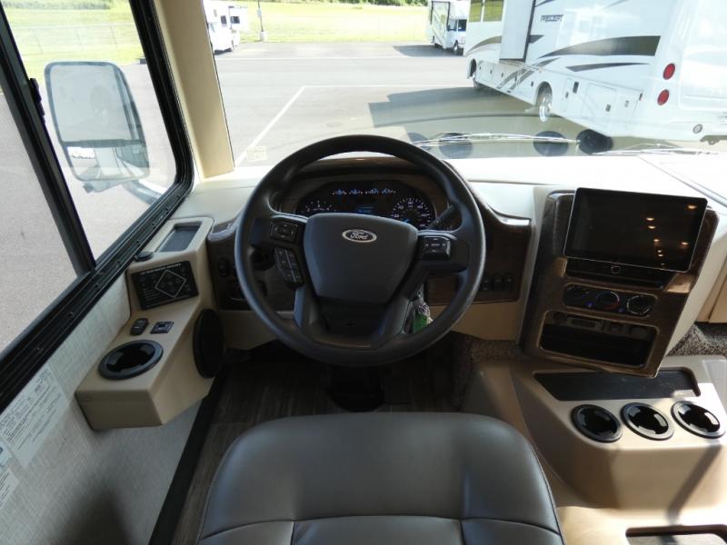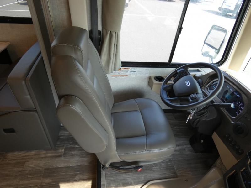 With any Hurricane Class A gas motorhome by Thor Motor Coach you will appreciate solid construction materials, like the welded tubular steel floor and the Vacu-Bond laminated roof, walls, and floor with block foam insulation. Each model sits on a Ford F-53 chassis with a 7.3L Triton V8 engine for power you can feel, plus there is an 8,000 lb. trailer hitch with a 7-pin round connector to pull your car along. The Rapid Camp+ multiplex system with Bluetooth will allow you to easily set up camp from the convenient 7" touchscreen provided, and the Winegard ConnecT WiFi extender +4G will let you catch up on work if needed. The Hurricane includes pressed laminated countertops inside, as well as residential vinyl flooring, decorative glass and tile backsplash in the kitchen, and many more at-home comforts.