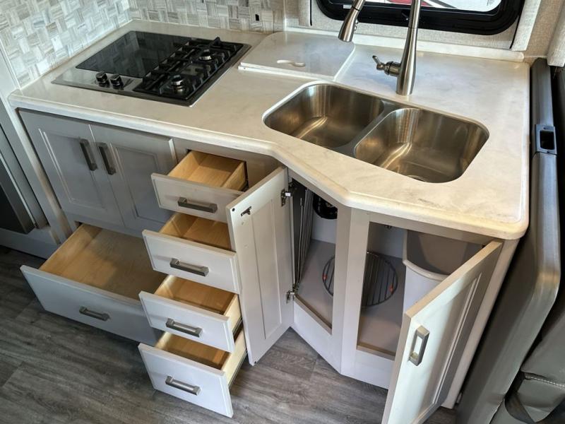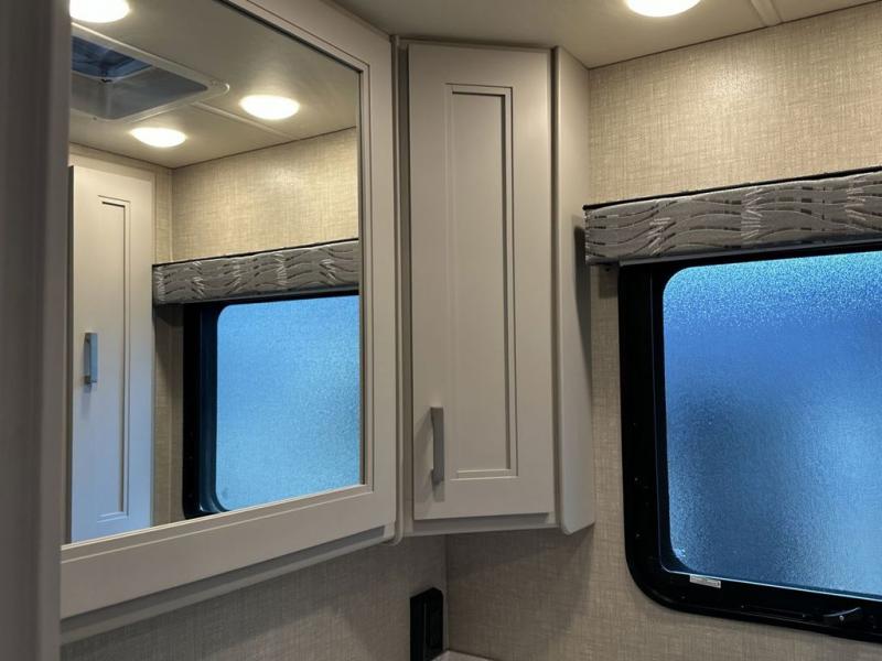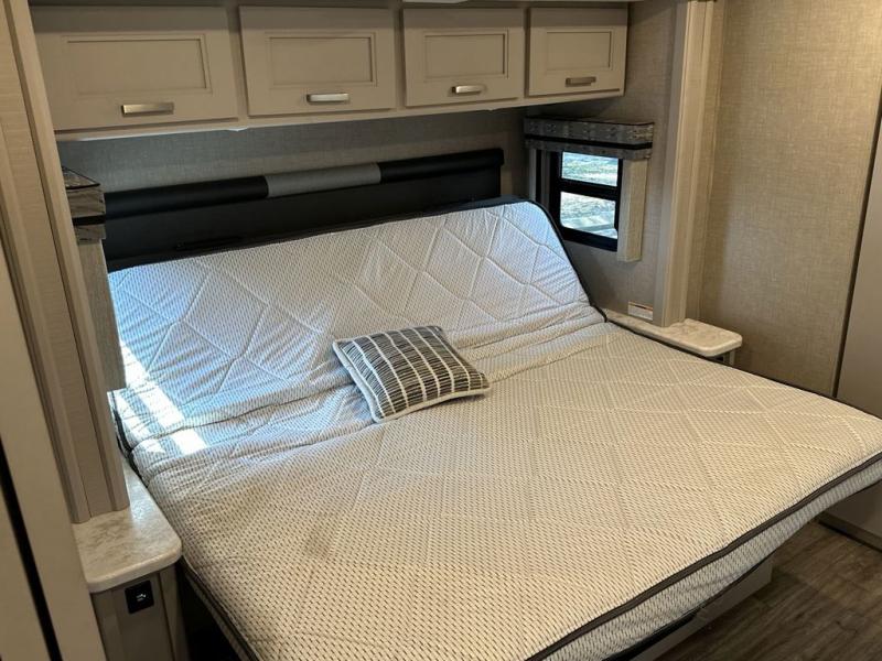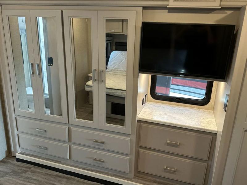 Head out on your greatest of adventures with this motorhome! You will feel right at home in the master suite with the Tilt-A-View inclining 72" x 76" king bed slide across from a closet with a dresser and a 32" TV, plus you have access to the full rear bathroom which has a 30" x 36" shower to get squeaky clean each morning. If you add the optional stackable washer and dryer to the prepped area then you can extend your trips with clean clothes. The two burner high output gas range top with a single induction cooktop will be easy to cook your favorite meals on and the 72" Dream Dinette offers a comfortable place to enjoy them. The drop-down 52" x 74" bunk over cab can not only be used for sleeping, but also for storage space. You also have a 68" jackknife sofa to read a book on during the day and transform into an extra sleeping space at night or you can switch it out for the optional theater seating!