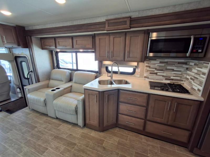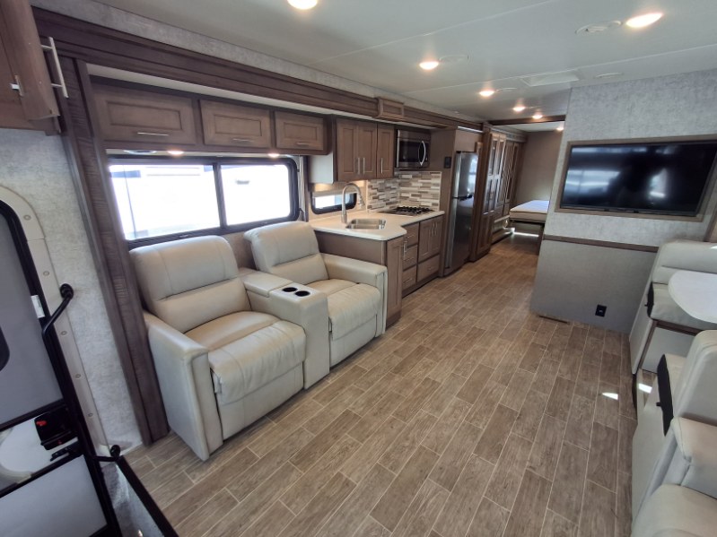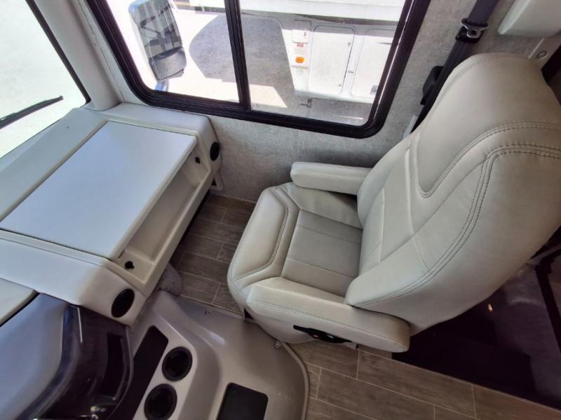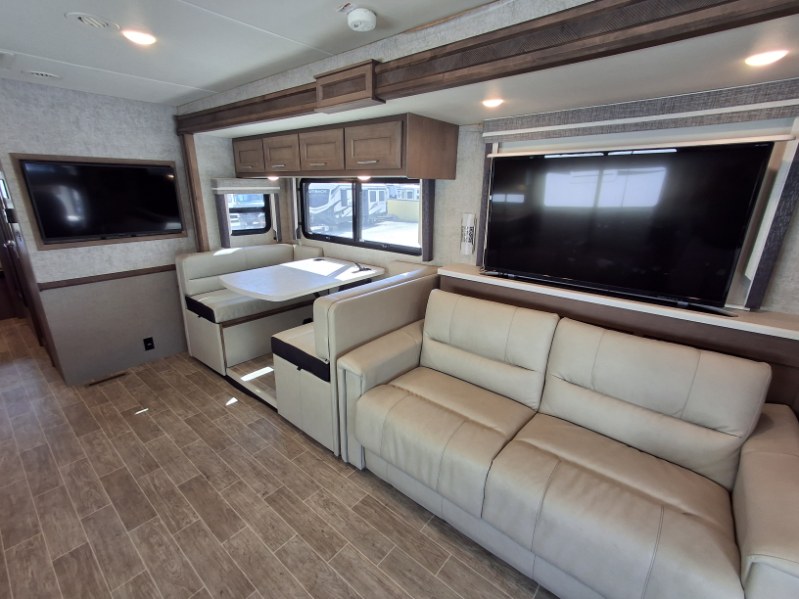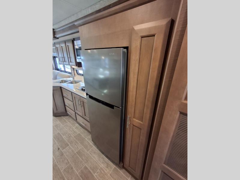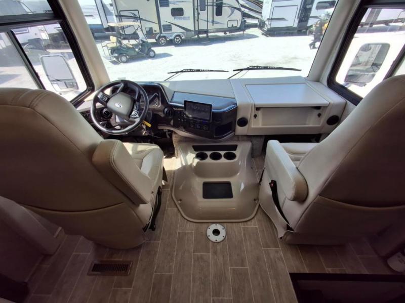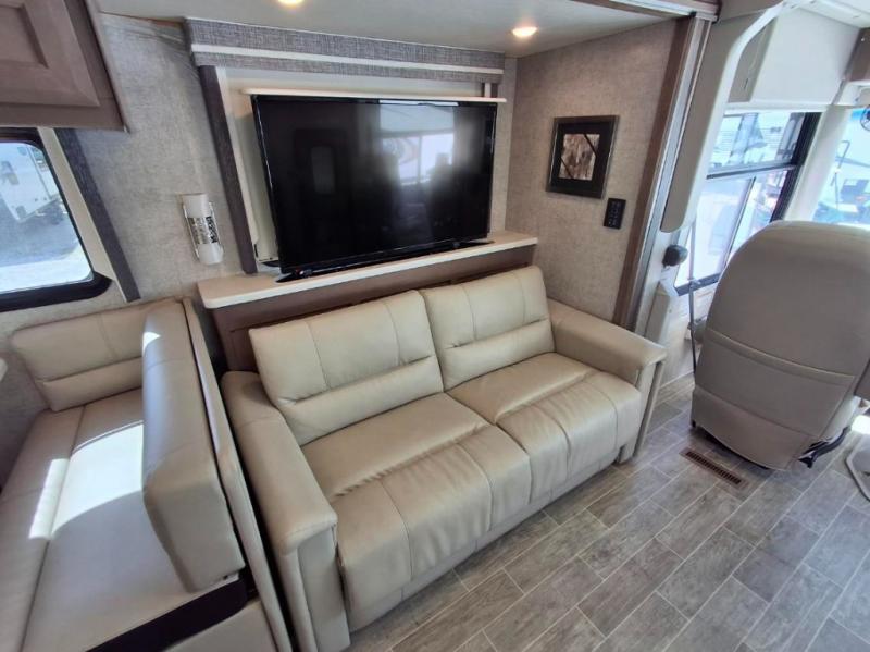 With any Miramar Class A gas motorhome by Thor Motor Coach you will find a durable welded tubular aluminum roof and sidewall cage construction, rotocast storage compartments, and frameless windows for a more sleek look. The 100-watt solar charging system with a power controller will allow you to do some off-grid camping, and you'll have an Onan RV QG 5500 gas generator on board for all your power needs. Each model includes the Rapid Camp+ multiplex wiring control system for quick and easy set up, and the Winegard ConnecT WiFi extender +4G will be perfect if you need to telecommute. Inside you'll find residential vinyl flooring, leatherette furniture, plus satin finish cabinetry with solid wood flat panel cabinet doors and nickel finish hardware for a truly luxurious coach!