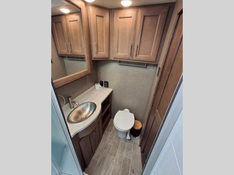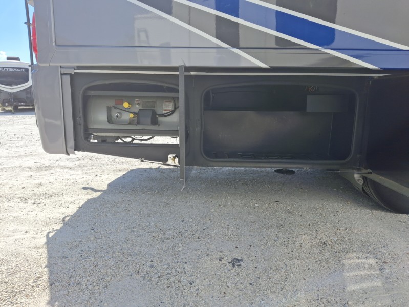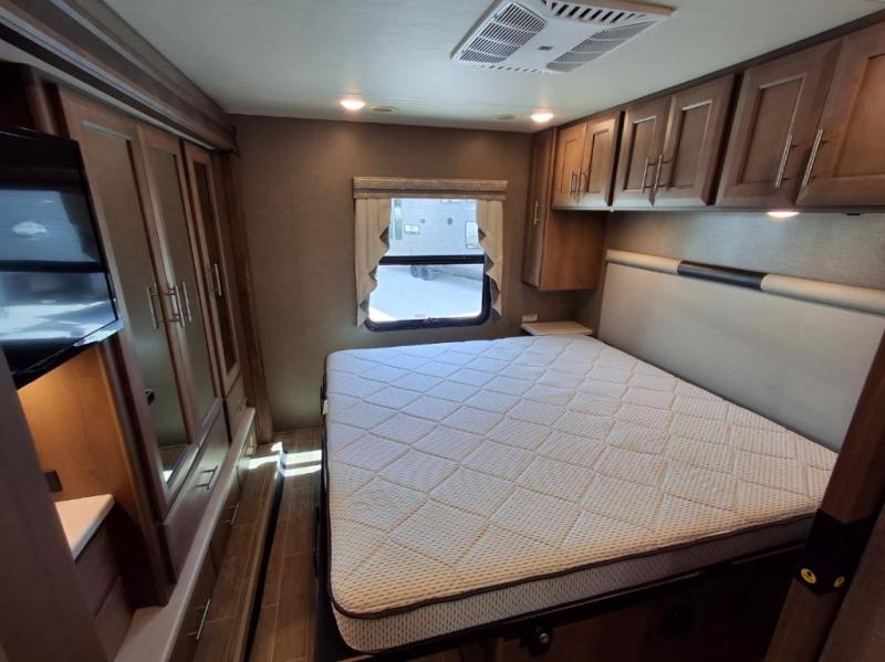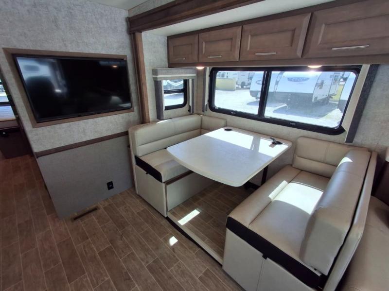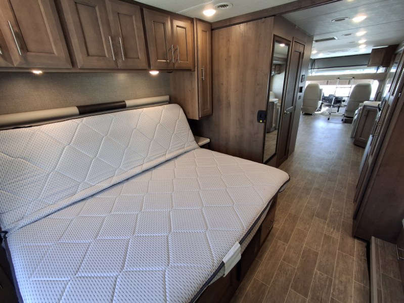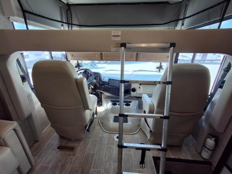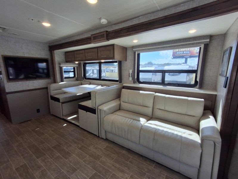 With any Miramar Class A gas motorhome by Thor Motor Coach you will find a durable welded tubular aluminum roof and sidewall cage construction, rotocast storage compartments, and frameless windows for a more sleek look. The 100-watt solar charging system with a power controller will allow you to do some off-grid camping, and you'll have an Onan RV QG 5500 gas generator on board for all your power needs. Each model includes the Rapid Camp+ multiplex wiring control system for quick and easy set up, and the Winegard ConnecT WiFi extender +4G will be perfect if you need to telecommute. Inside you'll find residential vinyl flooring, leatherette furniture, plus satin finish cabinetry with solid wood flat panel cabinet doors and nickel finish hardware for a truly luxurious coach!