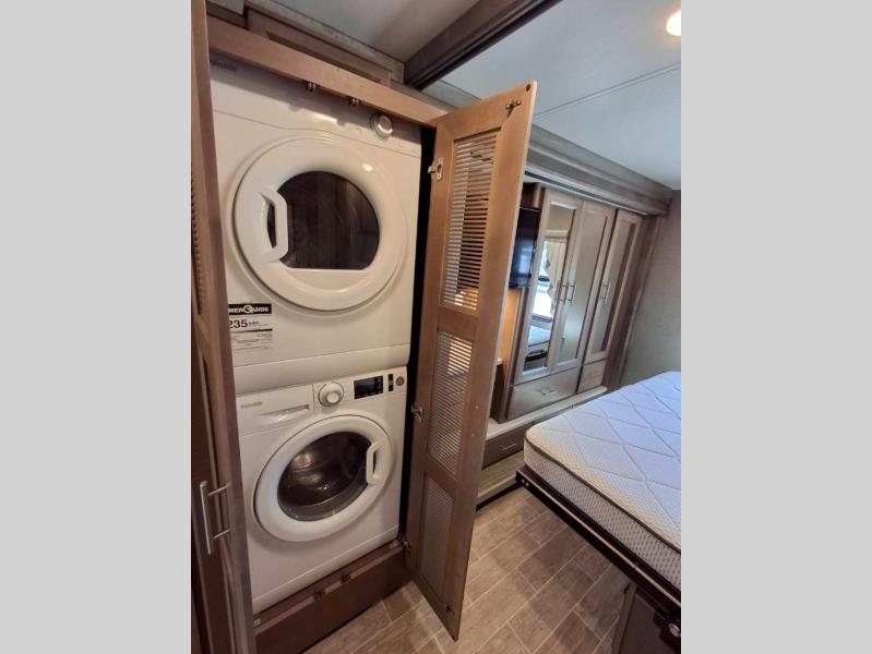 Make yourself at home in this double slide out coach! When you arrive at your destination, set up the the 20' power awning with LED lights and enjoy the 39" exterior TV. You can prepare lunch on the two burner single induction cooktop, or use the stainless steel convection microwave, and there is a Dream Dinette to dine at. You'll also find 67" theater seating across from the retractable 49" LED TV to watch your favorite shows. You're going to love the rear bedroom with its Tilt-A-View inclining king bed that will allow you to read a book in bed, plus there is a 32" TV and a closet to store your belongings. And this coach wouldn't be complete without stackable washer and dryer prep!