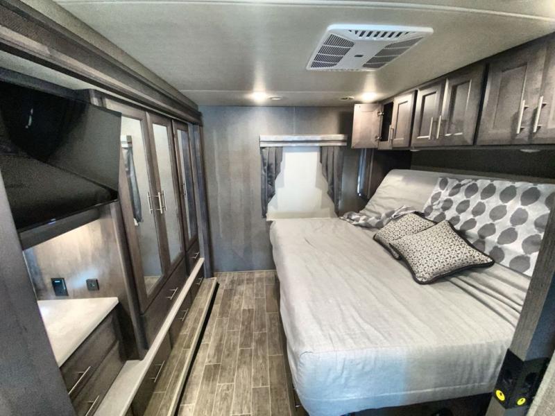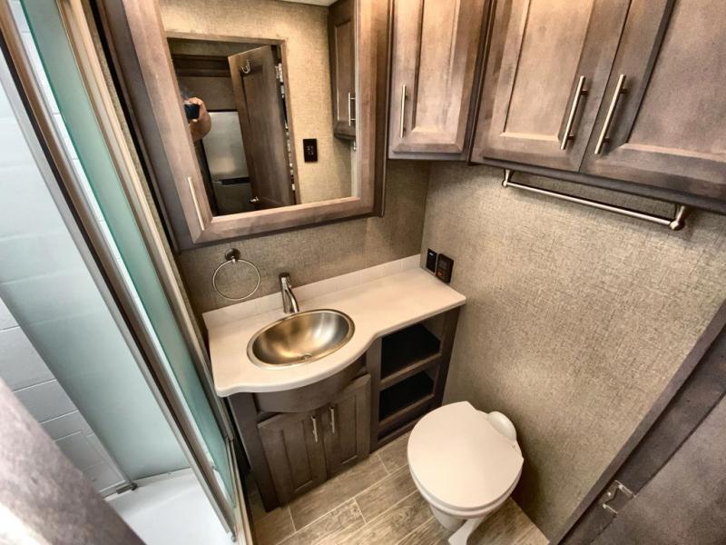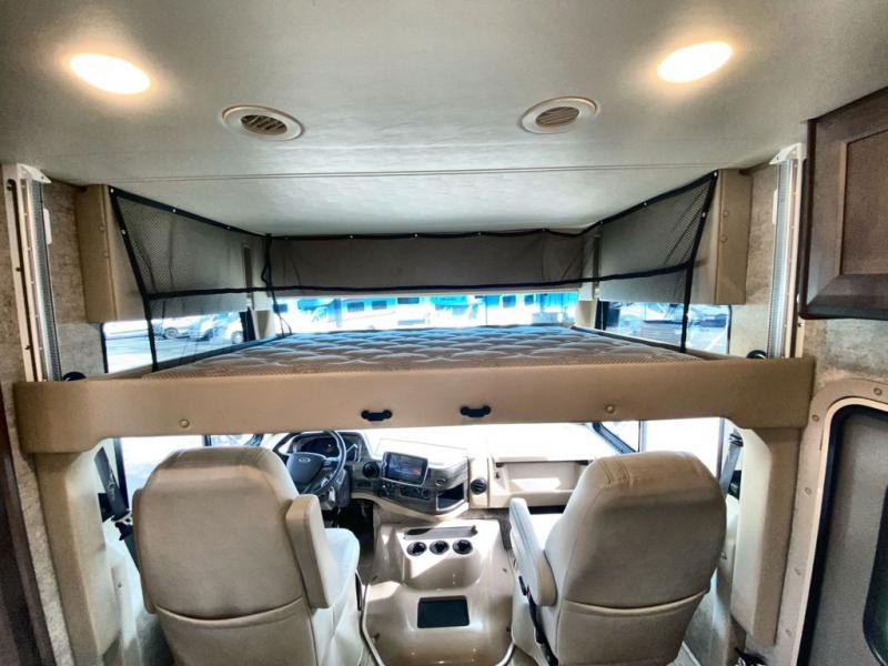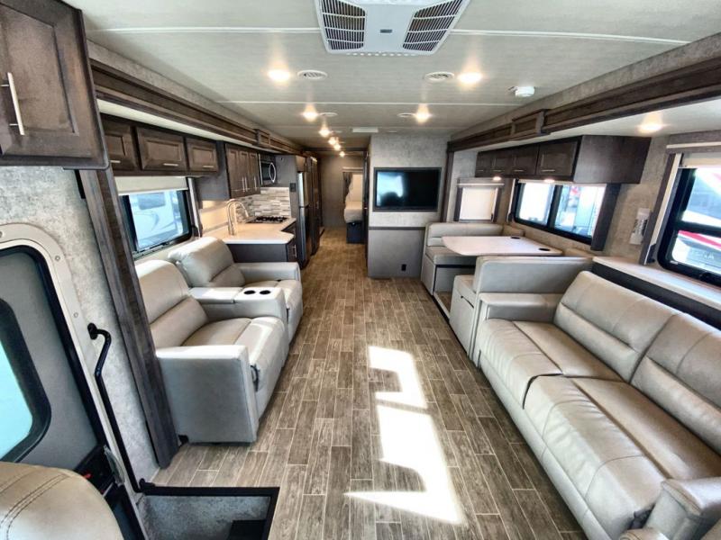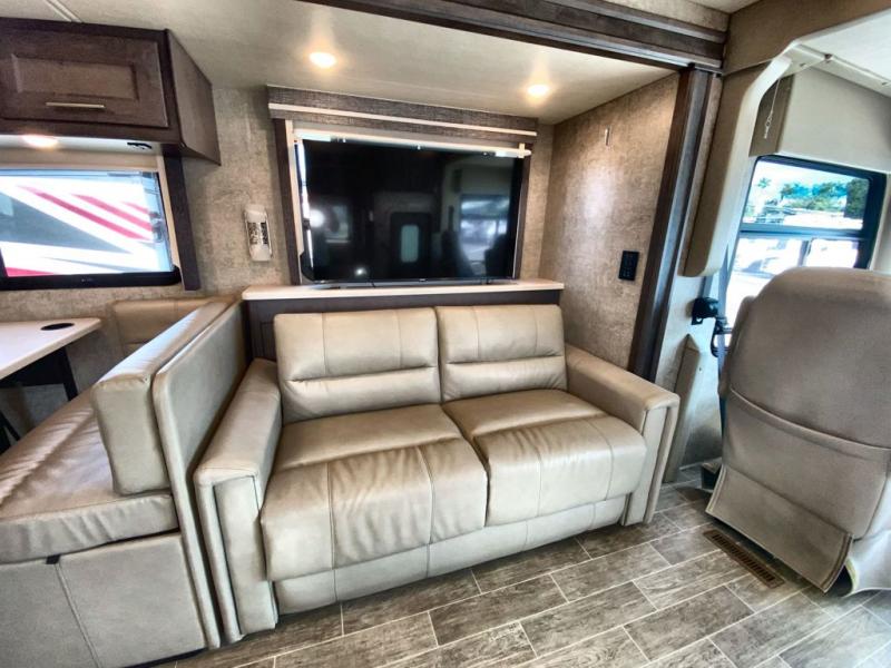 With any Miramar Class A gas motorhome by Thor Motor Coach you will find a durable welded tubular aluminum roof and sidewall cage construction, rotocast storage compartments, and frameless windows for a more sleek look. The 100-watt solar charging system with a power controller will allow you to do some off-grid camping, and you'll have an Onan RV QG 5500 gas generator on board for all your power needs. Each model includes the Rapid Camp+ multiplex wiring control system for quick and easy set up, and the Winegard ConnecT WiFi extender +4G will be perfect if you need to telecommute. Inside you'll find residential vinyl flooring, leatherette furniture, plus satin finish cabinetry with solid wood flat panel cabinet doors and nickel finish hardware for a truly luxurious coach!