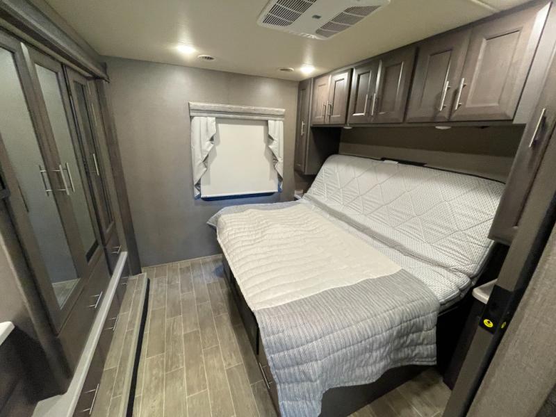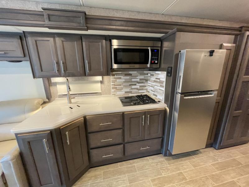 With any Miramar Class A gas motorhome by Thor Motor Coach you will find a durable welded tubular aluminum roof and sidewall cage construction, rotocast storage compartments, and frameless windows for a more sleek look. The 100-watt solar charging system with a power controller will allow you to do some off-grid camping, and you'll have an Onan RV QG 5500 gas generator on board for all your power needs. Each model includes the Rapid Camp+ multiplex wiring control system for quick and easy set up, and the Winegard ConnecT WiFi extender +4G will be perfect if you need to telecommute. Inside you'll find residential vinyl flooring, leatherette furniture, plus satin finish cabinetry with solid wood flat panel cabinet doors and nickel finish hardware for a truly luxurious coach!