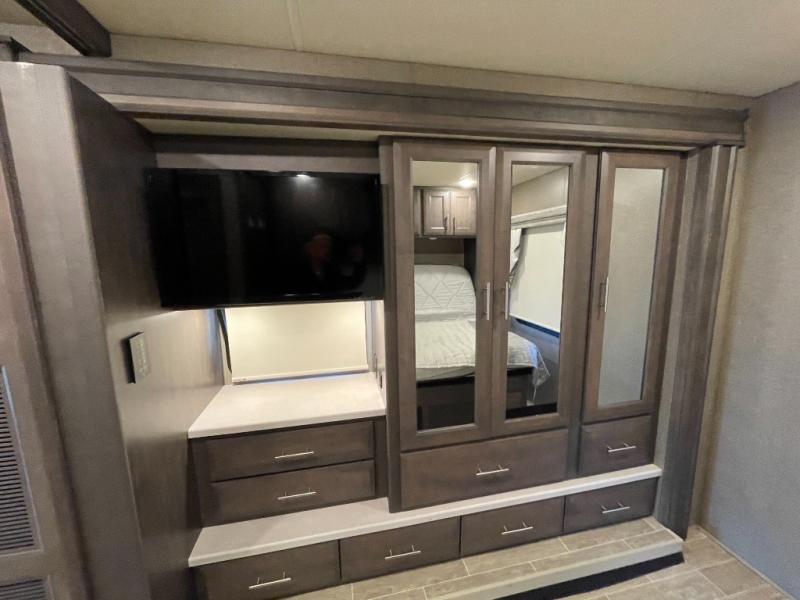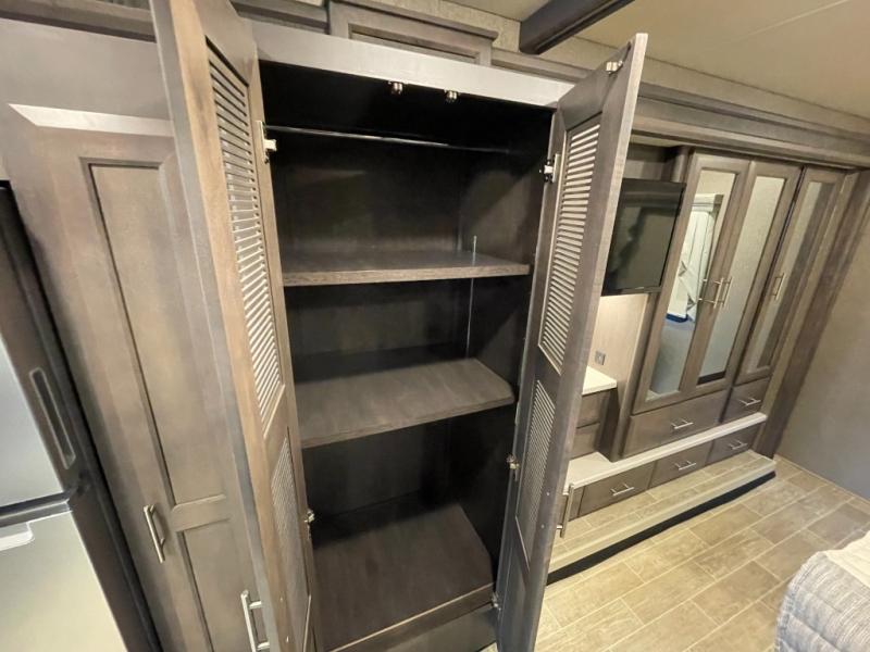 Make yourself at home in this double slide out coach! When you arrive at your destination, set up the the 20' power awning with LED lights and enjoy the 39" exterior TV. You can prepare lunch on the two burner single induction cooktop, or use the stainless steel convection microwave, and there is a Dream Dinette to dine at. You'll also find 67" theater seating across from the retractable 49" LED TV to watch your favorite shows. You're going to love the rear bedroom with its Tilt-A-View inclining king bed that will allow you to read a book in bed, plus there is a 32" TV and a closet to store your belongings. And this coach wouldn't be complete without stackable washer and dryer prep!