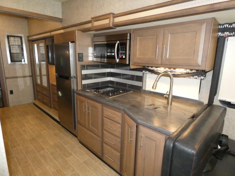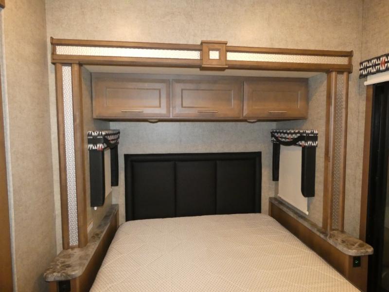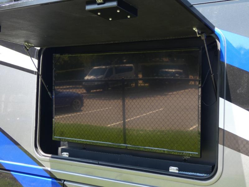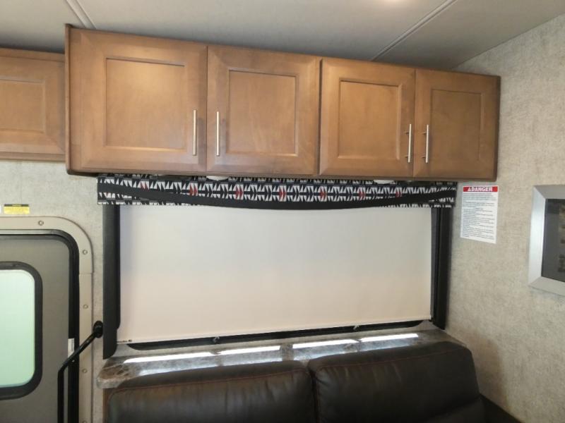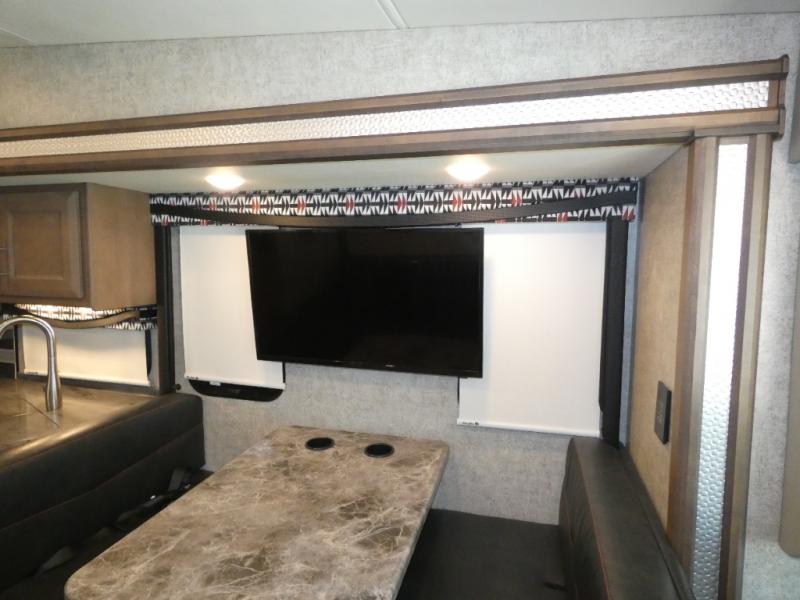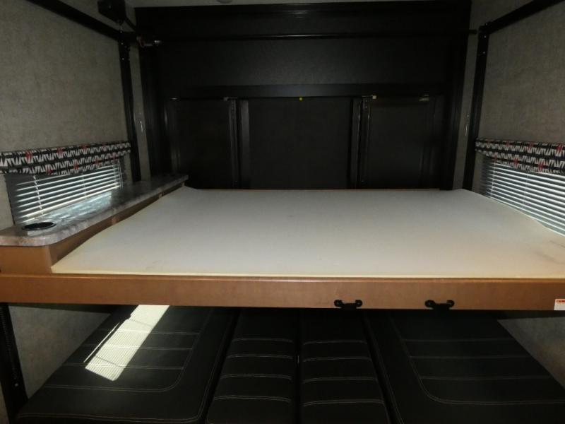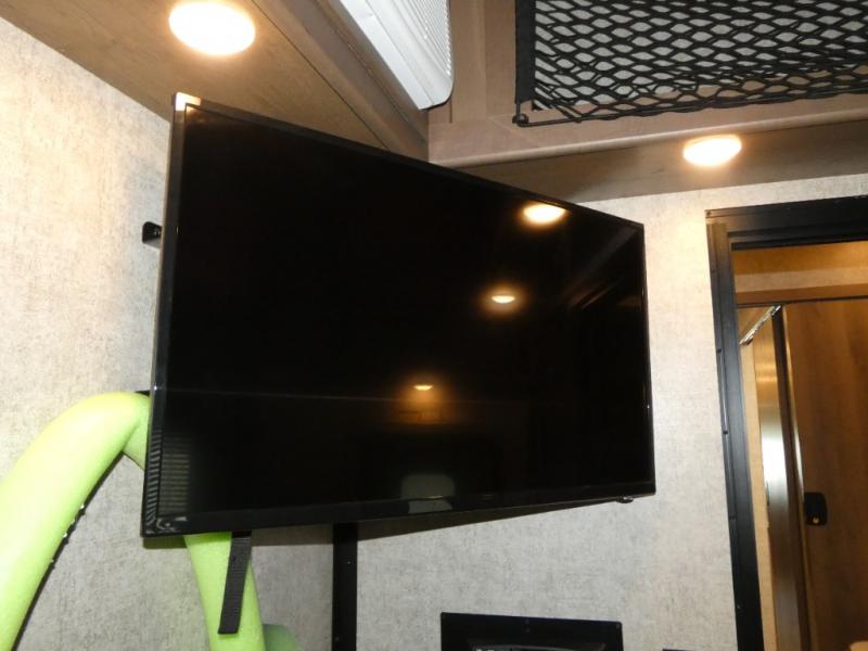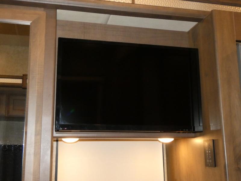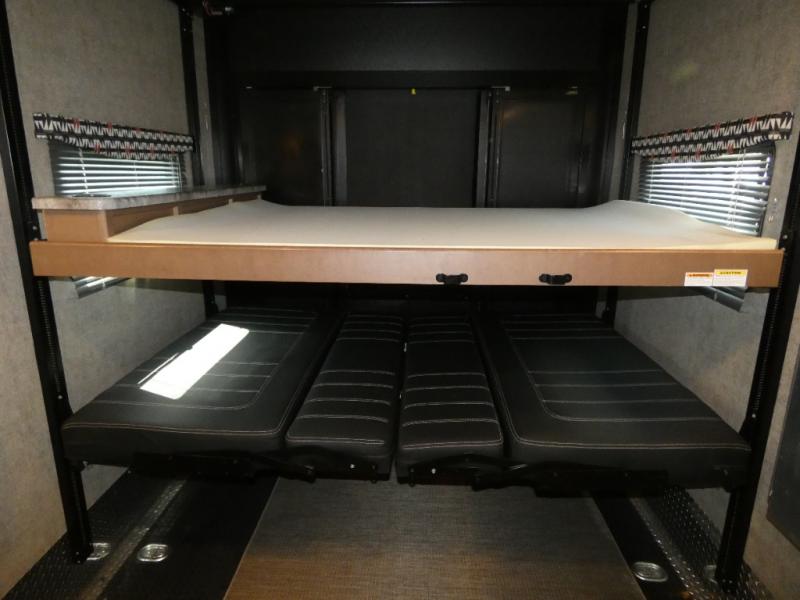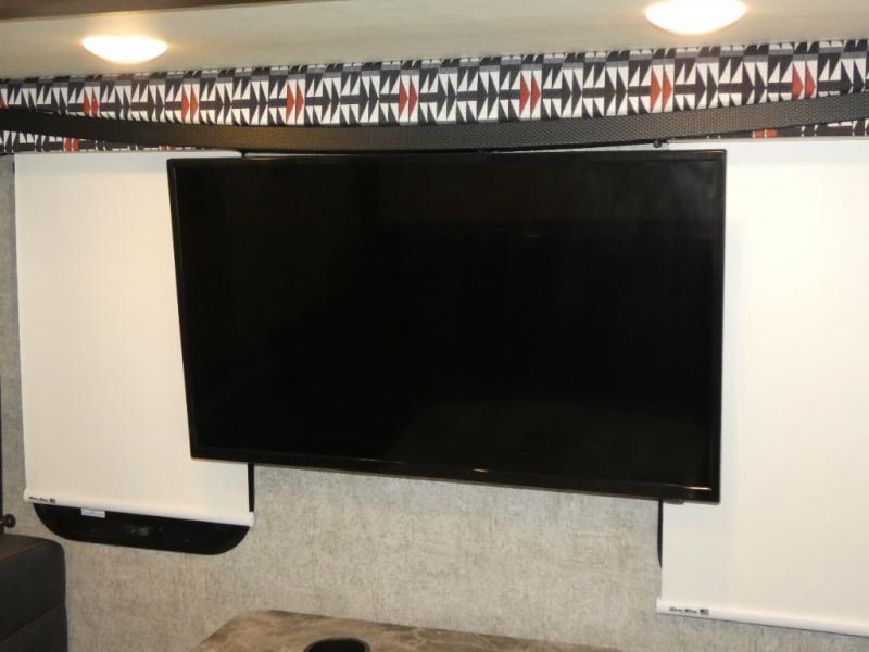 Load up the side-by-side and invite your friends along for the trip in this spacious toy hauler coach. Your guests can make the 8 x 10' 2" garage their bedroom at night since there is a queen-size drop-down overhead bunk here and their own 39" LED TV. During the day you can set up the patio deck that includes three seasons patio doors with a screen and privacy panels. You'll find the main living area cozy with its Dream dinette and sofa bed, plus there is a 39" LED TV here. The chef can prepare dinner on the two burner gas cooktop, or use the stainless steel convection microwave, and check out the residential refrigerator for all your perishables. The queen bed slide out in the private bedroom will provide a great night's rest, and you'll enjoy your own 32" LED and a wardrobe for your clothes. This model also includes a 39" LED exterior TV, that makes four TV's for all your entertainment needs!