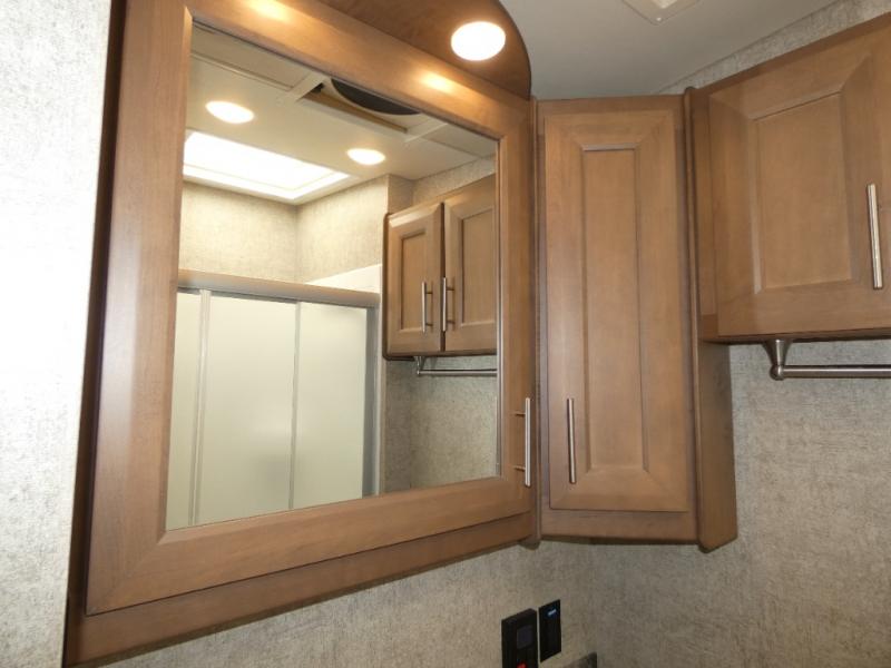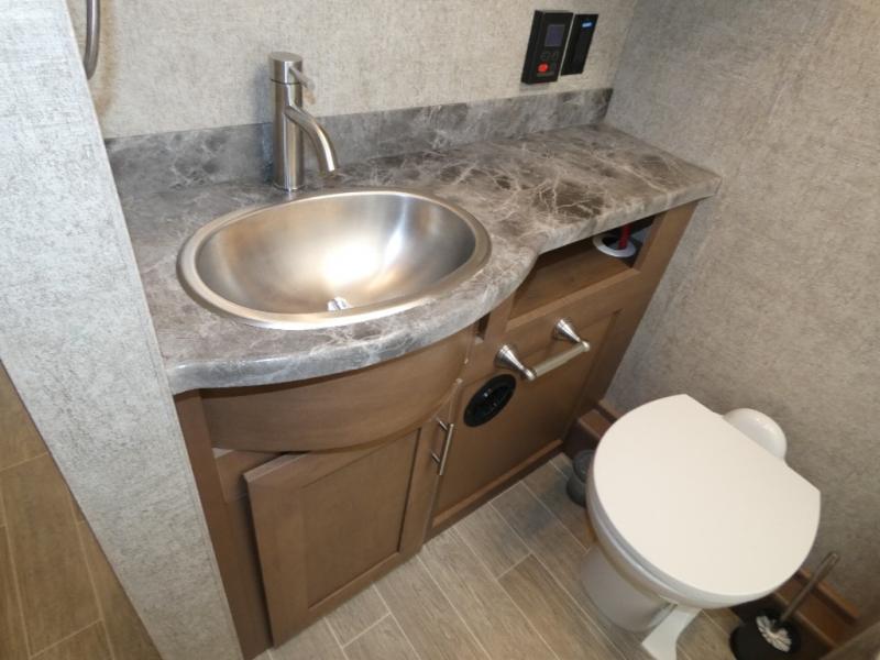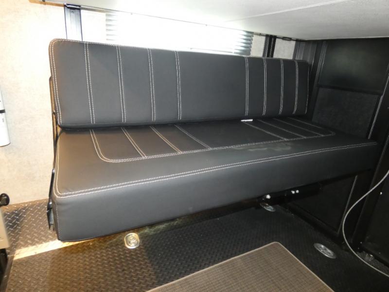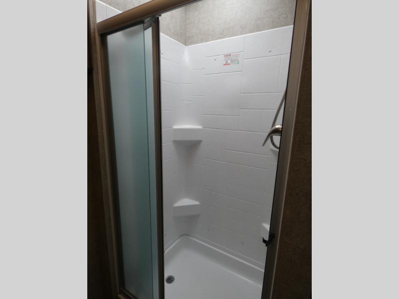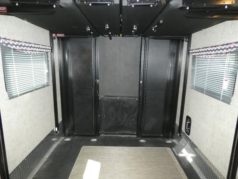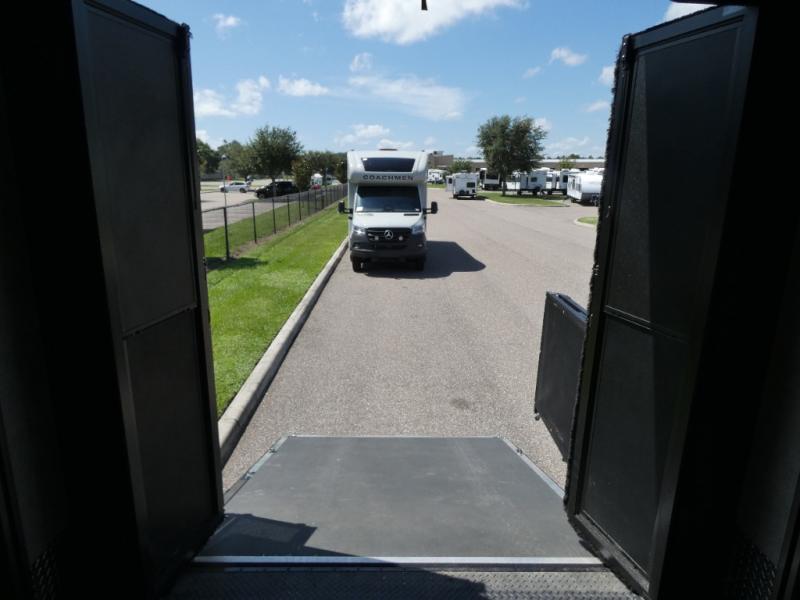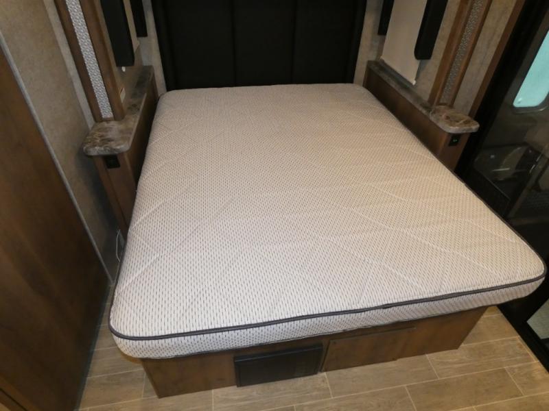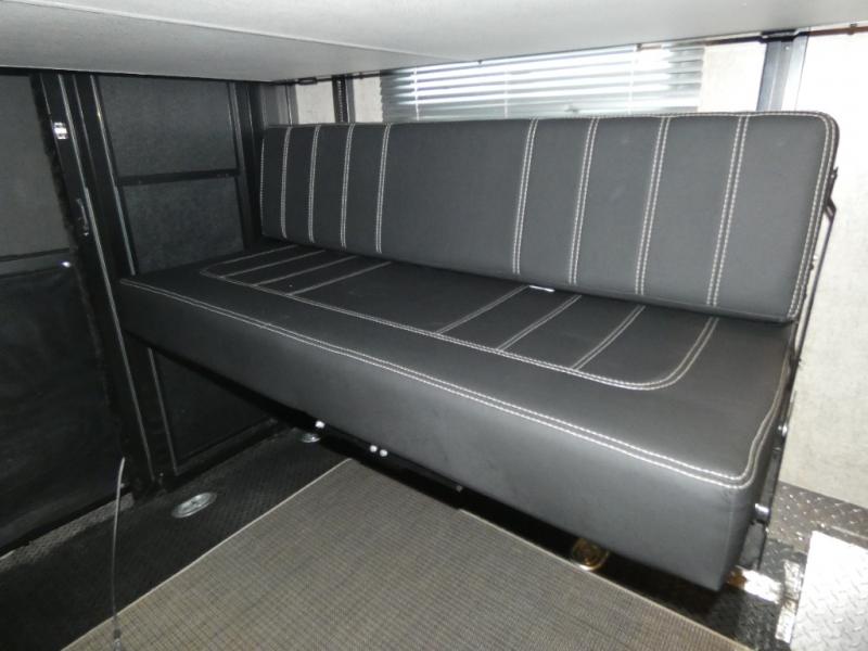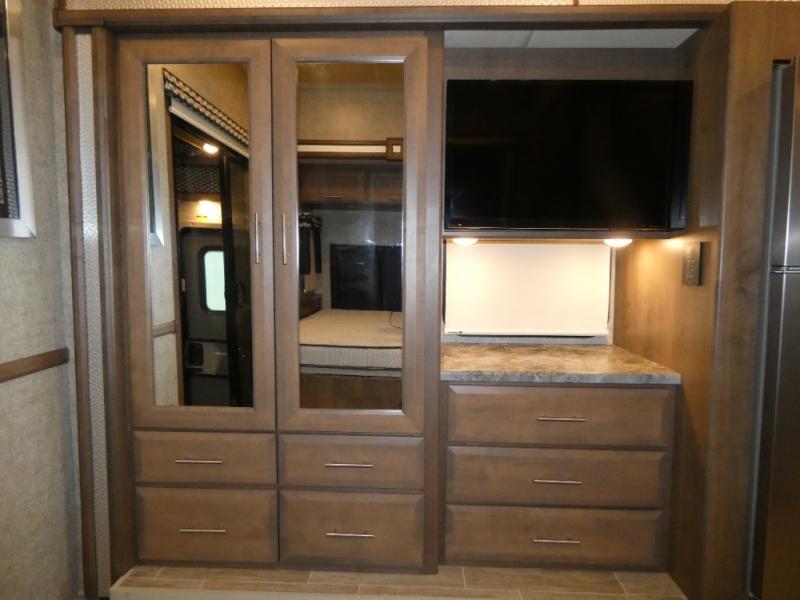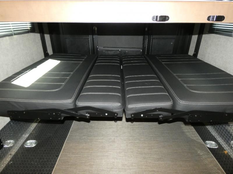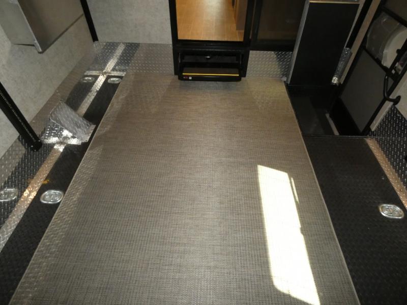 Load up the side-by-side and invite your friends along for the trip in this spacious toy hauler coach. Your guests can make the 8 x 10' 2" garage their bedroom at night since there is a queen-size drop-down overhead bunk here and their own 39" LED TV. During the day you can set up the patio deck that includes three seasons patio doors with a screen and privacy panels. You'll find the main living area cozy with its Dream dinette and sofa bed, plus there is a 39" LED TV here. The chef can prepare dinner on the two burner gas cooktop, or use the stainless steel convection microwave, and check out the residential refrigerator for all your perishables. The queen bed slide out in the private bedroom will provide a great night's rest, and you'll enjoy your own 32" LED and a wardrobe for your clothes. This model also includes a 39" LED exterior TV, that makes four TV's for all your entertainment needs!