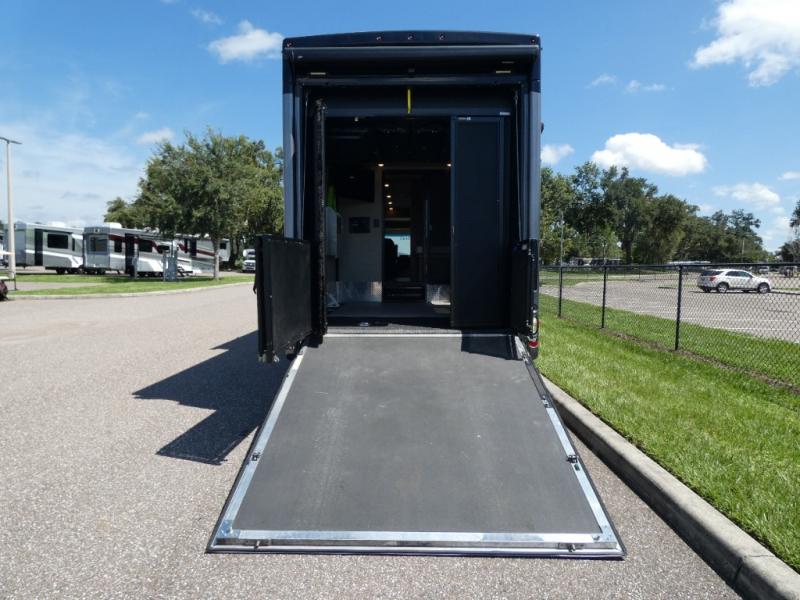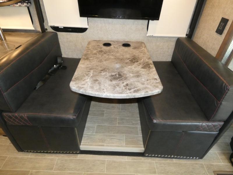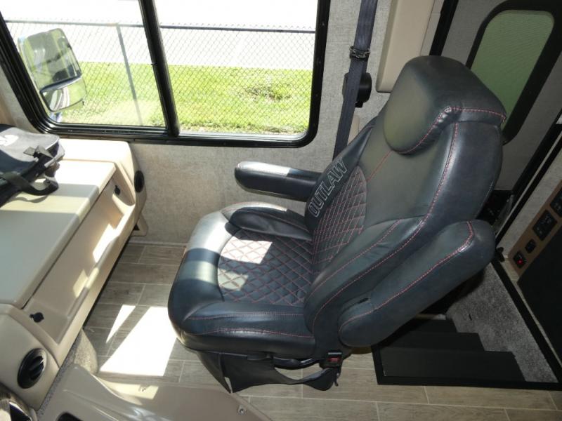 With any Outlaw Class A gas motorhome toy hauler you will appreciate the garage Drop-Down Zero-G ramp door with a snap-in patio system and a power awning. The remote fuel filling station with an auxiliary fuel tank, pump and a nozzle will allow you to keep your toys ready for adventure, and there is a Pet-Link multi-purpose tie-down if you've brought your furry friends along. Each model is constructed with Vacu-Bond laminated roof, walls and floor with block foam insulation, a full-body paint package with gel coated sidewalls, and a premium one-piece TPO roof for durability. The interior will have you feeling at home with leatherette furniture, solid surface kitchen countertops, satin finish cabinetry, plus a glass shower door for added luxury. All of your power needs will be met with an Onan RV QG 5500 gas generator, four auxiliary house batteries, plus a 100-watt solar charging system with a power controller. Choose an Outlaw Class A gas toy hauler coach and you'll never look back!