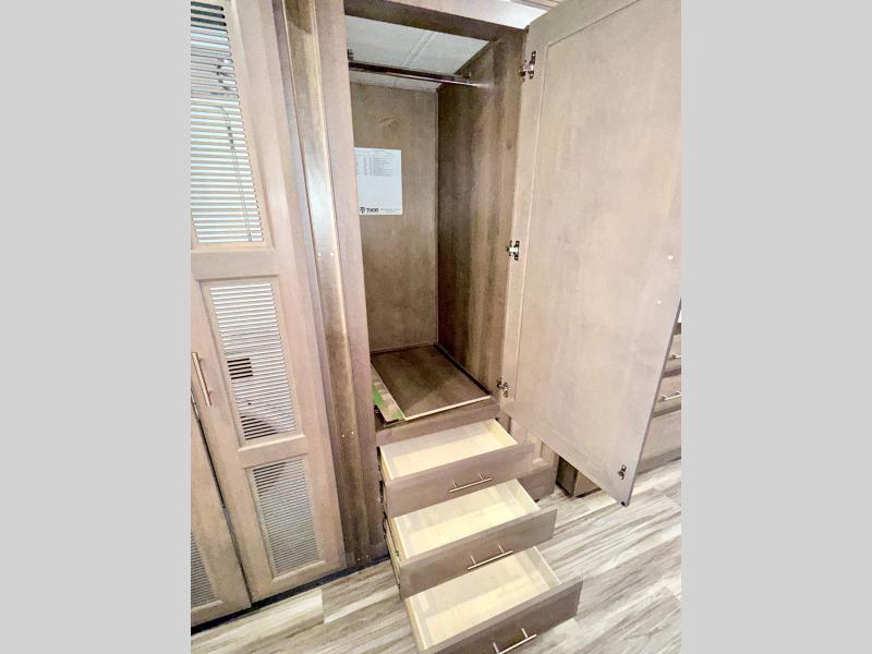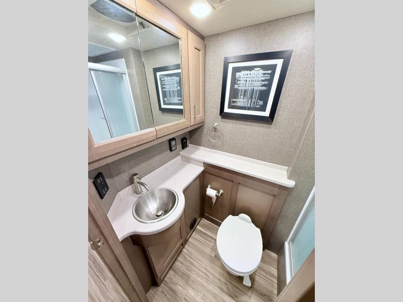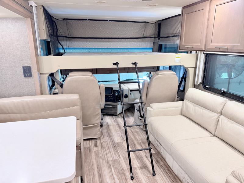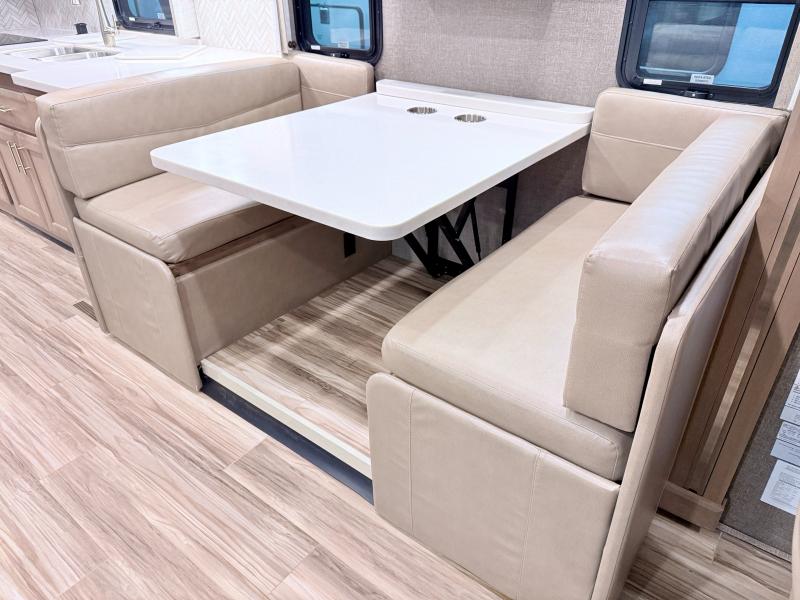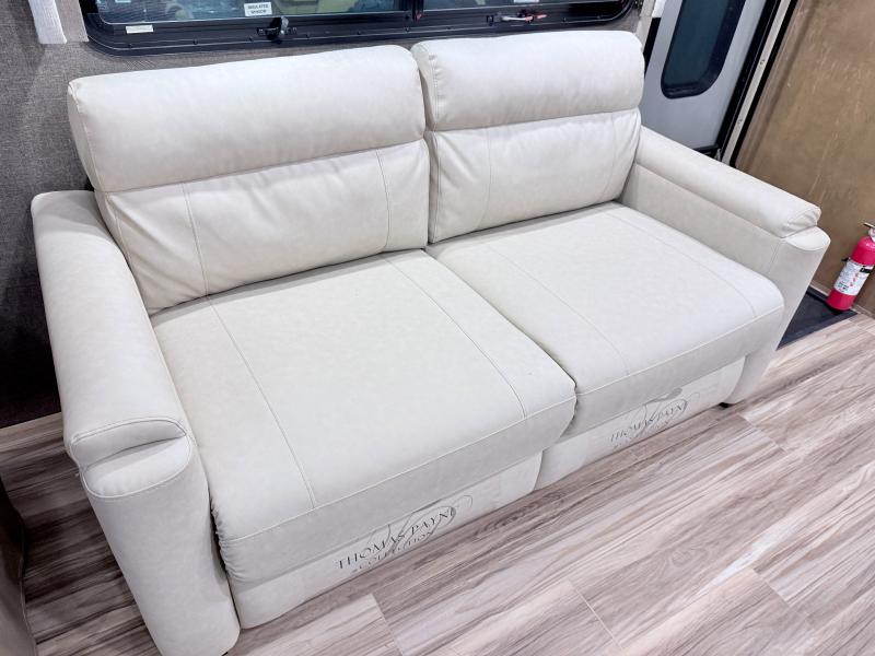 Each journey you take with a Palazzo Class A diesel motorhome by Thor Motor Coach is made smooth thanks to the Air-Ride suspension, the Sachs shock absorbers, and the Atlas foundation. You'll enjoy hassle-free set up thanks to the Rapid Camp + multiplex wiring control system, and there is a Winegard ConnecT 2.0 WiFi/4G/TV antenna to keep you connected to the outside world as you're away from home. The exterior of the Palazzo features lighted storage compartments and a basement pass-through, a 40" LED TV, and invisible front paint protection to withstand the elements. You will fall in love with the interior that includes Studio Collection cabinetry, luxury vinyl tile flooring, leatherette furniture, solid surface countertops, plus many more comforts!