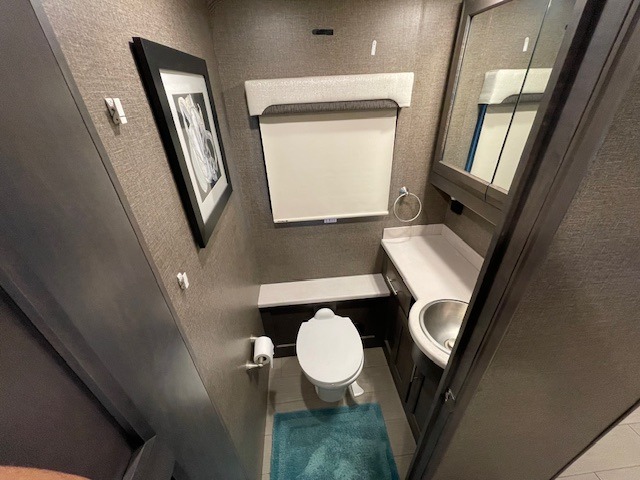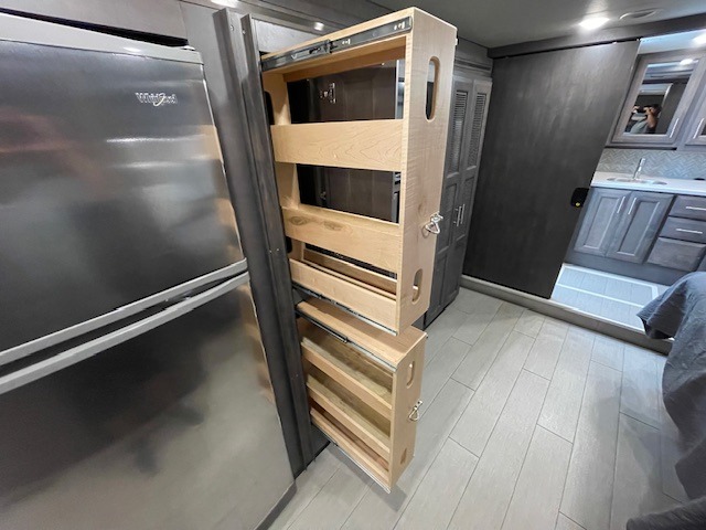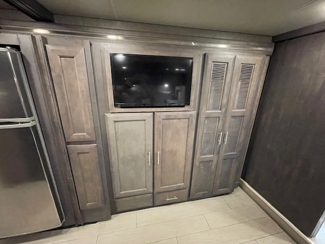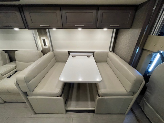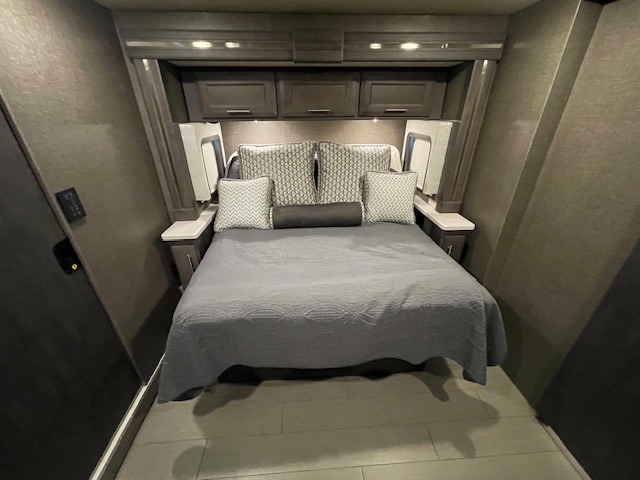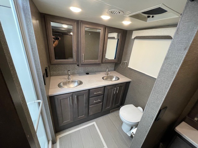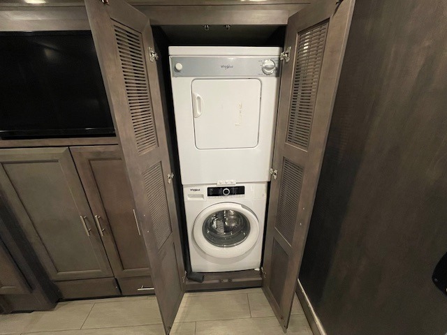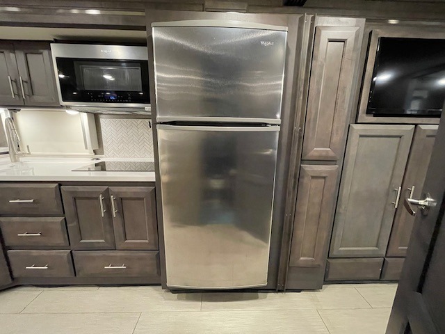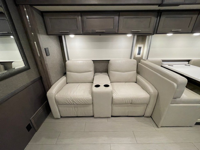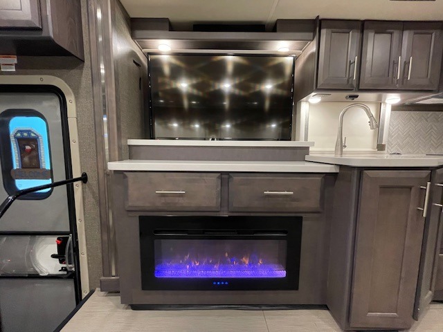 What could be better than traveling with a larger group and having a bath and a half on board for convenience? You'll enjoy that and more in this triple slide out coach. After you've set up camp and unloaded your gear, take a load off on the inclining theater seats that sit directly across from the 49" TV and fireplace. The kids may want to play a game at the Dream Dinette, or just climb in the overhead bunk for a rest. The fully-equipped kitchen includes a convection microwave, an electric induction cooktop, a residential refrigerator, plus a 12-volt attic fan to keep the coach fresh. You're going to love the master bedroom with its queen bed slide out, 32" TV, and stacked washer and dryer, plus there are dual bath sinks in the full rear bath so you can brush your teeth at the same time!