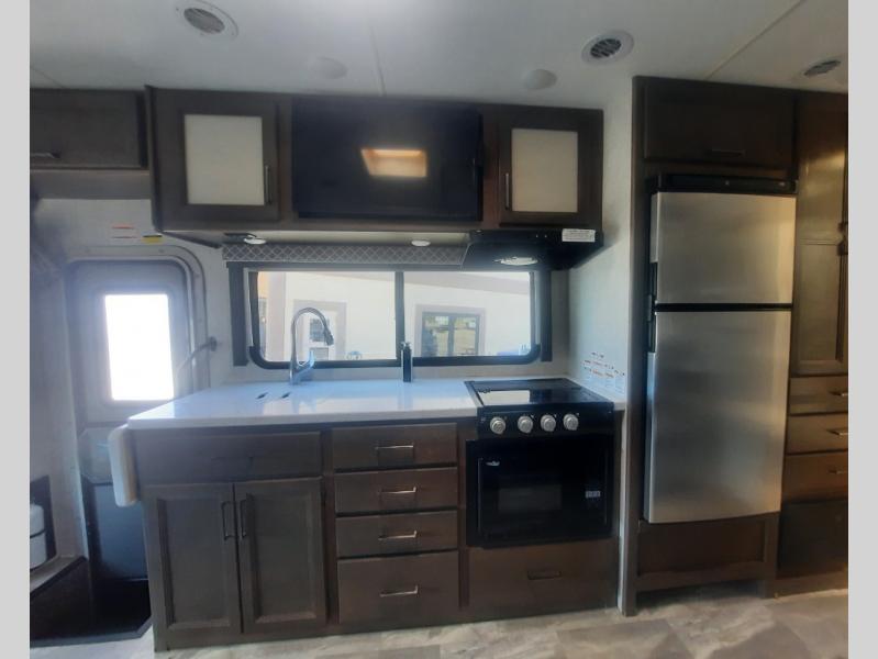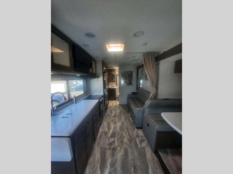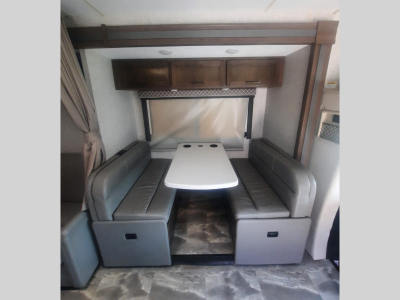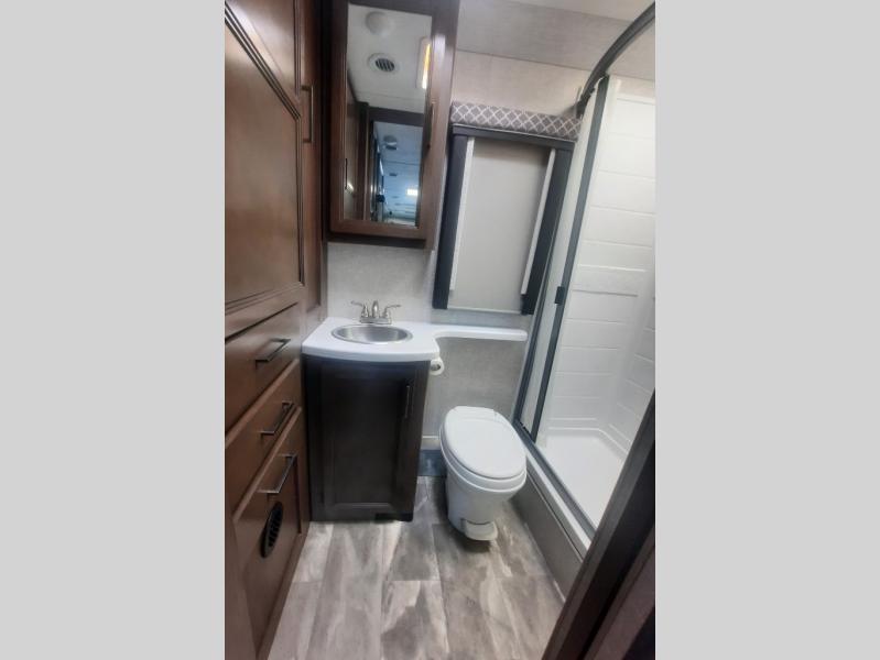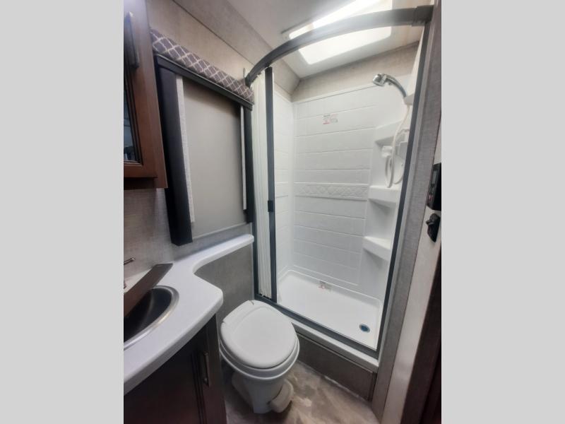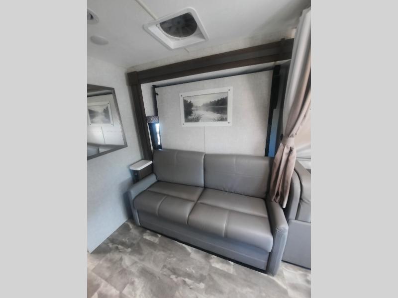 You will never get tired of traveling the country in this comfortable motorhome that can sleep four to five people each night. Your guests will love the cab-over bunk that includes a built-in skylight perfect for stargazing at night, and there is additional sleeping space on the Dream Dinette. You and your spouse will enjoy the Murphy bed all to yourselves, and in the morning you can relax on the 67" sofa once the bed is put away. The upgraded recessed three burner gas cooktop and convection microwave allow you to prepare home-cooked meals each day, and there is a convenient pop-up countertop outlet and charging center to charge up while breakfast is cooking. After a day outdoors, you can clean up in the full bath, complete with a shower skylight, a stainless steel sink, and a large closet for fresh towels.