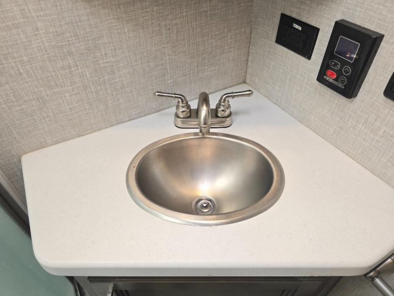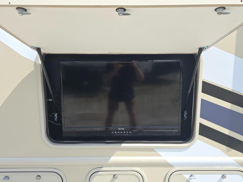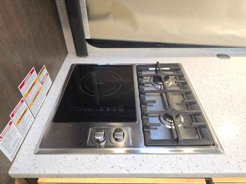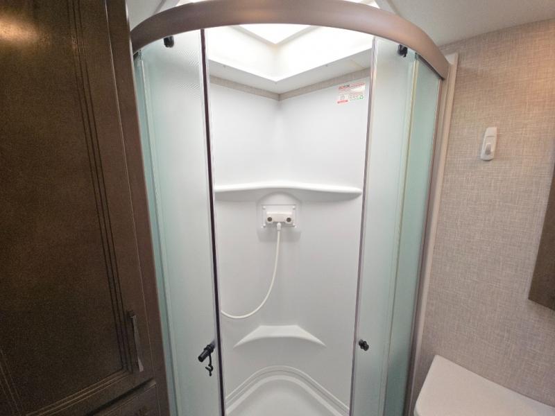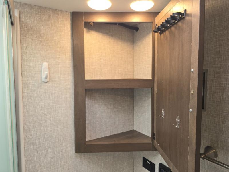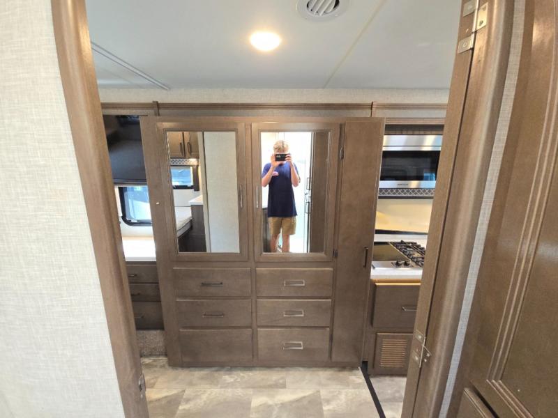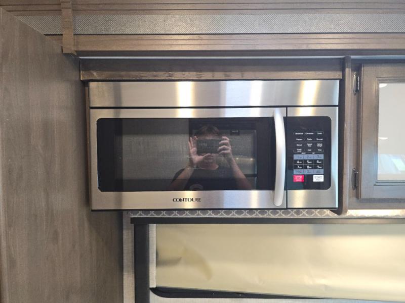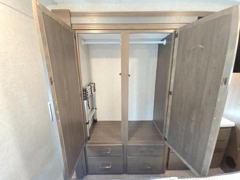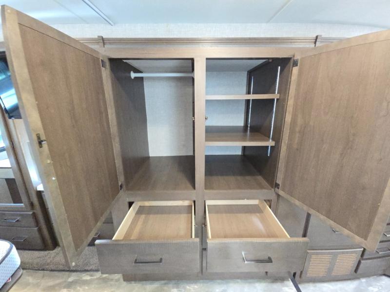 Deciding to go full-time in an RV is made easy with this coach! From the full-wall slide out offering plenty of space in the main living and kitchen area up front and all the way back to the rear private bedroom, you will not have to squeeze in to get to any space. The cab over bunk offers sleeping accommodations for the kids or grandkids as well as the furniture once prepare for bedtime, and you will sleep like a queen on your own bed. There is a full bathroom with a radius shower, plenty of closets for your clothing, and the kitchen offers a two-burner cooktop and single induction cooktop along with a convection microwave and double door refrigerator to be able to make any meal. And when you want to watch your show, there are two TVs inside and an exterior 32" TV to enjoy while relaxing under the power awning.