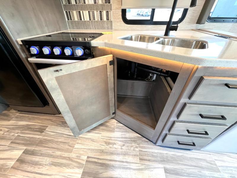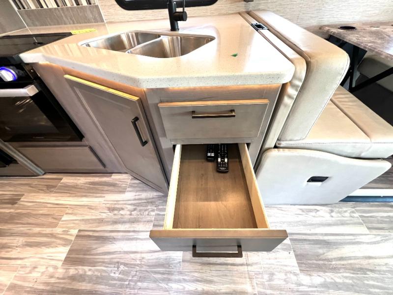 Load up your bags and pack up the family for fun trips across the states in this double slide out coach! Your crew can relax under the power awning when you get to the campsite, and there is an exterior kitchen and an exterior TV for the ultimate outdoor living space. If the weather is raining on your parade, just head inside to relax on the jack-knife sofa or play a game at the Dream Dinette! There is a 39" LED TV here to watch a show, and the little ones can take a rest on the drop-down overhead bunk. Once you've worked up an appetite, prepare a meal on the three burner cooktop, or use the microwave oven. You'll also find a double door refrigerator here and a pantry for snacks and canned goods. And don't overlook the rear private bedroom with a king bed slide out, a spacious closet and a dresser, plus a 32" bedroom TV for movies in bed!