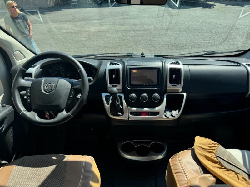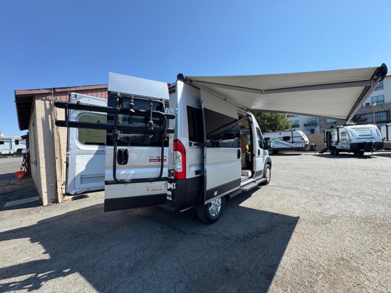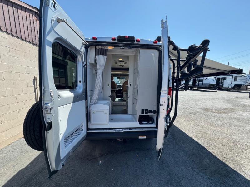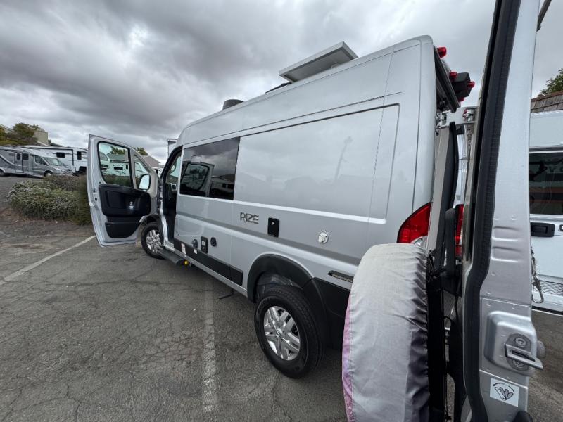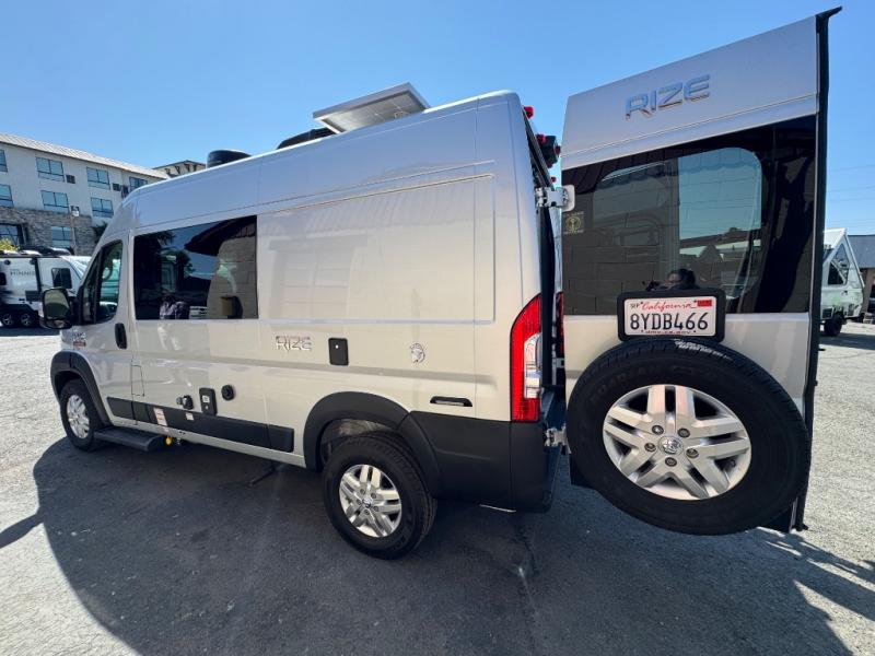 The Rize Class B gas motorhome by Thor Motor Coach allows you to experience the camping lifestyle in a compact RV packed with convenient features. There is a 3.6L Pentastar V6 engine and 280HP to power your excursions, and the outdoor enthusiast will love the 190W solar panel and solar charge controller. Each model includes residential vinyl flooring, TechnoForm Euro-style upper cabinet doors, and premium window privacy shades. You'll find pressed countertops in the kitchen and a glass protective cover and task lighting above the cooktop to easily cook meals each day. The keyless entry system adds to the convenience found throughout these models, plus there is an exterior LP connection if you want to hook up your own grill and a rear water sprayer to wash off your hiking boots.