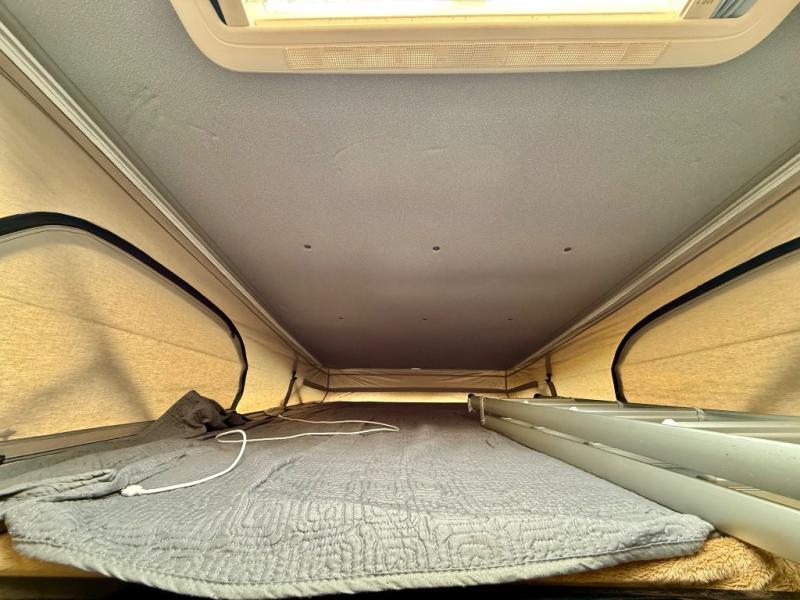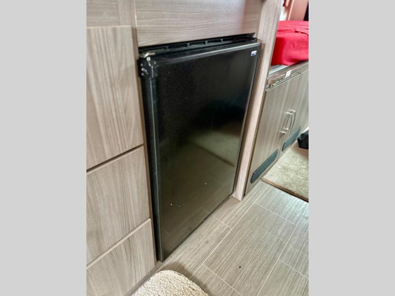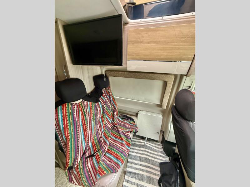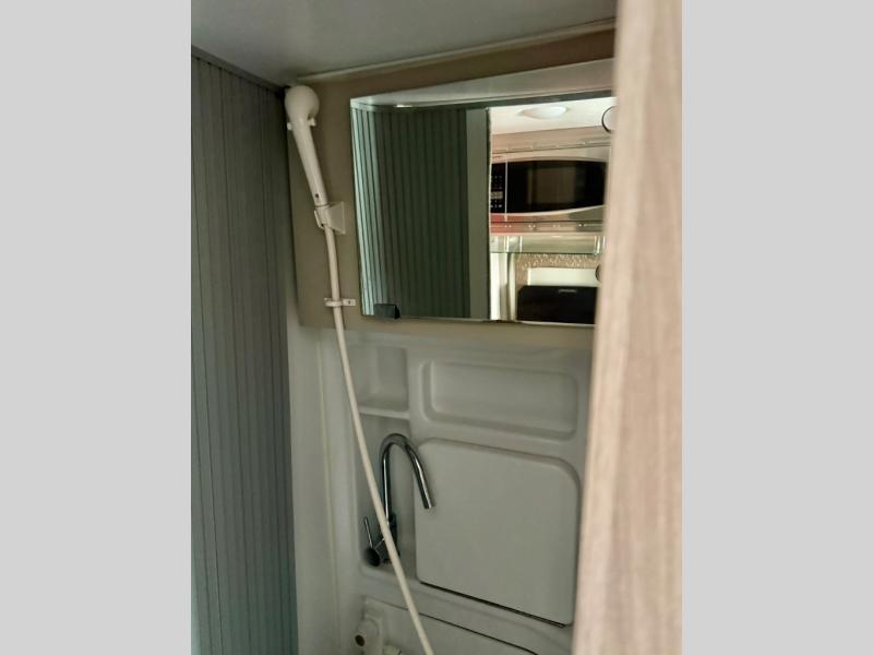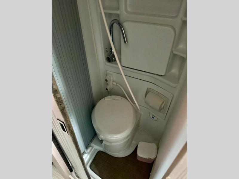 Start traveling the right way with this motorhome! It features a rear 72" x 66" pull out bed with under bed storage for extra blankets or other necessities, plus there are large opening side windows at the head and foot of the bed to let in more natural lighting and fresh air. Freshen up each morning in the manual enclosed wet bath with a cassette toilet and a closet next to it to store your towels. Once you have prepared your best home cooked meal with the gas two burner cooktop, you can head to the collapsible dinette table to enjoy them there comfortably and then watch your favorite movie on the 24" TV!