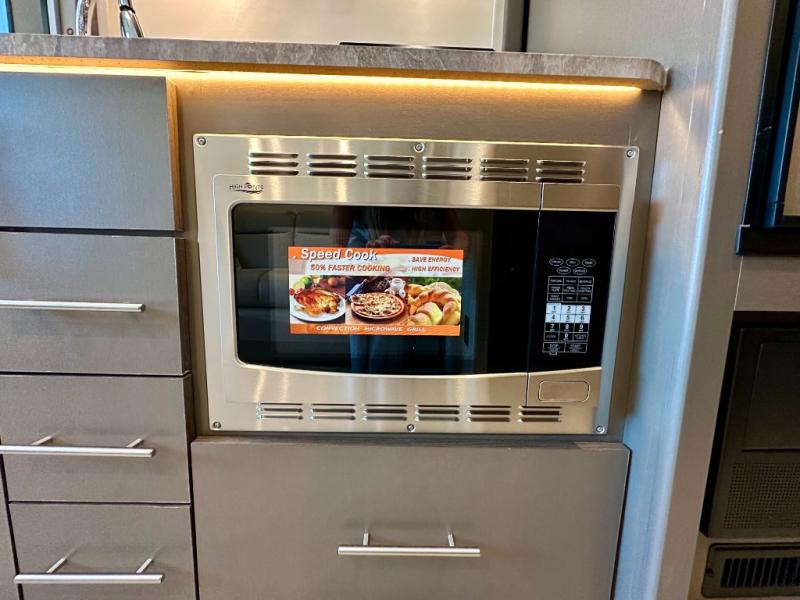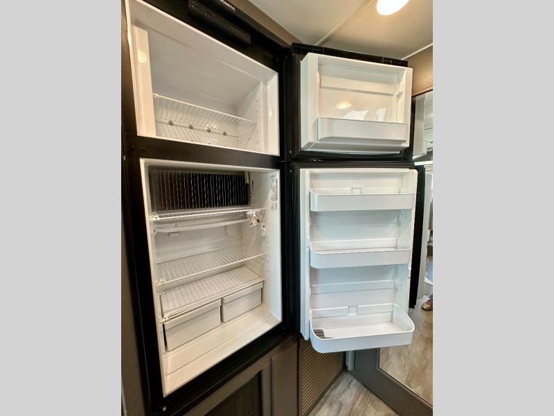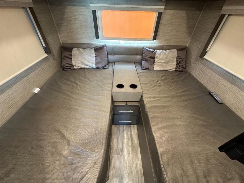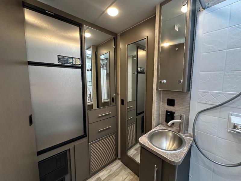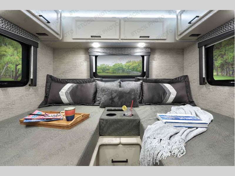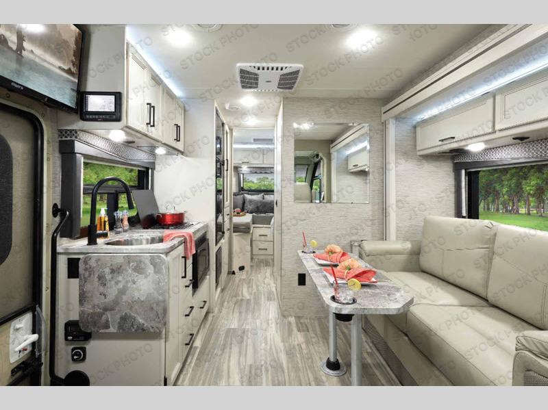 The front cab of this Vegas Class A gas motorhome is excellently appointed with a stow-away coffee table, reclining/swivel leatherette captain's chairs, a living area speaker tied to the dash radio, and a 10" touchscreen dash radio with Bluetooth, Android Auto, and Apple CarPlay! A single slide holds the 68" sofa bed so that it isn't in your way as you walk back to the semi-private bedroom. The kitchen offers you a flip-up countertop for more room to chop veggies, and there are two TVs to provide you with all the entertainment you could need.