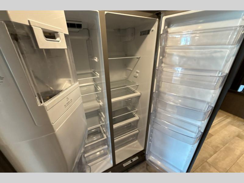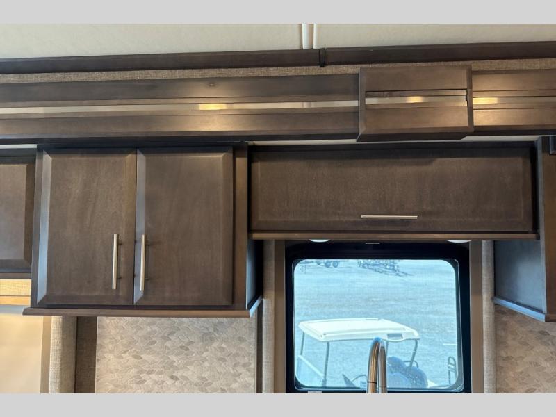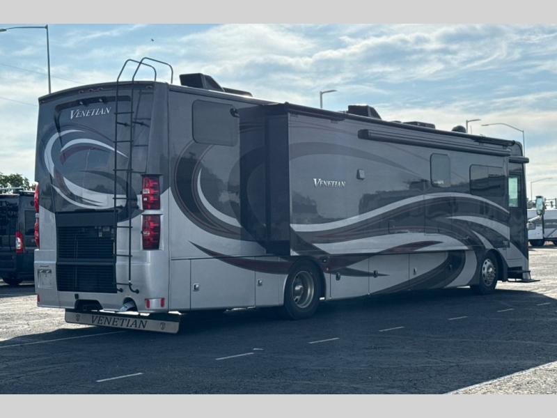 This Venetian Class A diesel motorhome is amazingly convenient and classy! You have lots of amenities packed into one exceptional coach. There is a full and half bathroom, and the full bathroom is combined with the bedroom to create a comfortable master suite. The bathroom also contains a dual-sink vanity, a magazine rack, and a 50" x 30" shower with seat. The bedroom has an inclining king bed across from the 32" LED HDTV for easy viewing, and the half bathroom also contains a magazine rack. The living area offers you a 66" jackknife sofa bed to rest on as well as 68" reclining theater seating. You will appreciate the pull-out cabinet in the kitchen, and the residential refrigerator will give you plenty of food storage.