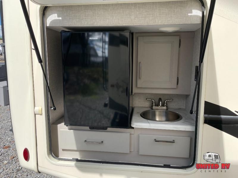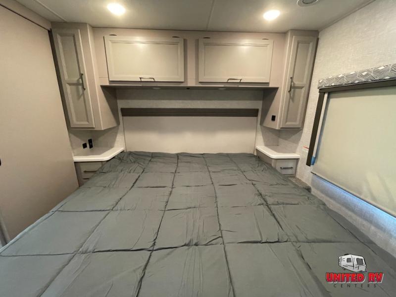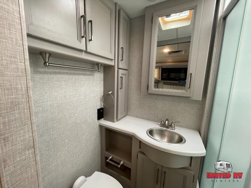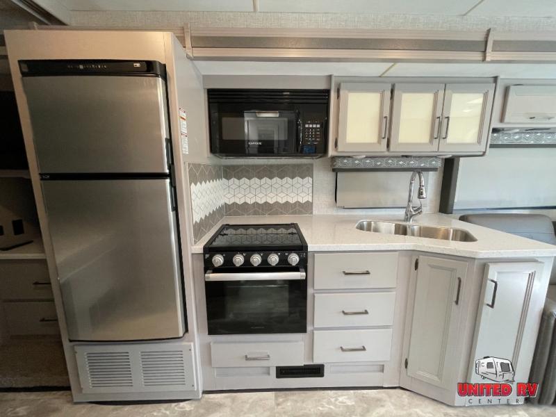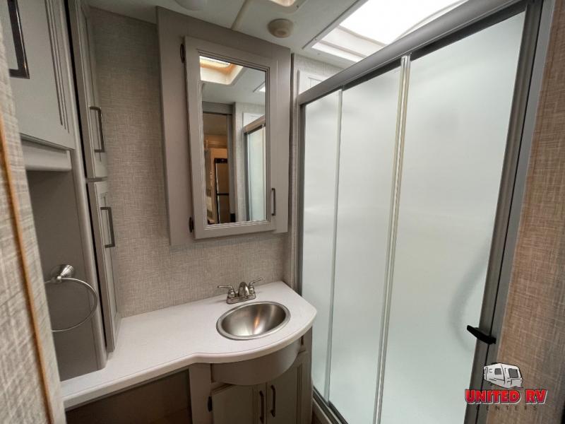 This Windsport Class A gas motorhome is going to be an amazing way to vacation! You will be living in luxury back in the private bedroom because of the RV king bed and 32" LED TV, and you have exceptional convenience with the exterior 32" TV and exterior kitchen when relaxing outside. Now you can have a movie night out under the stars with the snacks being prepared right there with you. Back inside, you'll appreciate having a 68" jack-knife sofa to relax on, a three-burner stove to cook on, and a coffee table between the cab seats to set your drinks on. The bathroom contains a 24" x 36" shower with a skylight to help you stay fresh, and there is a glass door included in the shower.