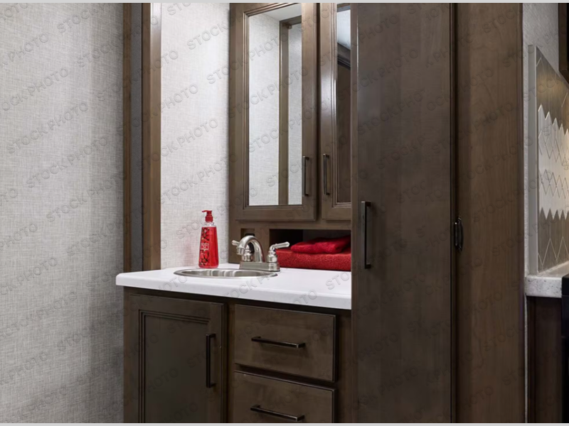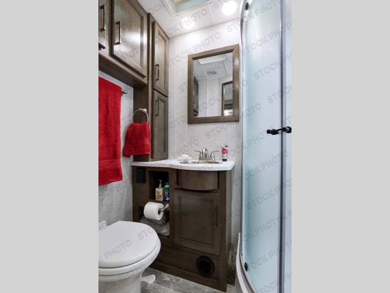 Have a luxurious week of vacation in this Windsport Class A gas motorhome! The bedroom is full of residential comfort with its RV king bed, 32" LED TV, and walk-in closet. The closet has also been prepped for a stackable washer/dryer. Another good place to sleep at night is the 54" x 74" drop-down overhead bunk, and additionally you have a 70" Dream Dinette and 68" sofa bed that can turn into beds when you aren't using them for other purposes. As soon as you enter this coach you will notice a broom closet to your left, and next to that closet is the residential refrigerator. The bathroom is fully equipped with a 32" x 32" radius shower, skylight, toilet, and vanity, and you will find a second vanity outside the bathroom which serves as a "getting ready" area.
