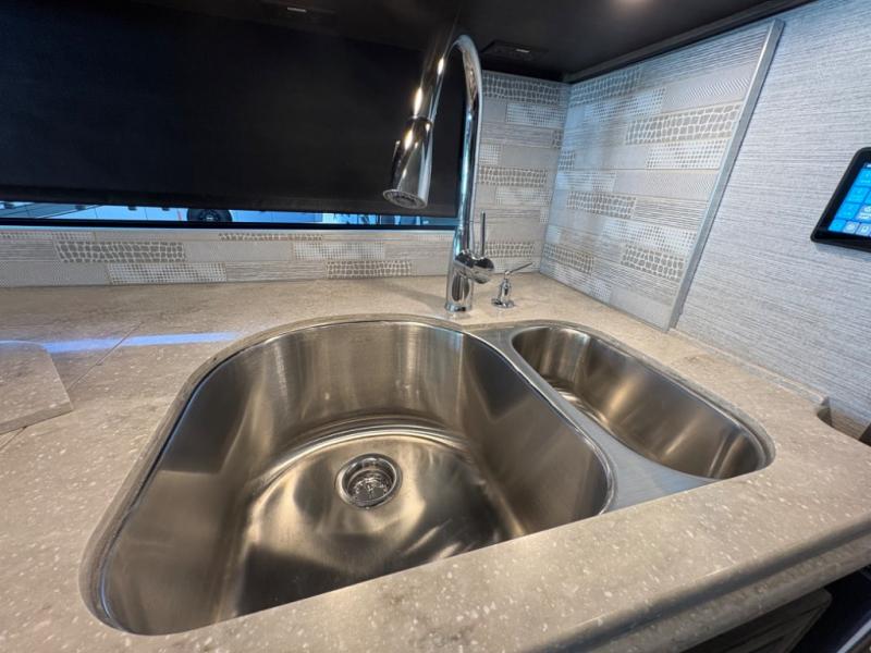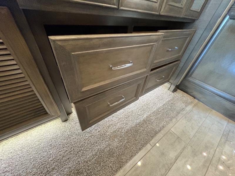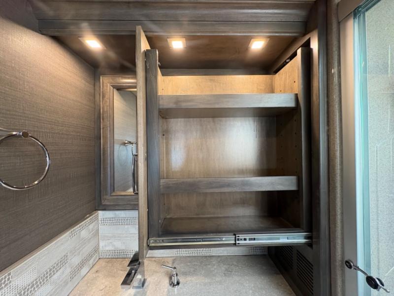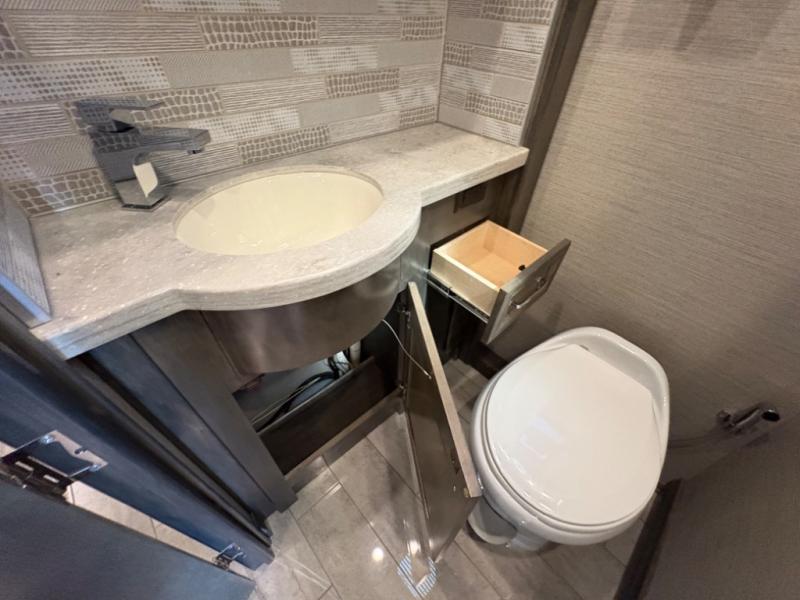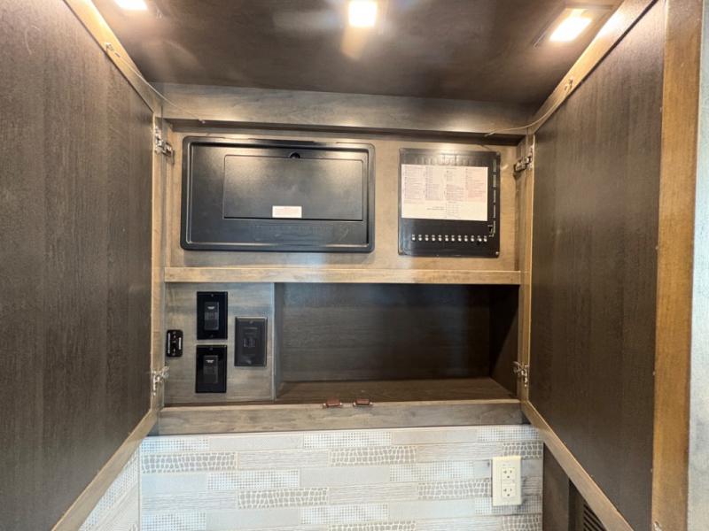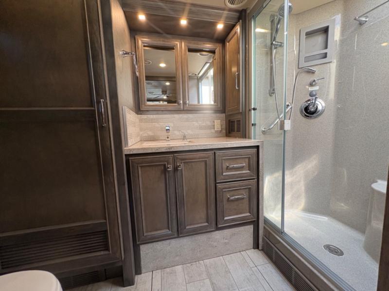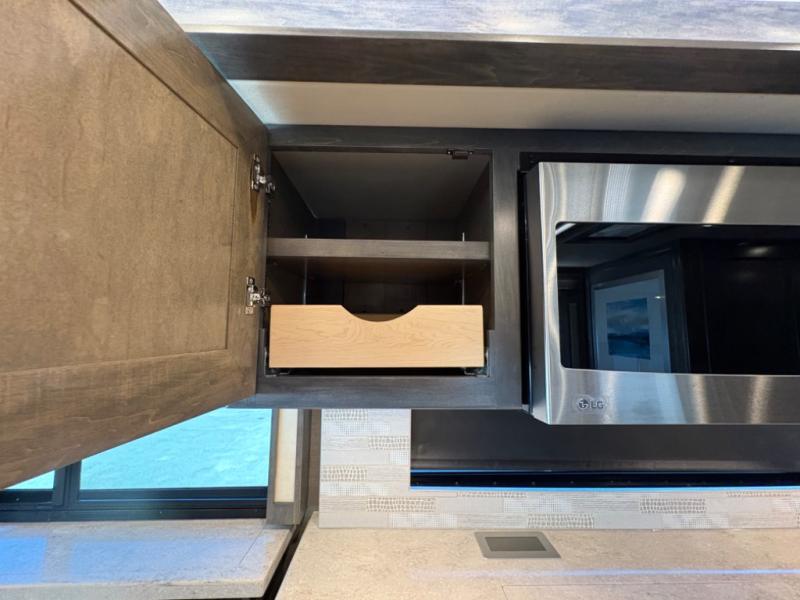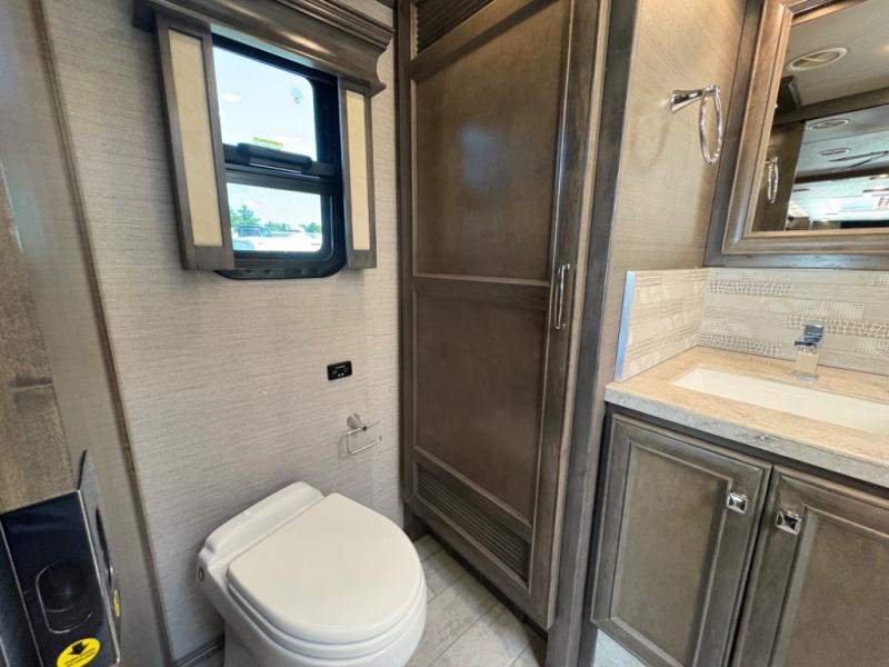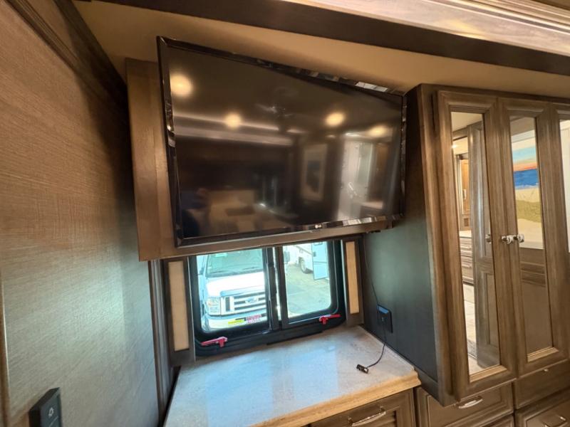 The 37 BH features a rear bunkhouse with two 30" x 72" bunk beds, a flip-up bunk, and a convertible wardrobe, perfect for children or guests. The front master suite includes a queen bed, wardrobe, and flat-panel TV, offering comfort and privacy. With a bath and a half, including a full rear bathroom and a convenient half bath, this motorhome ensures convenience for all occupants.