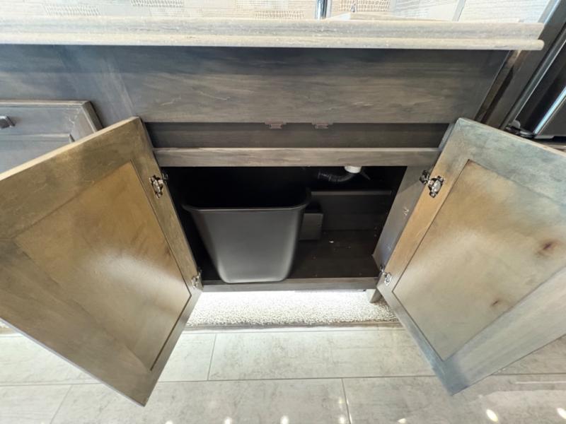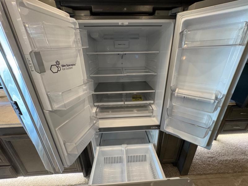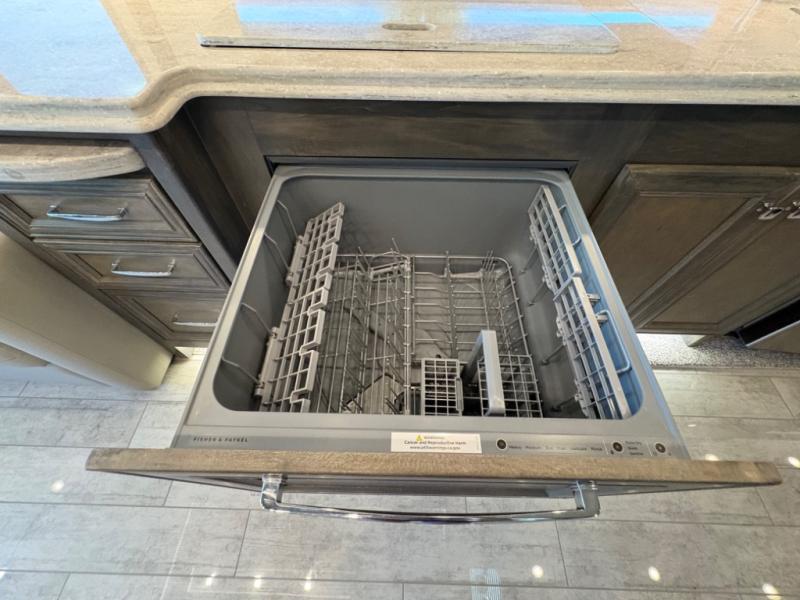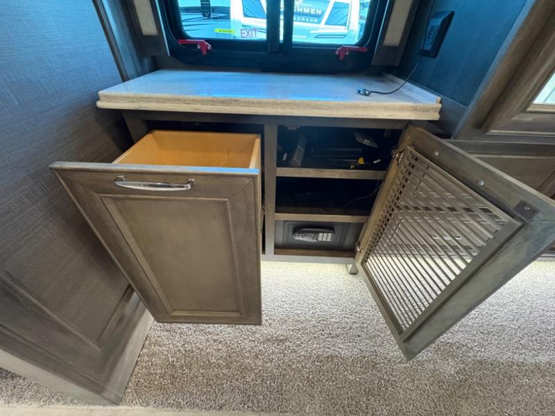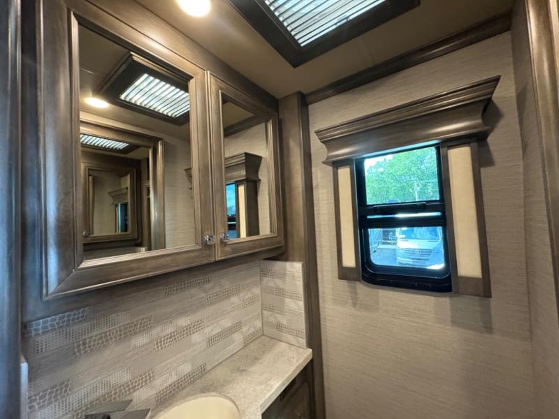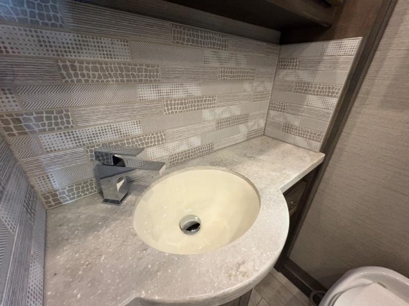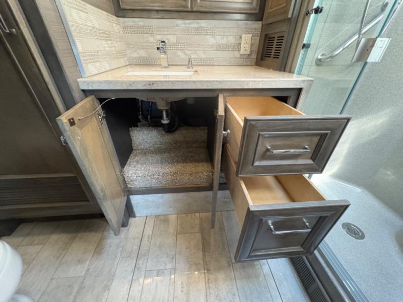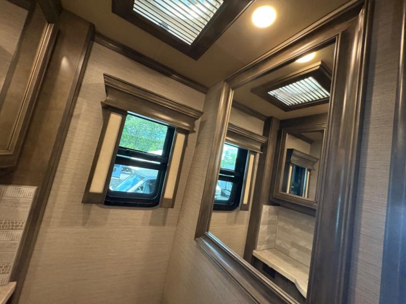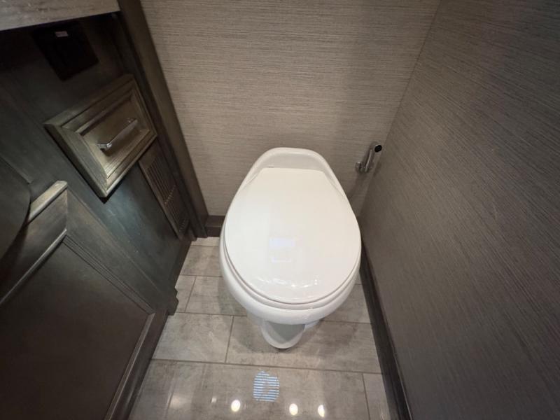The 37 BH features a rear bunkhouse with two 30" x 72" bunk beds, a flip-up bunk, and a convertible wardrobe, perfect for children or guests. The front master suite includes a queen bed, wardrobe, and flat-panel TV, offering comfort and privacy. With a bath and a half, including a full rear bathroom and a convenient half bath, this motorhome ensures convenience for all occupants.