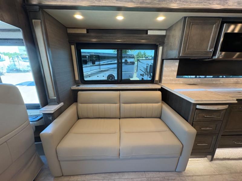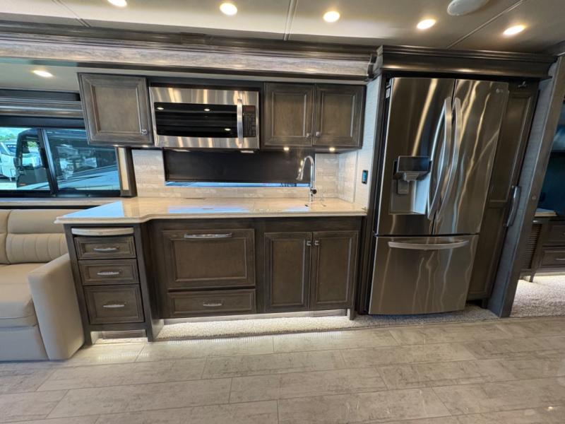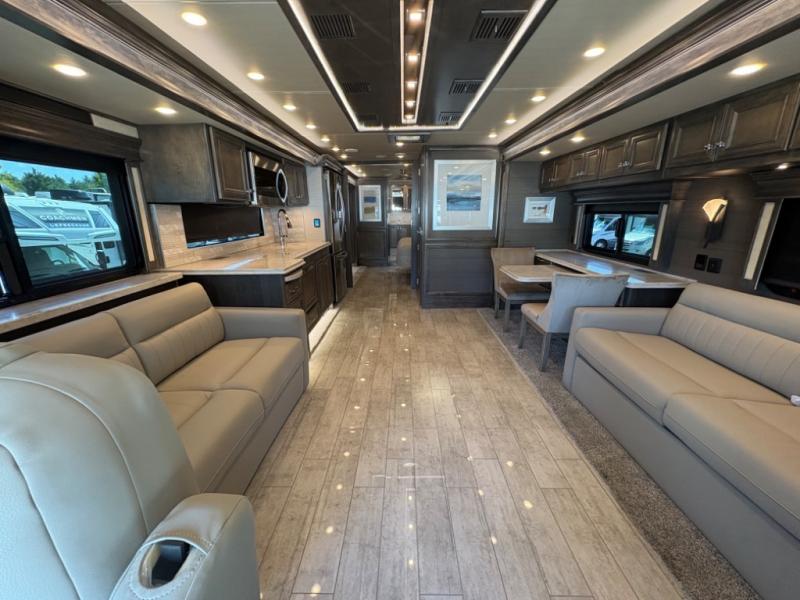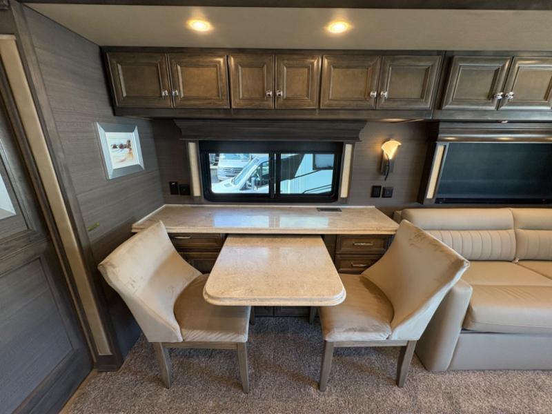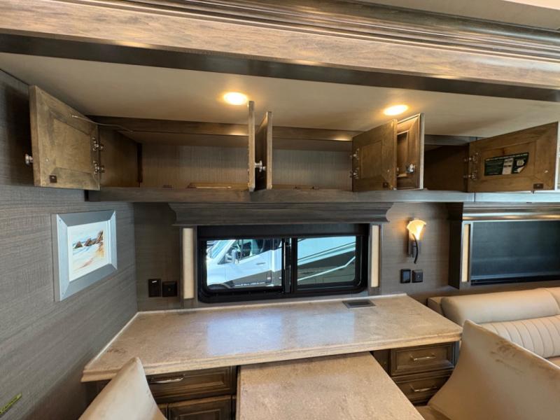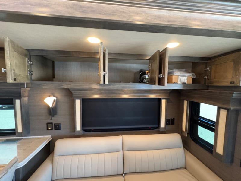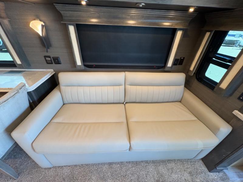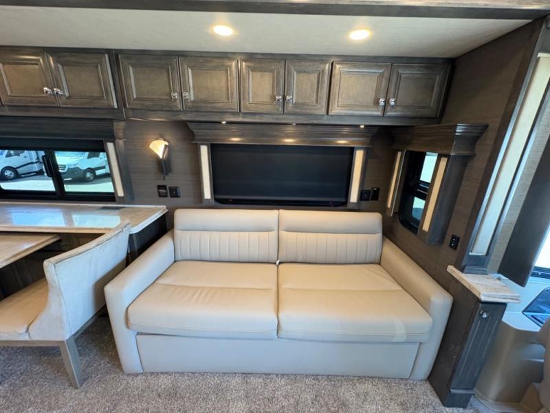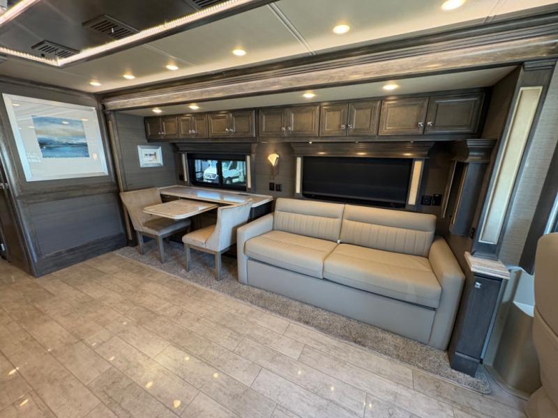 The living area is ideal for relaxation, featuring Ultraleather DE theater seating, a tri-fold sofa, a booth dinette, and an entertainment center with fireplace and TV. The open-concept design and three slide-outs create a bright, airy space for family gatherings.