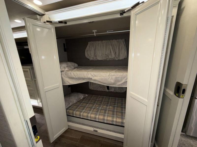 Pack your bags and load up into this Phaeton motorhome! The kiddos can sleep on the set of 30" x 72" bunk beds and you can sleep on the queen bed slide in the rear private bedroom. The bedroom also has a rear large closet with an area prepped to add an optional washer and dryer so everyone can enjoy clean clothes throughout the trip. A few other guests can tag along and sleep on either the ultraleather air coil sofa bed, the ultraleather DE sofa bed, the booth dinette, or the optional drop-down front bunk. There are many other seating choices you can choose from like the optional dinette with computer workstation to get some work done while you're away or the optional recliner with angled TV cabinet with an optional fireplace too!