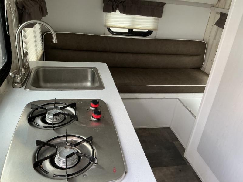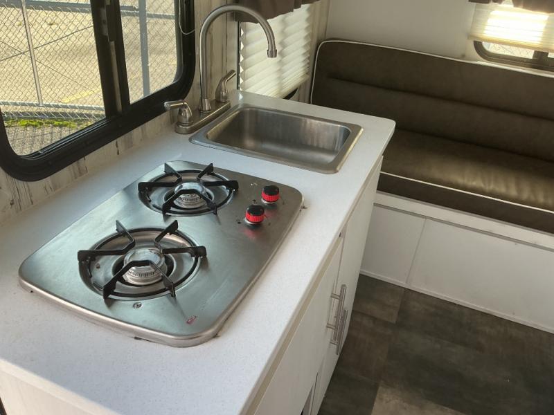 This travel trailer is ready for an adventure when ever you are! You can prepare home cooked meals with the two burner cooktop, the 3 cu. ft. 12V refrigerator, and the single bowl stainless steel sink, then enjoy them at the front booth dinette which can transform into a 54" x 74" bed. Grab a snack from the kitchen pantry and relax on the rear sofa with overhead cabinets and a bunk bed above it, plus it can also transform into a 36" x 74" bed for sleeping too. With a wet bathroom, you can rinse the sand out of your hair after a fun day at the beach and the high efficiency vent fan will eliminate any unwanted steam!