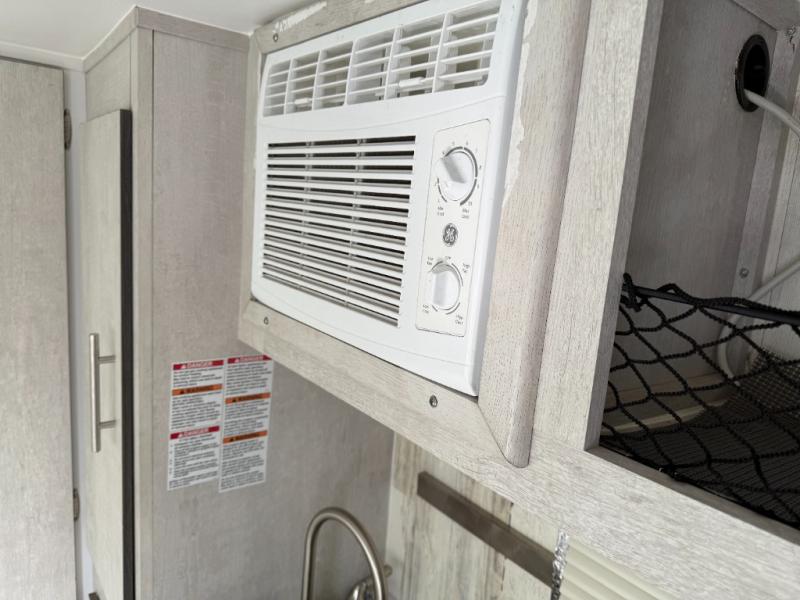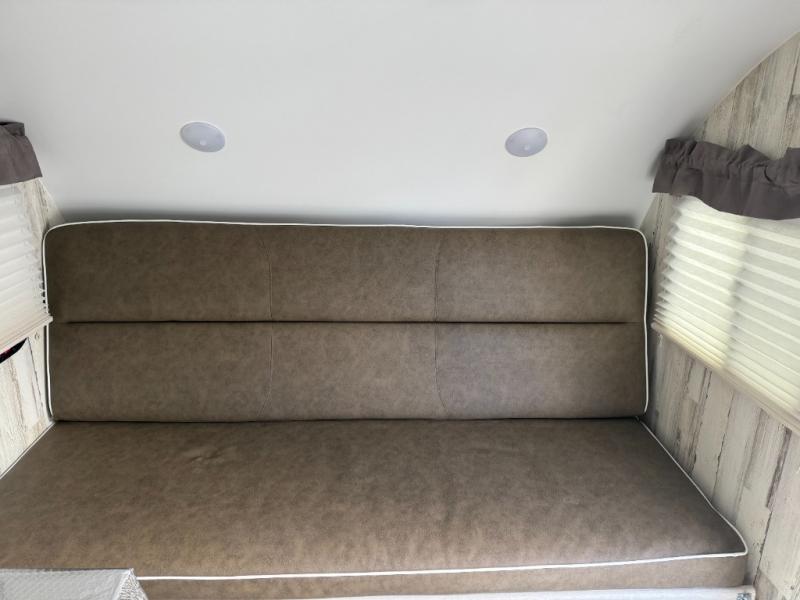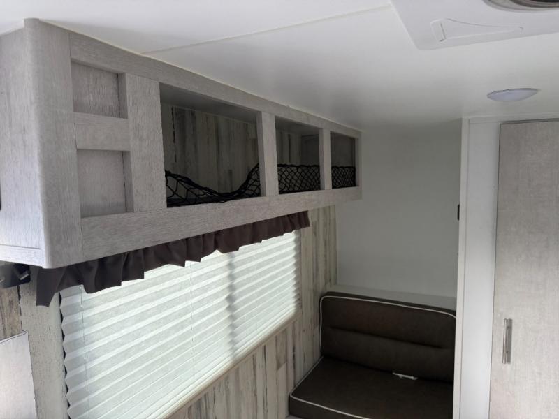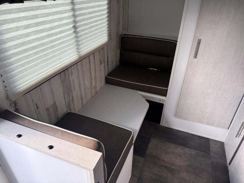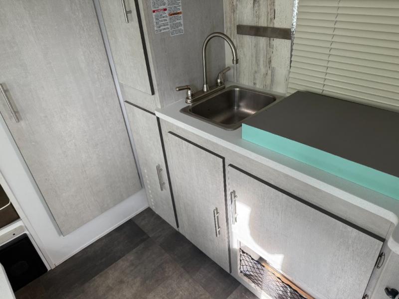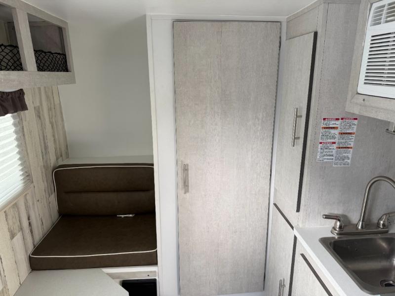 Head to your favorite campgrounds with your favorite person in this travel trailer! Relax each evening in true comfort on the front sofa while enjoying a snack that was stored in the kitchen pantry, and the sofa transforms into a full bed for sleeping at night too. The two person dinette offers a comfortable place to play games and enjoy meals prepared at the two burner cooktop, 3 cu. ft. 12V refrigerator, and single bowl stainless steel sink. There are shelves and overhead cabinets throughout to store your items, and a rear corner wet bathroom to freshen up in each morning with a high efficiency vent fan to eliminate any unwanted steam!