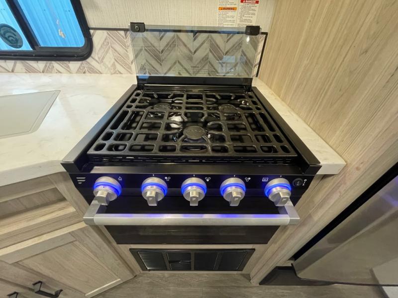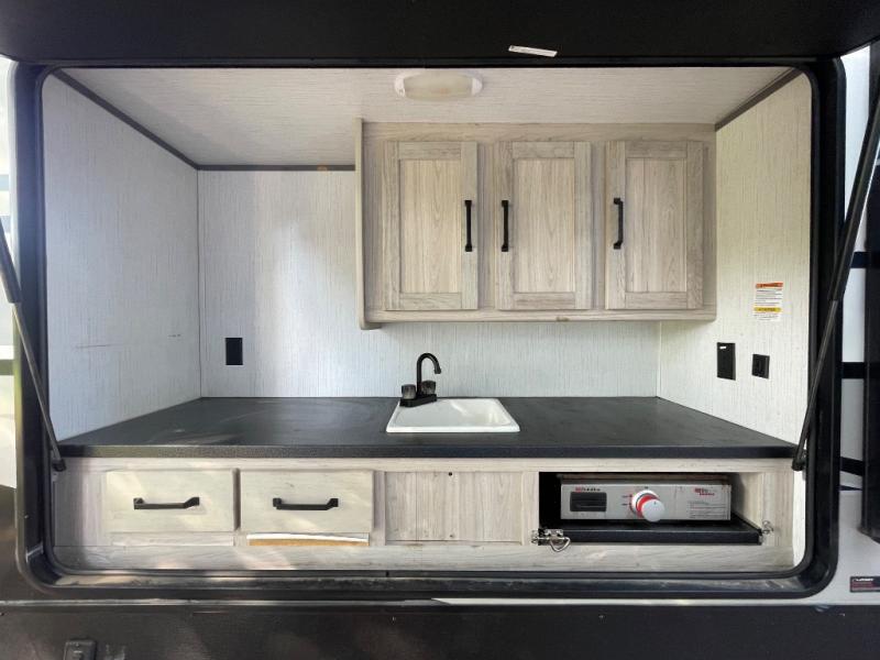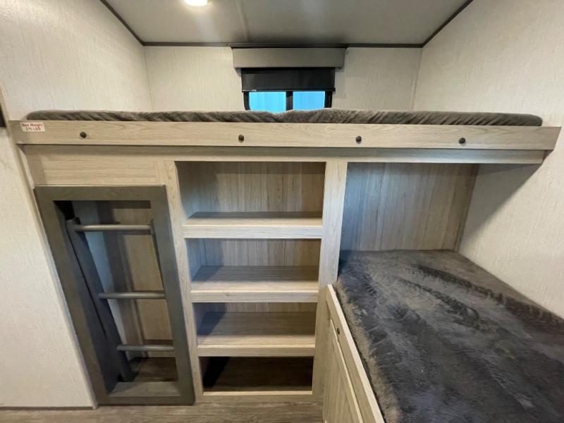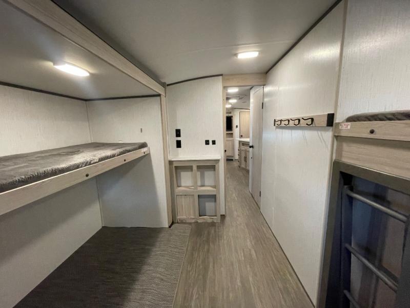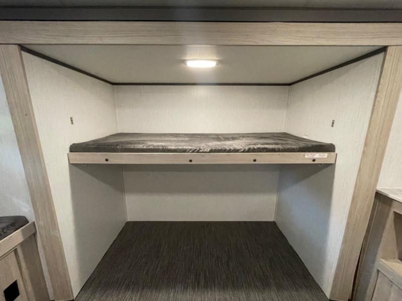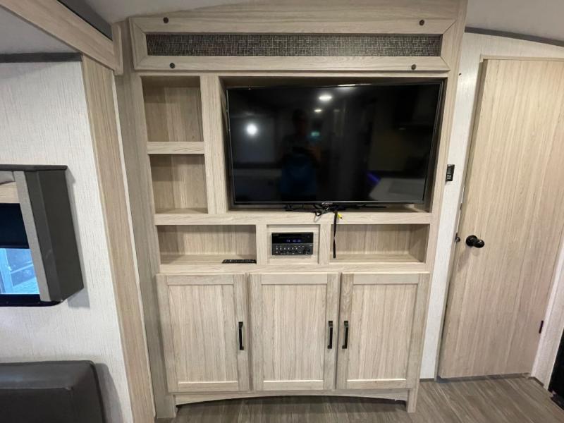 Don't pass up your chance to camp in true comfort with this travel trailer! It features a rear private bunkhouse with a bunk above an entertainment center, a lower bunk next to it, and a flip up bunk above a folding futon so the kids can bring a friend or two along. You will enjoy your own privacy with the front private bedroom with a king bed that has a Serta Comfort mattress. You could even transform the residential tri-fold sofa and dream dinette into extra sleeping spaces when you aren't using them to enjoy a meal or watch a movie with the 40" HD LED TV. The dual entry doors make it easy to access this unit, especially the full bathroom with its exit/entrance door near the outdoor kitchen!