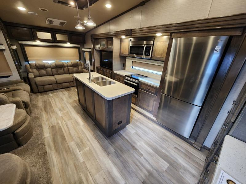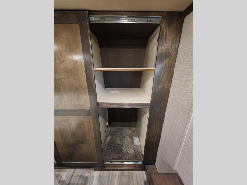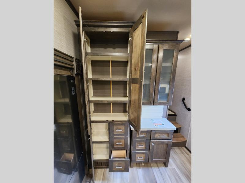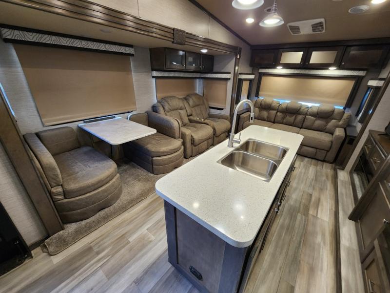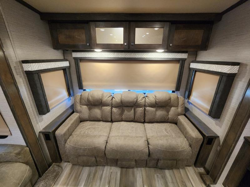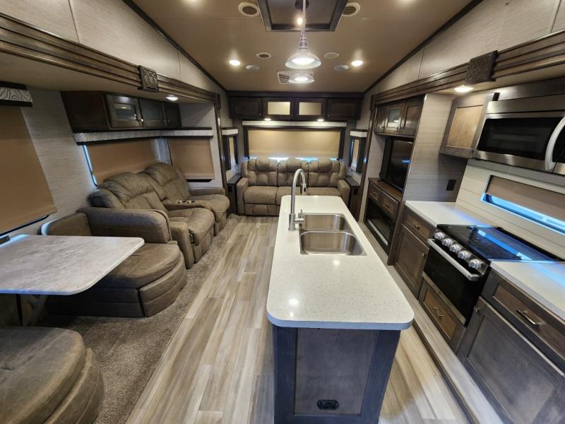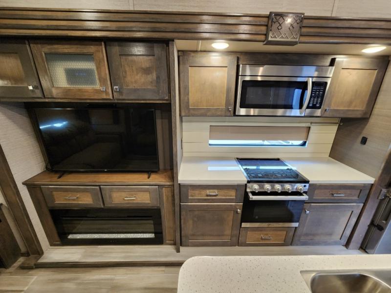 Pack your bags and head out on a new adventure in this luxurious fifth wheel! Since there is a space to add an optional washer and dryer in the front bedroom, this model would be great for full-time RV living. Preparing meals each day will be a snap on the Furrion oven and cooktop, plus there is a residential refrigerator and a large pantry to store all your food. Your nice dishes and seasonal decorations will look great in the hutch with upper and lower cabinets. This model includes dual opposing slides that will provide more space around the kitchen island with overhead lighting. After dinner the kids can play a game at the booth dinette, while you and your spouse relax on the theater sofa. There is even a 40" monitor TV and fireplace directly across from the theater sofa for easy viewing. Your guests or the kids can sleep on the 80" sofa bed, and you can enjoy the queen bed slide out in the front private bedroom. And don't forget about the large front closet and dressers for all your clothes!