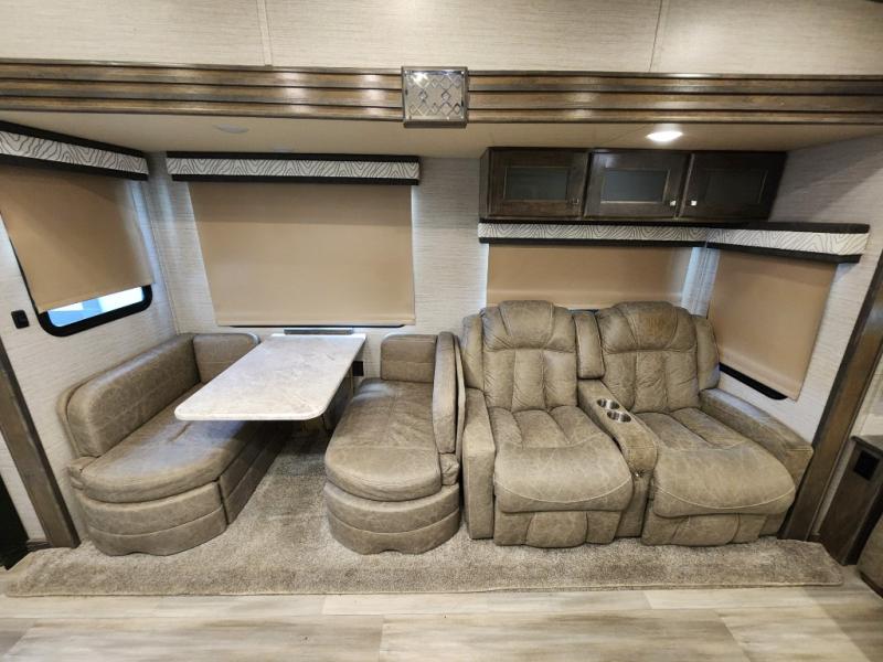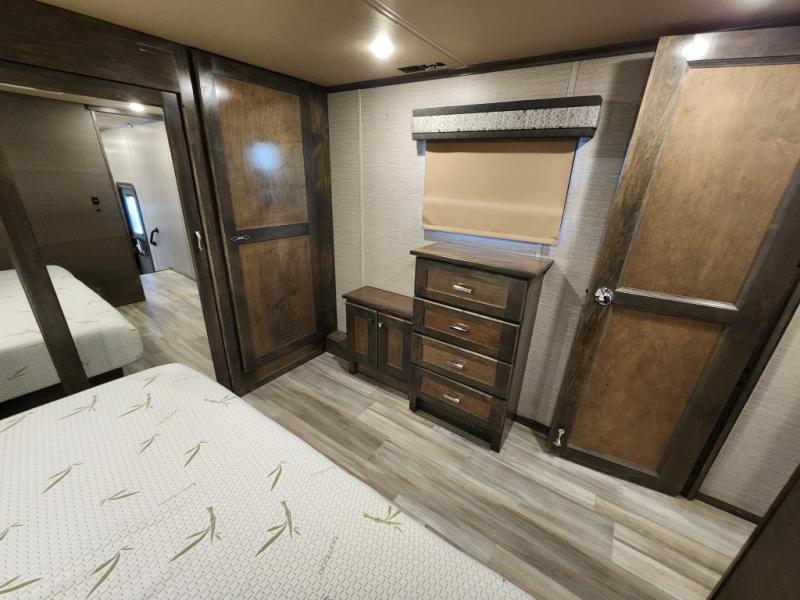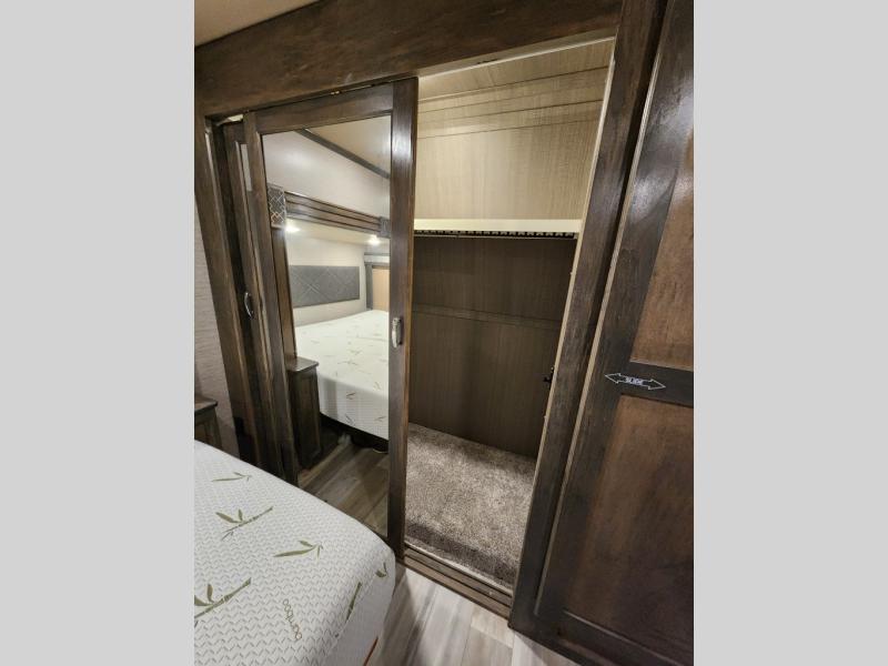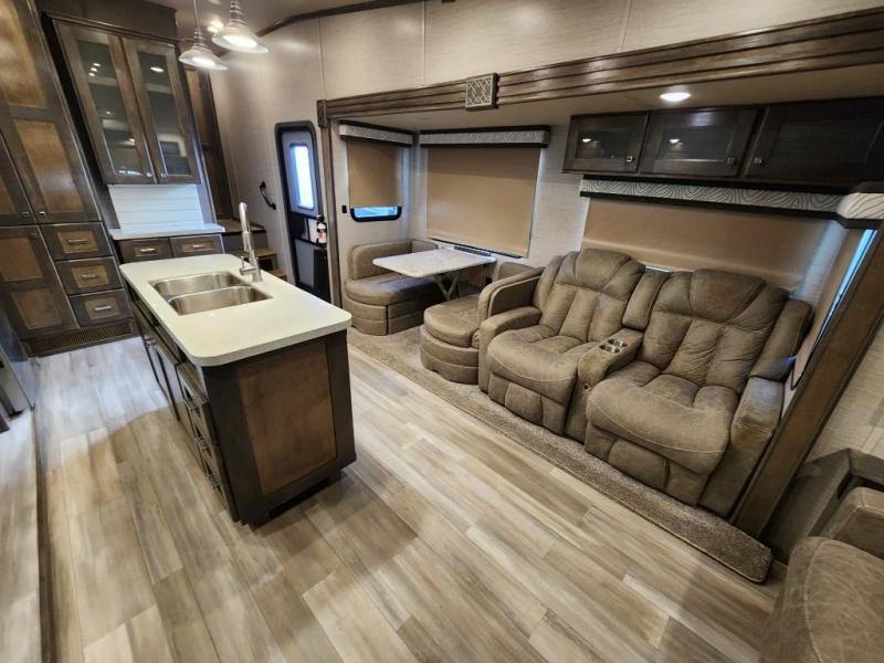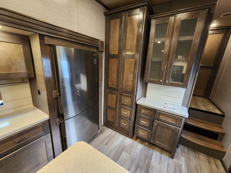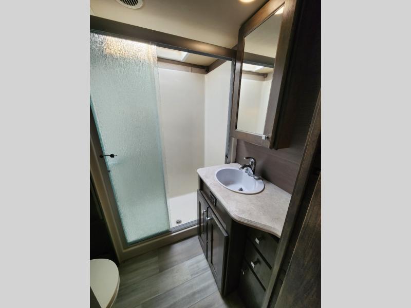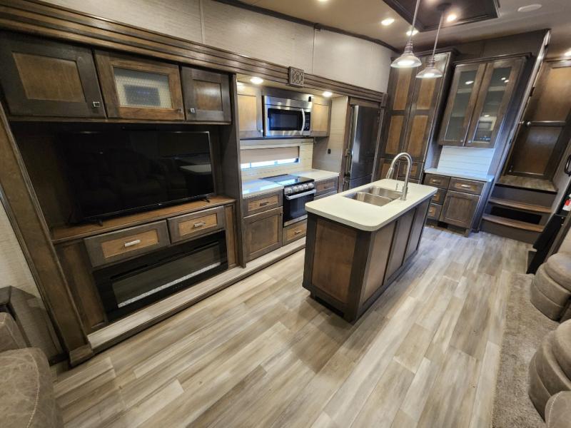 Pack your bags and head out on a new adventure in this luxurious fifth wheel! Since there is a space to add an optional washer and dryer in the front bedroom, this model would be great for full-time RV living. Preparing meals each day will be a snap on the Furrion oven and cooktop, plus there is a residential refrigerator and a large pantry to store all your food. Your nice dishes and seasonal decorations will look great in the hutch with upper and lower cabinets. This model includes dual opposing slides that will provide more space around the kitchen island with overhead lighting. After dinner the kids can play a game at the booth dinette, while you and your spouse relax on the theater sofa. There is even a 40" monitor TV and fireplace directly across from the theater sofa for easy viewing. Your guests or the kids can sleep on the 80" sofa bed, and you can enjoy the queen bed slide out in the front private bedroom. And don't forget about the large front closet and dressers for all your clothes!