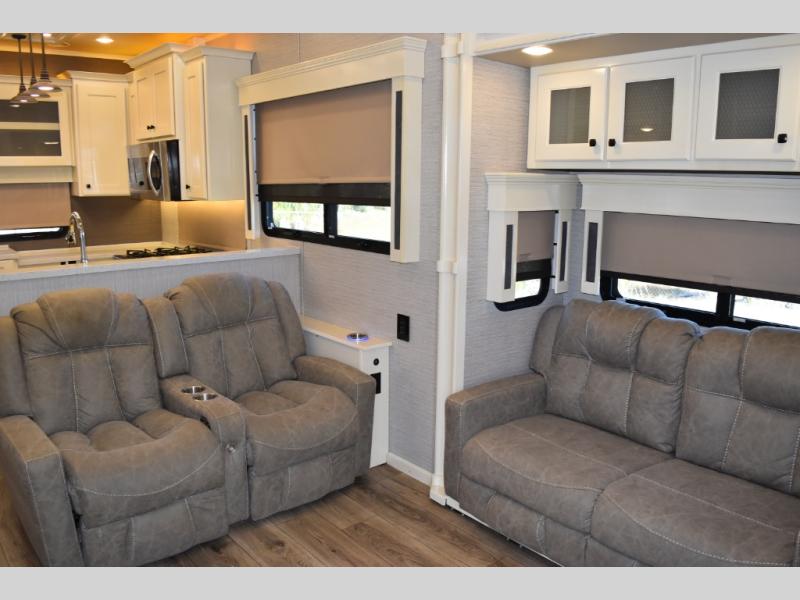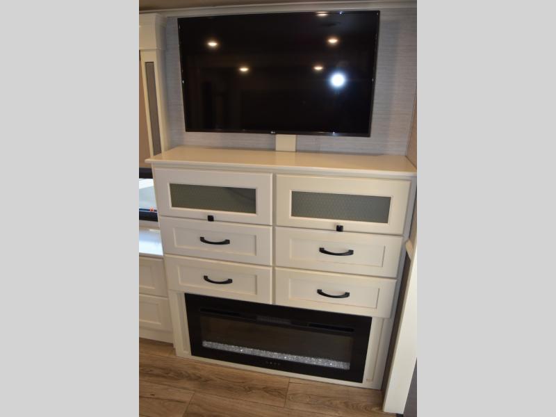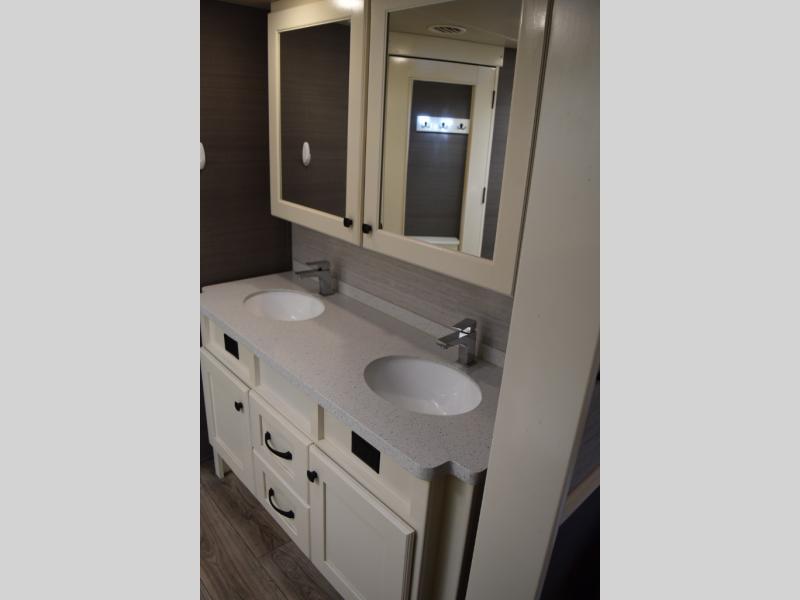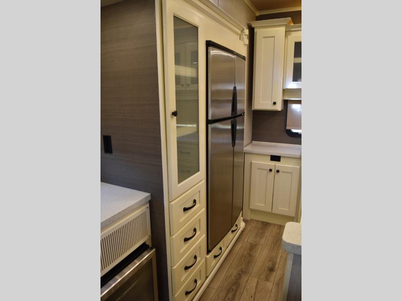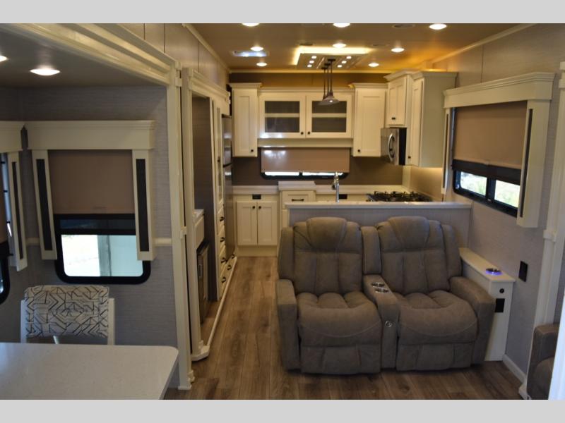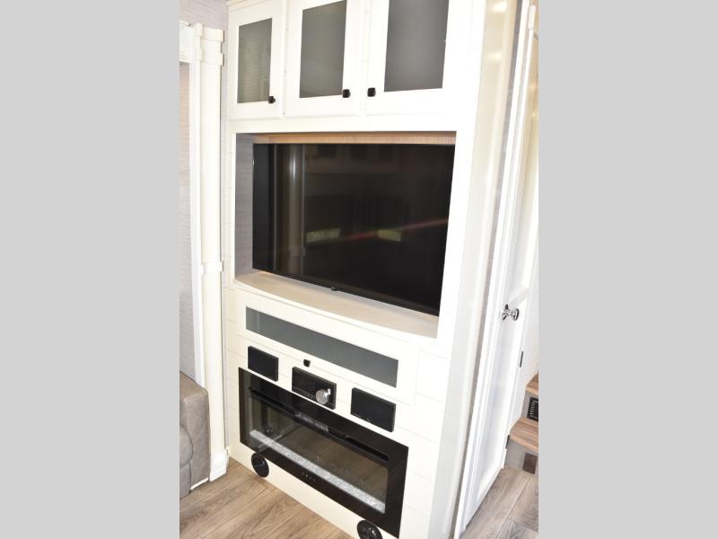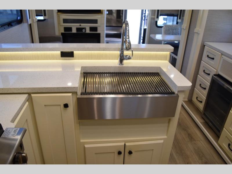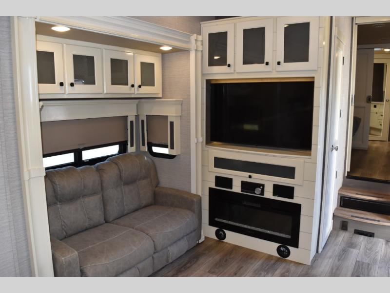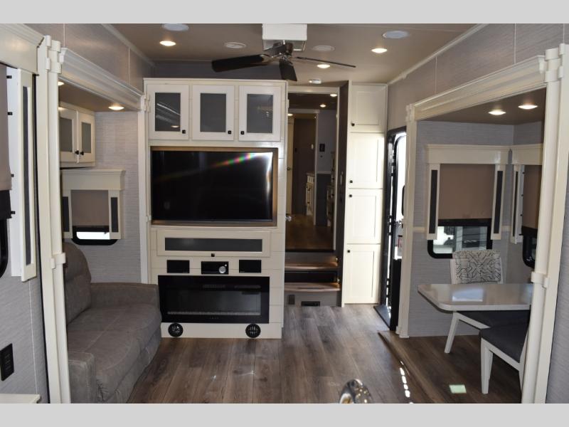 It won't take you long to fall in love with this luxurious fifth wheel. The rear kitchen is any chef's dream with its farmhouse sink without a divider, an Insignia oven and cooktop, and tons of counter space. After dinner, head to the middle living area that includes dual opposing slides for maximum space, and plenty of seating choices on the tri-fold sofa, the theater sofa, and the dinette with chairs. What could be better than a front full bath with dual bath sinks and a closet with shelves and shoe storage? A convenient half bath just for your guests! And don't forget about the master bedroom with a slide out king bed, sliding doors for more space, and your own fireplace.