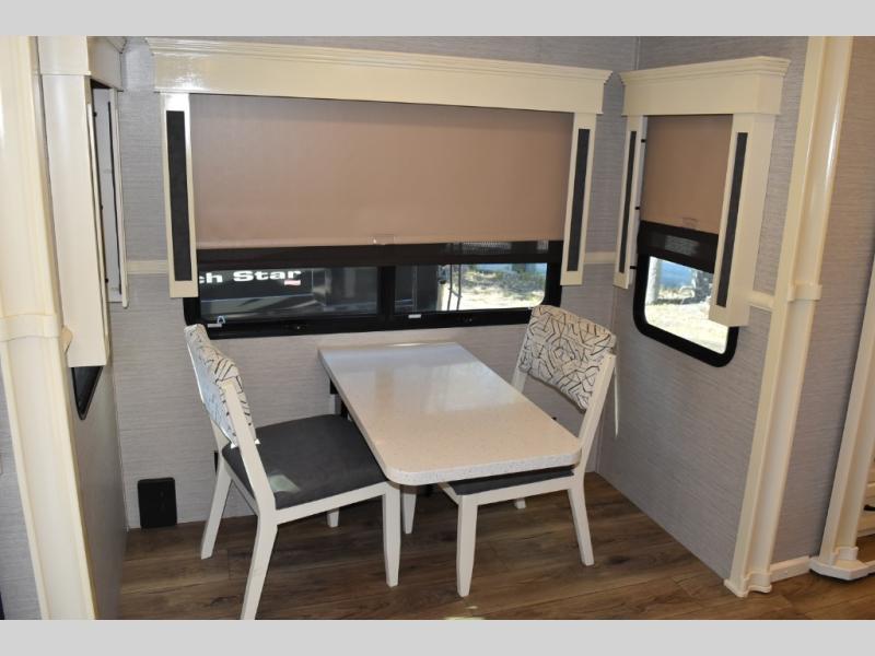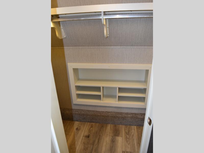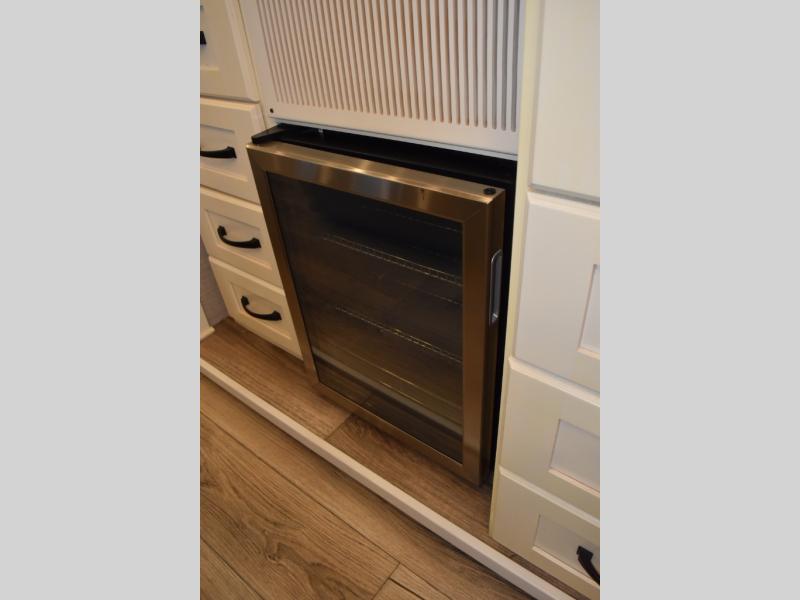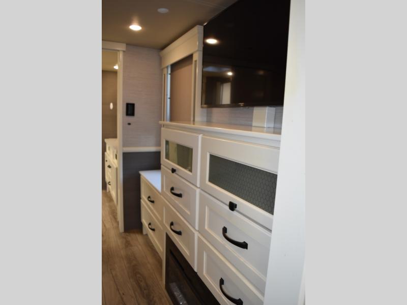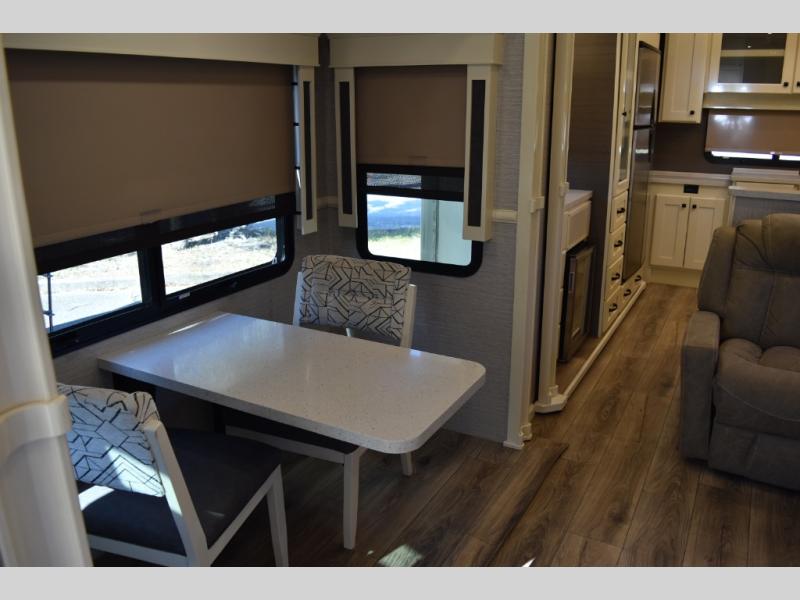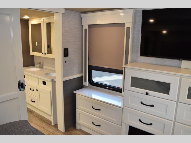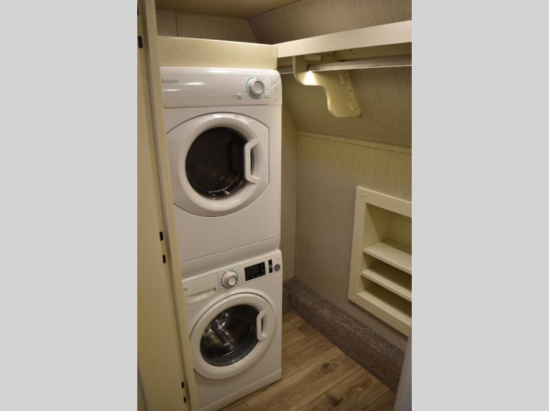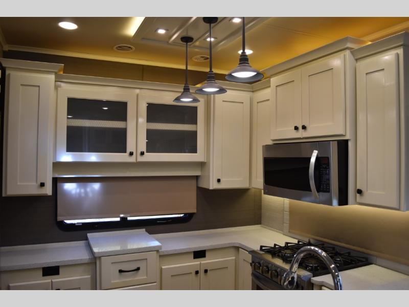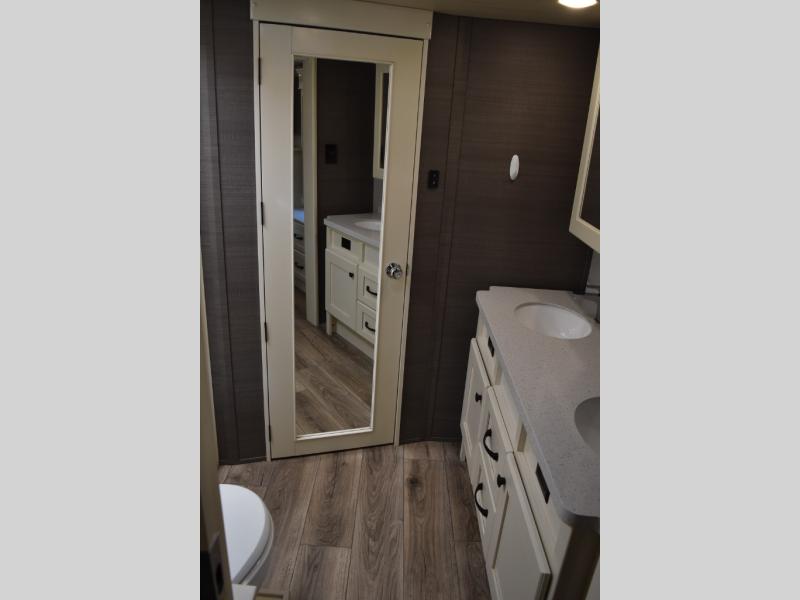 It won't take you long to fall in love with this luxurious fifth wheel. The rear kitchen is any chef's dream with its farmhouse sink without a divider, an Insignia oven and cooktop, and tons of counter space. After dinner, head to the middle living area that includes dual opposing slides for maximum space, and plenty of seating choices on the tri-fold sofa, the theater sofa, and the dinette with chairs. What could be better than a front full bath with dual bath sinks and a closet with shelves and shoe storage? A convenient half bath just for your guests! And don't forget about the master bedroom with a slide out king bed, sliding doors for more space, and your own fireplace.