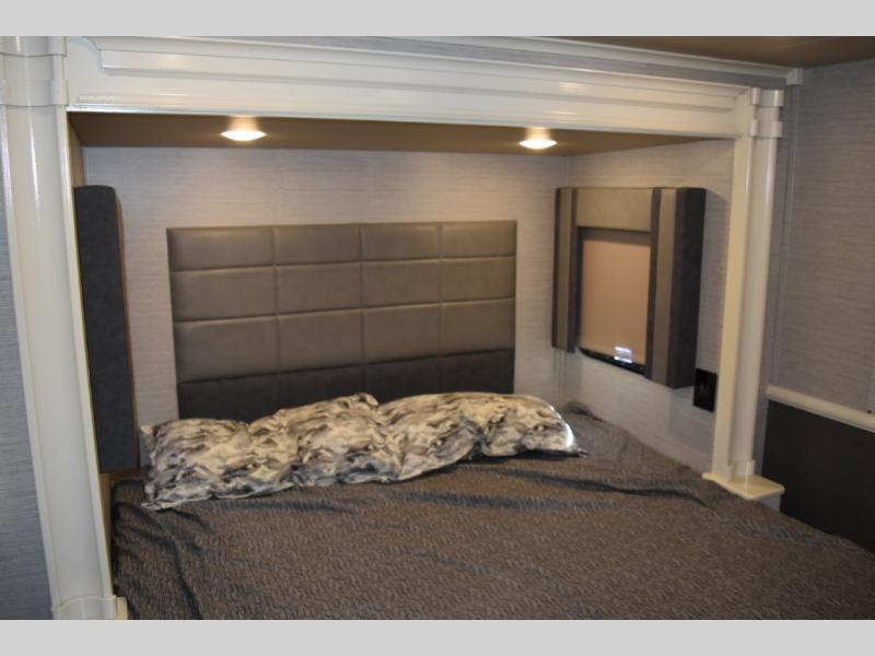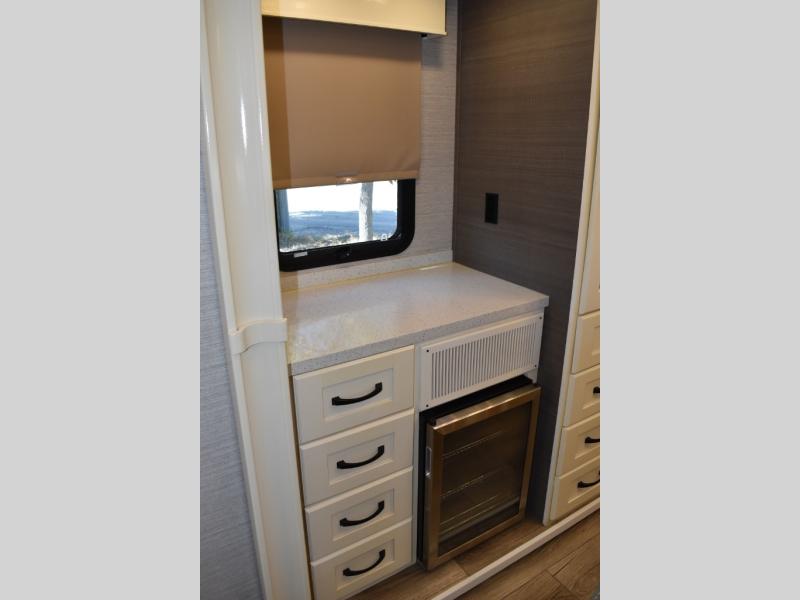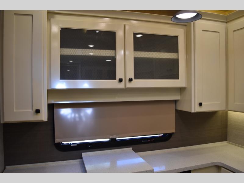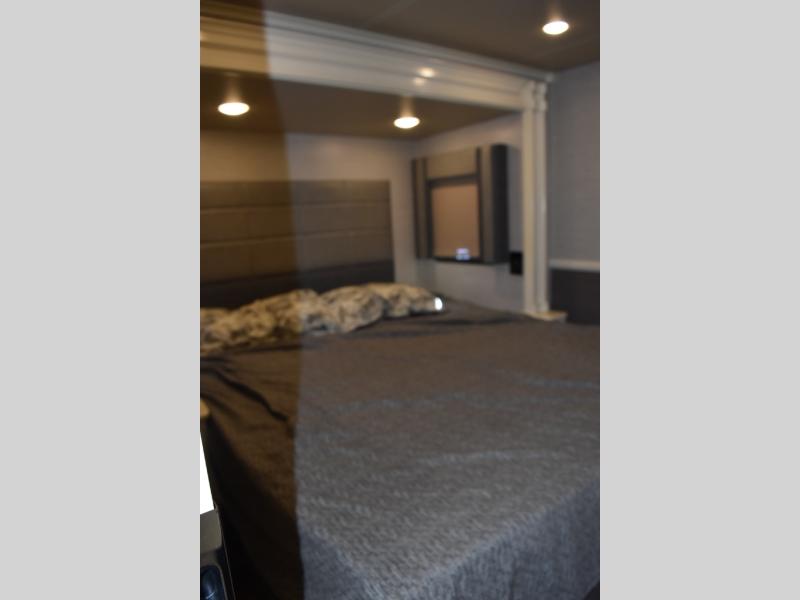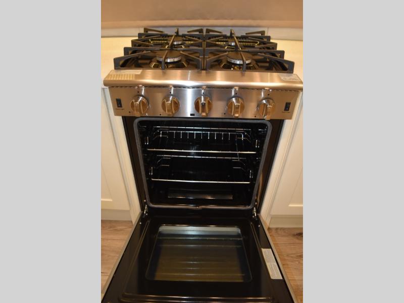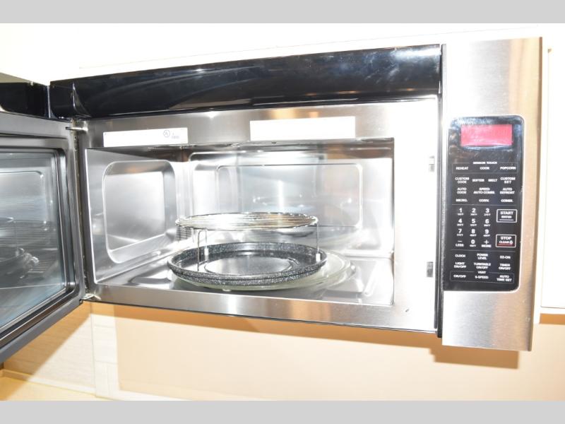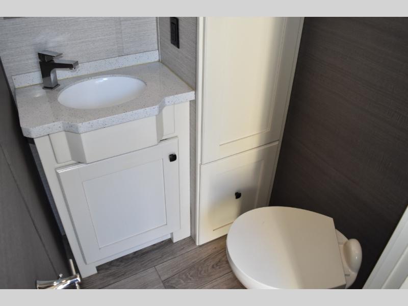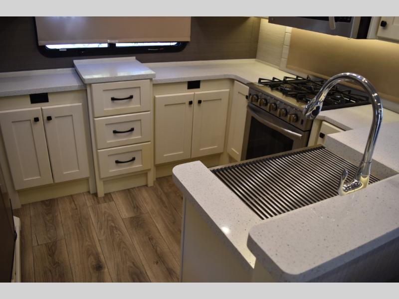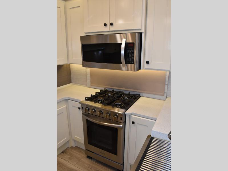 It won't take you long to fall in love with this luxurious fifth wheel. The rear kitchen is any chef's dream with its farmhouse sink without a divider, an Insignia oven and cooktop, and tons of counter space. After dinner, head to the middle living area that includes dual opposing slides for maximum space, and plenty of seating choices on the tri-fold sofa, the theater sofa, and the dinette with chairs. What could be better than a front full bath with dual bath sinks and a closet with shelves and shoe storage? A convenient half bath just for your guests! And don't forget about the master bedroom with a slide out king bed, sliding doors for more space, and your own fireplace.