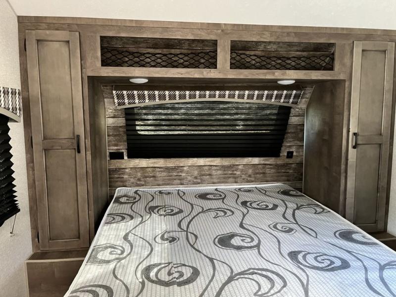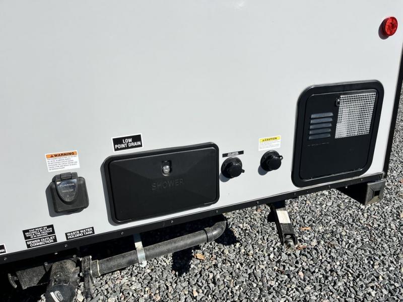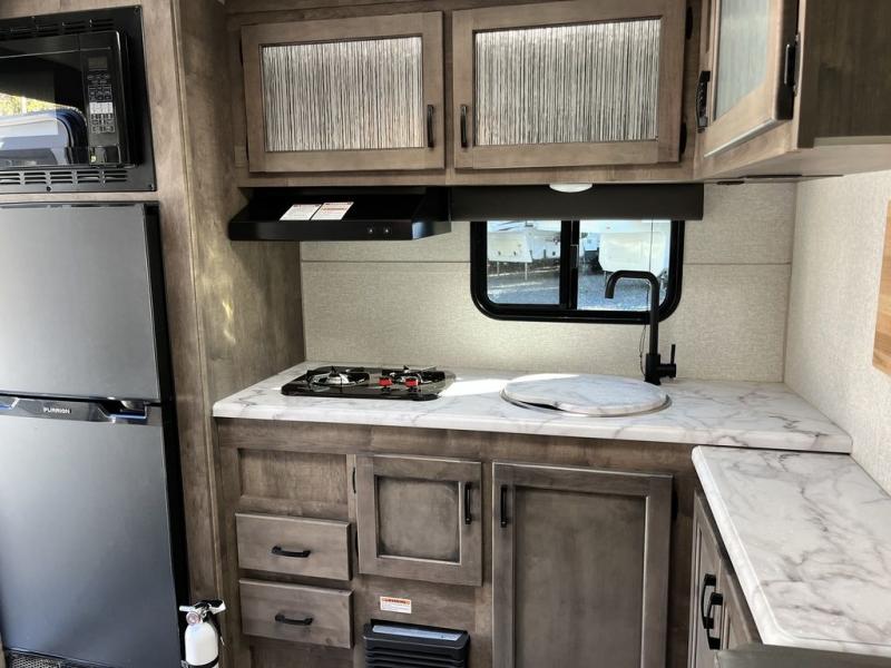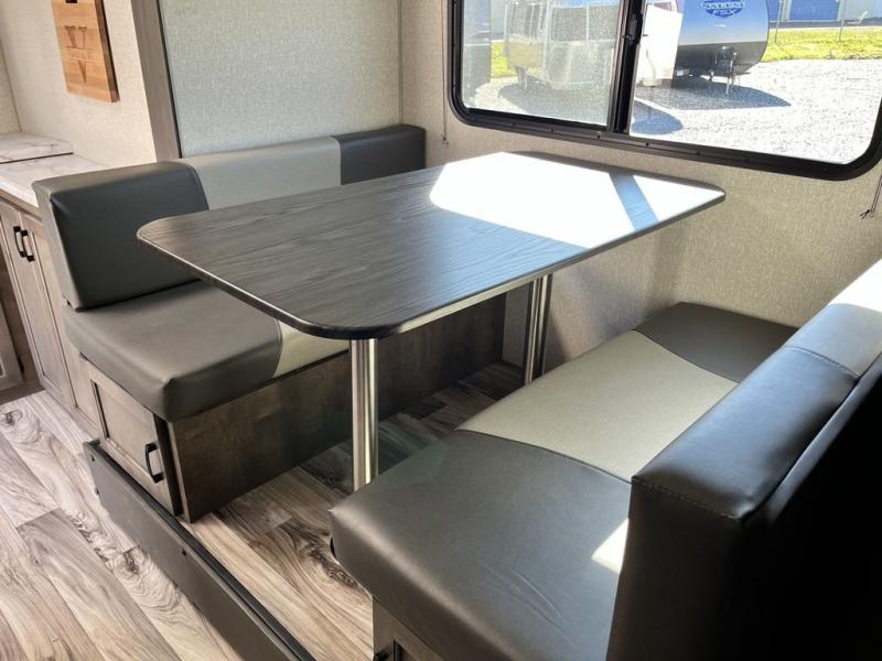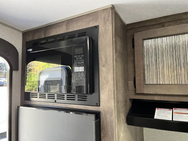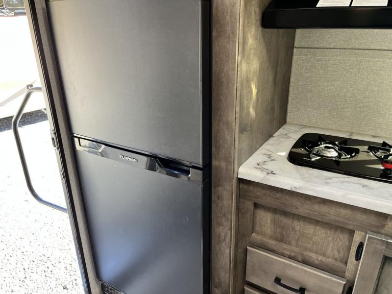 Enjoy camping with your favorite person and/or your family in this trailer that offers a rear kitchen with a two burner cooktop and convection microwave, windows and overhead cabinets for dishes and spices, plus next to the entry there is an 8 cu. ft. refrigerator and a pantry/closet to easily grab a drink and snack on your way out to explore. Yet you might want to relax under the 13' power awning before heading out. And when you get back, you can get cleaned up in the full bathroom before falling asleep on the front RV queen bed with StorMore bedside nightstands and a 110V outlet plus USB charging for your cellphones, and one to two tired campers can sleep on the 65" x 48" booth dinette slide.