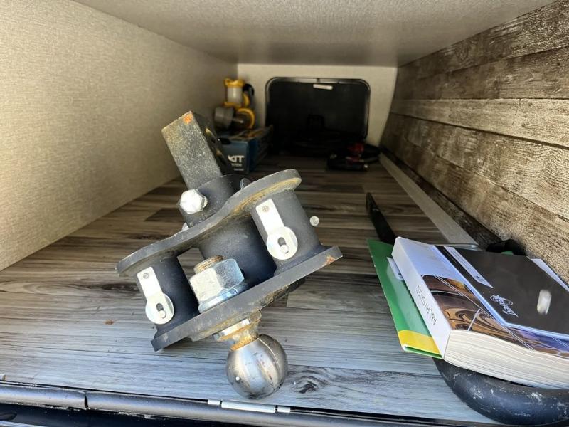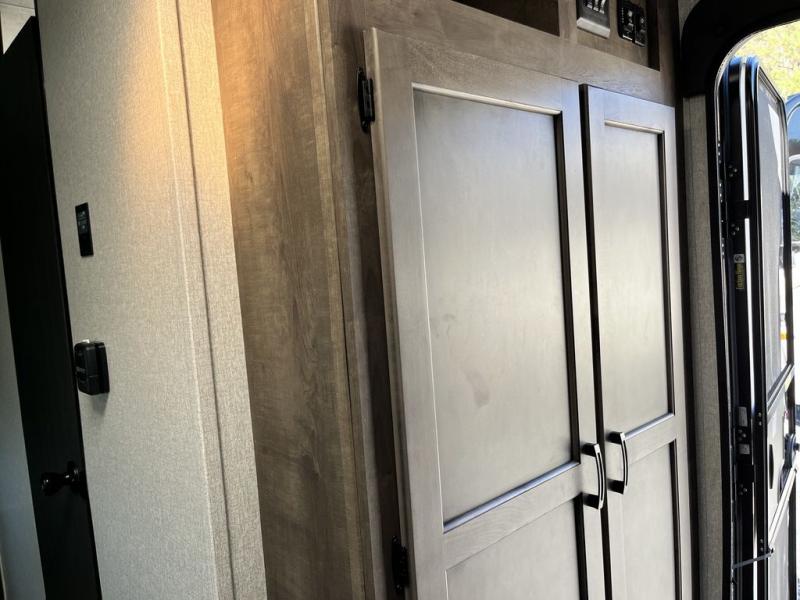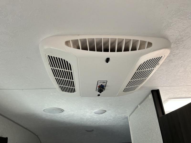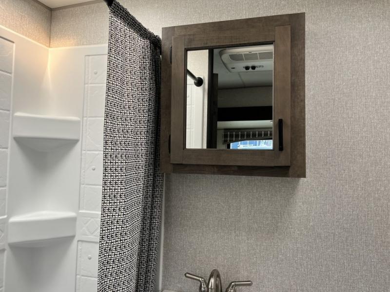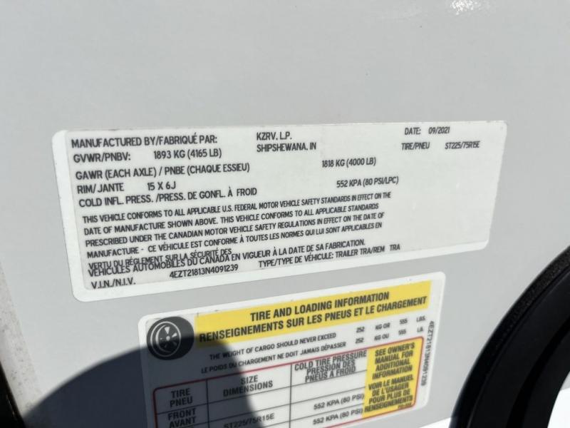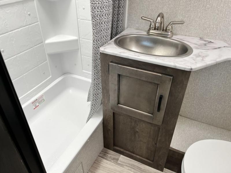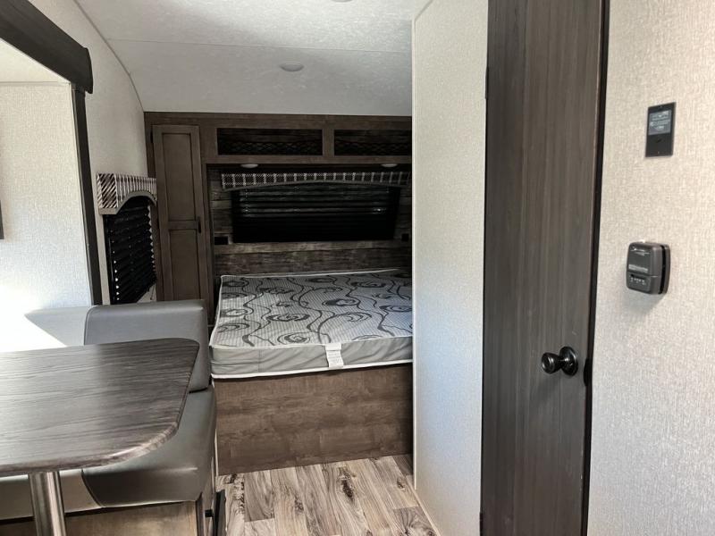 Enjoy camping with your favorite person and/or your family in this trailer that offers a rear kitchen with a two burner cooktop and convection microwave, windows and overhead cabinets for dishes and spices, plus next to the entry there is an 8 cu. ft. refrigerator and a pantry/closet to easily grab a drink and snack on your way out to explore. Yet you might want to relax under the 13' power awning before heading out. And when you get back, you can get cleaned up in the full bathroom before falling asleep on the front RV queen bed with StorMore bedside nightstands and a 110V outlet plus USB charging for your cellphones, and one to two tired campers can sleep on the 65" x 48" booth dinette slide.