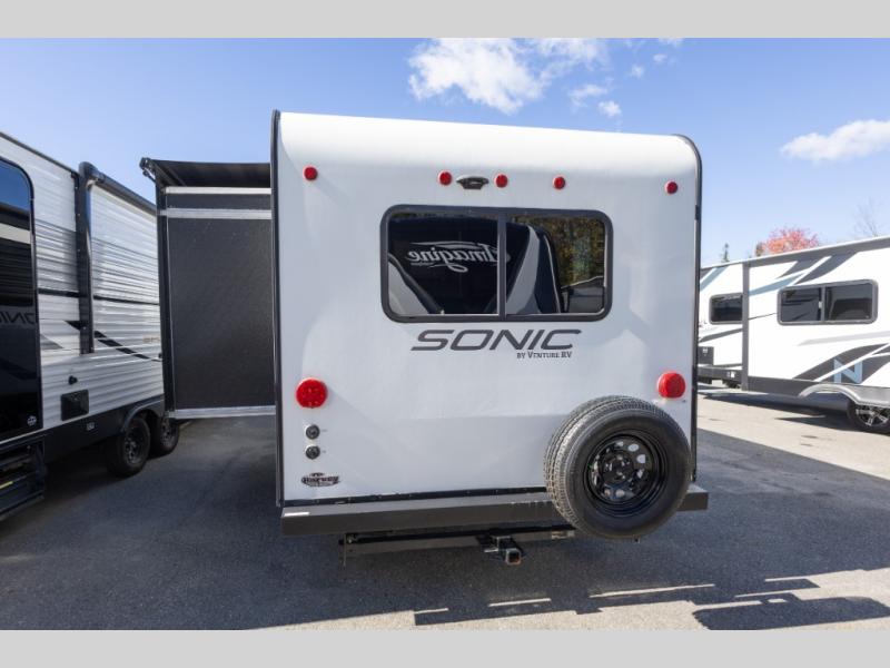 With any Sonic travel trailer by Venture RV, you begin with Next Generation in RV frame technology with the NXG Huck-bolt frame, AZDEL Onboard composite panels, tongue and groove plywood floor decking, radiant foil bubble insulation-wrapped tanks, 360-degree residential fiberglass insulation and radiant foil insulation, plus a forced-air heated and enclosed underbelly which is part of the Weather-Shield package. There is a Highway Package that comes mandatory, and the Discovery Package 1.3 provides a motion light in the bathroom, a dish drying sink cover, and the Venture LevelMate Pro, a power tongue jack, and WIFI prep to mention a few features. Get ready for comfort and style in a Sonic ultra-lightweight, tandem-axle travel trailer of your choice!