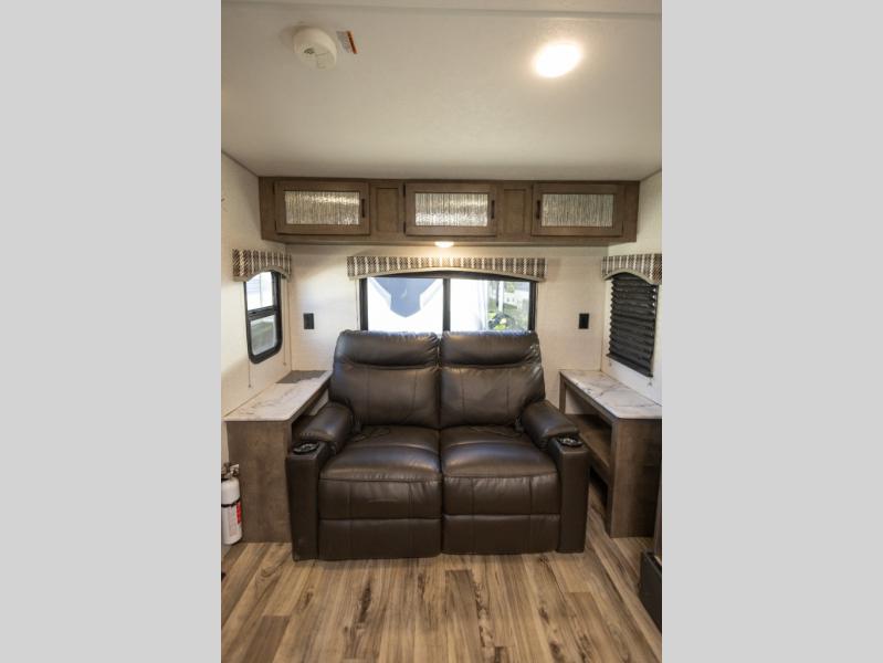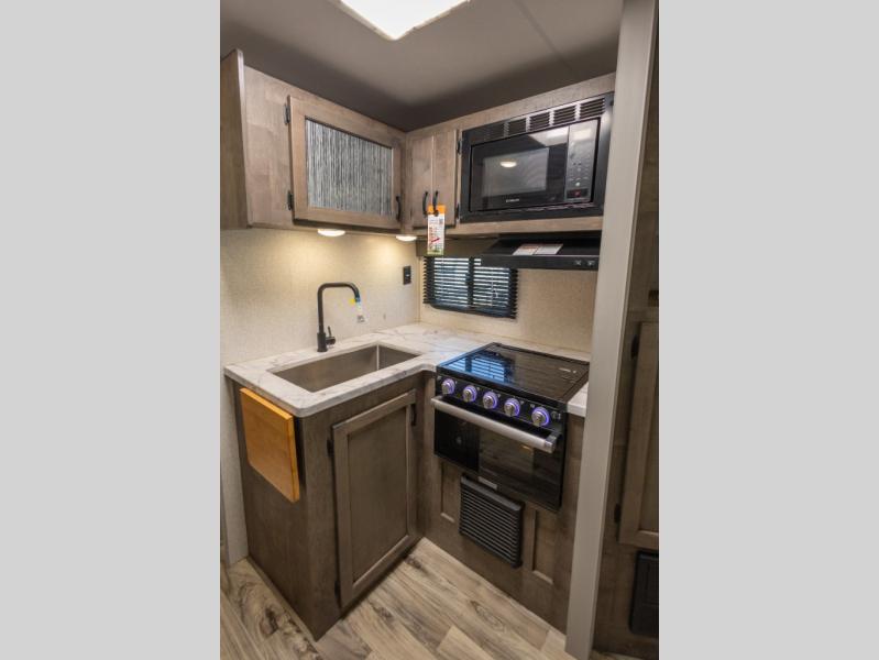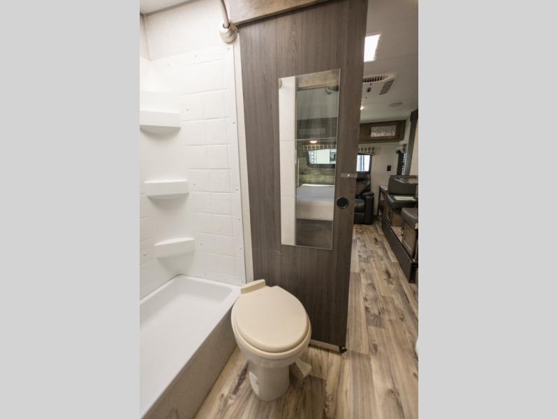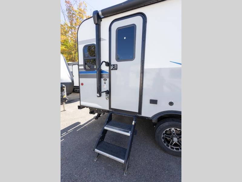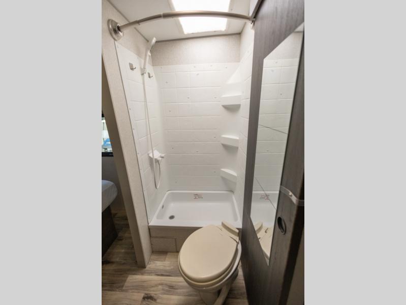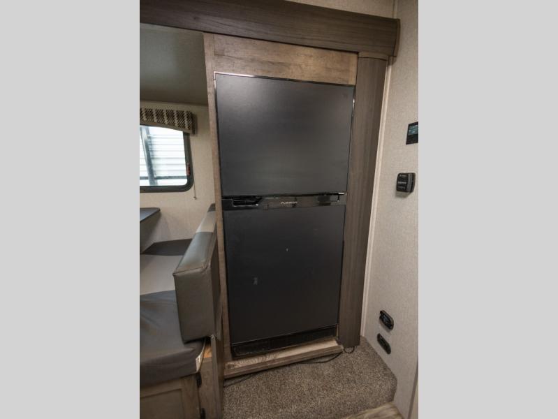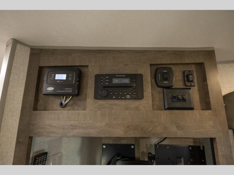 Looking for privacy when you camp? Do you enjoy dining at a booth dinette when you are staying in an RV? This Sonic provides all of that plus more! Starting with the private bedroom with an RV queen bed, StorMore bedside nightstands with a 110V outlet and USB charging to keep the electronics ready, dual wardrobes, and access to the walk-through bathroom through a space savings sliding door. The second entry to the walk-through bath is in the main living and kitchen area where you will find a 65" x 48" booth dinette and an 8 cu. ft. refrigerator slide out for more interior floor space, an L-shaped countertop with a large sink and kitchen amenities, plus an entertainment center and a 64" jiffy sofa. And the furniture doubles as extra sleeping space when needed. Don't forget about the 17' power awning offering an outdoor living area, just add your camp chairs.
