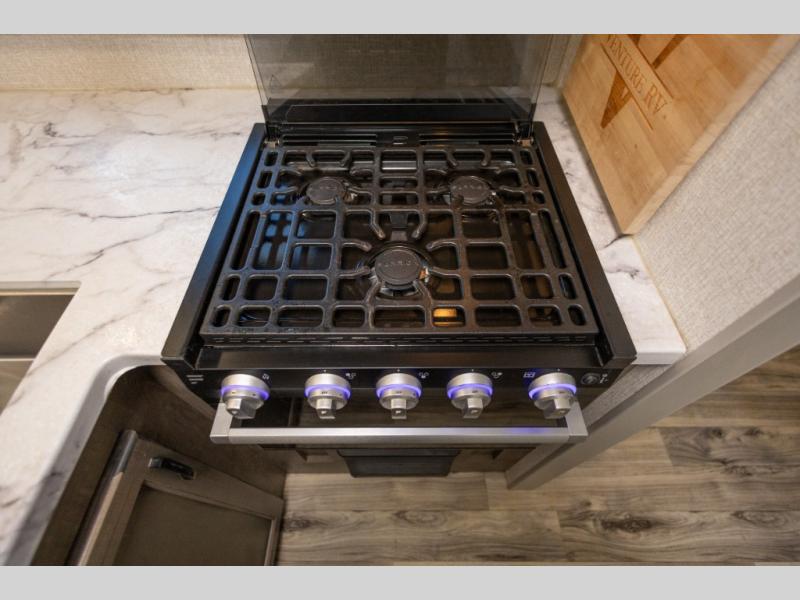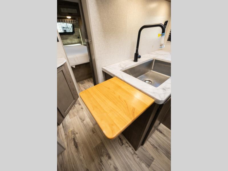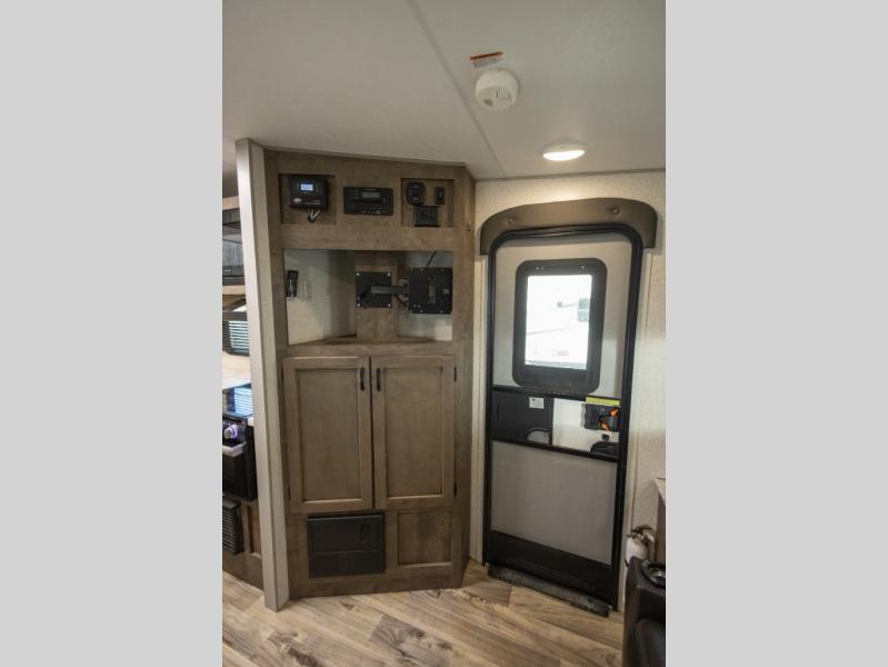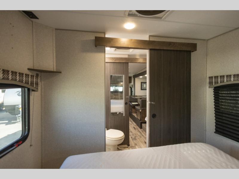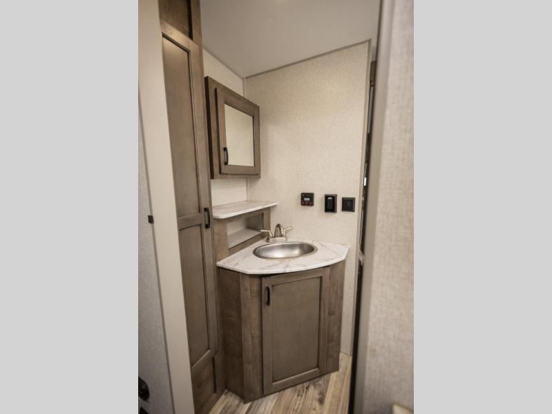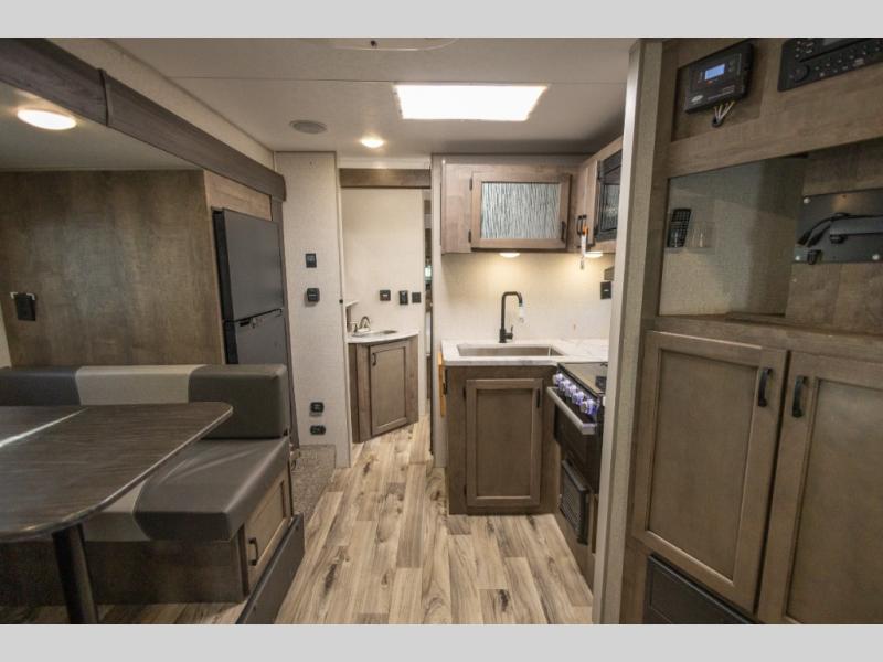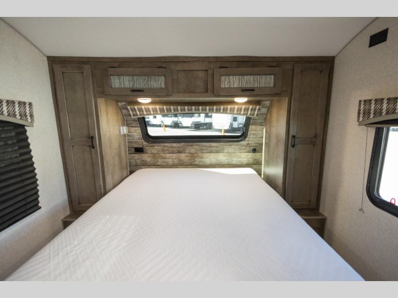 Looking for privacy when you camp? Do you enjoy dining at a booth dinette when you are staying in an RV? This Sonic provides all of that plus more! Starting with the private bedroom with an RV queen bed, StorMore bedside nightstands with a 110V outlet and USB charging to keep the electronics ready, dual wardrobes, and access to the walk-through bathroom through a space savings sliding door. The second entry to the walk-through bath is in the main living and kitchen area where you will find a 65" x 48" booth dinette and an 8 cu. ft. refrigerator slide out for more interior floor space, an L-shaped countertop with a large sink and kitchen amenities, plus an entertainment center and a 64" jiffy sofa. And the furniture doubles as extra sleeping space when needed. Don't forget about the 17' power awning offering an outdoor living area, just add your camp chairs.