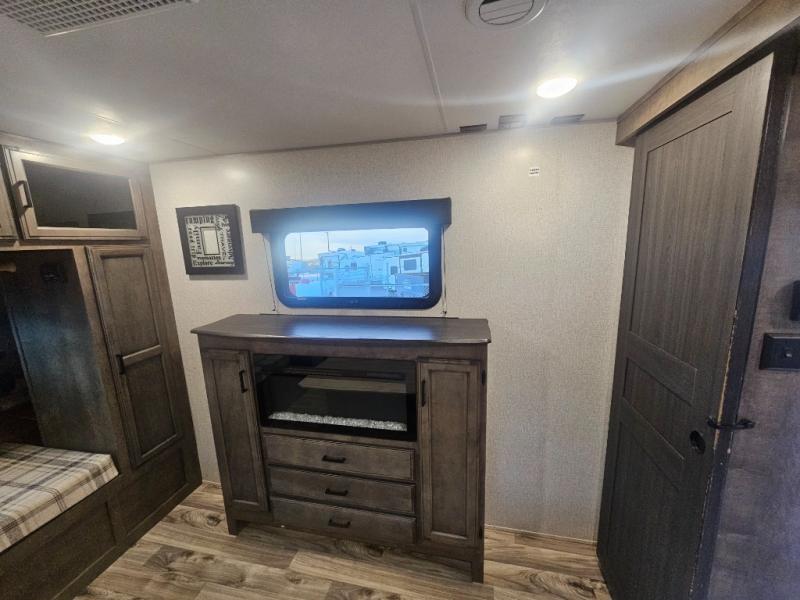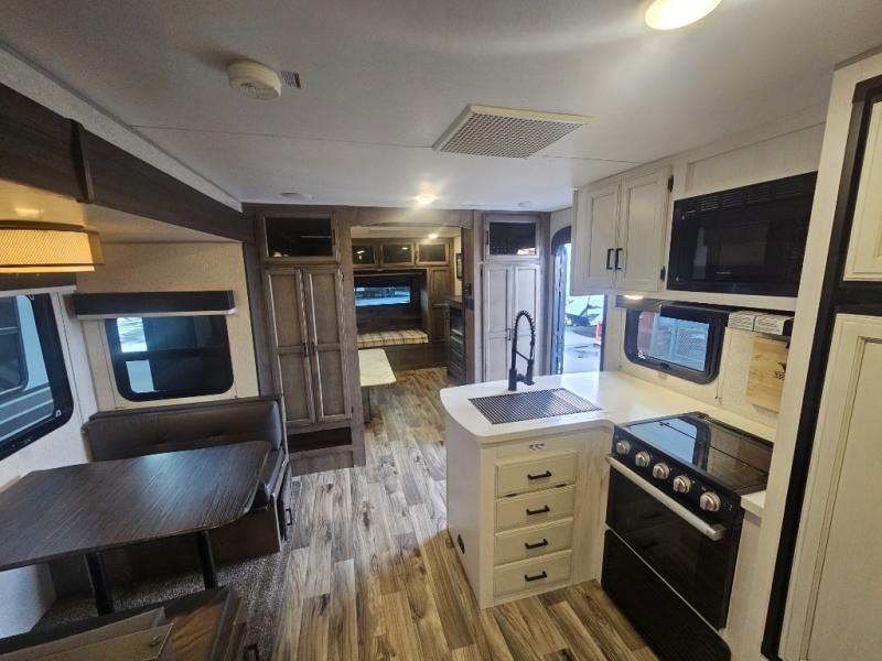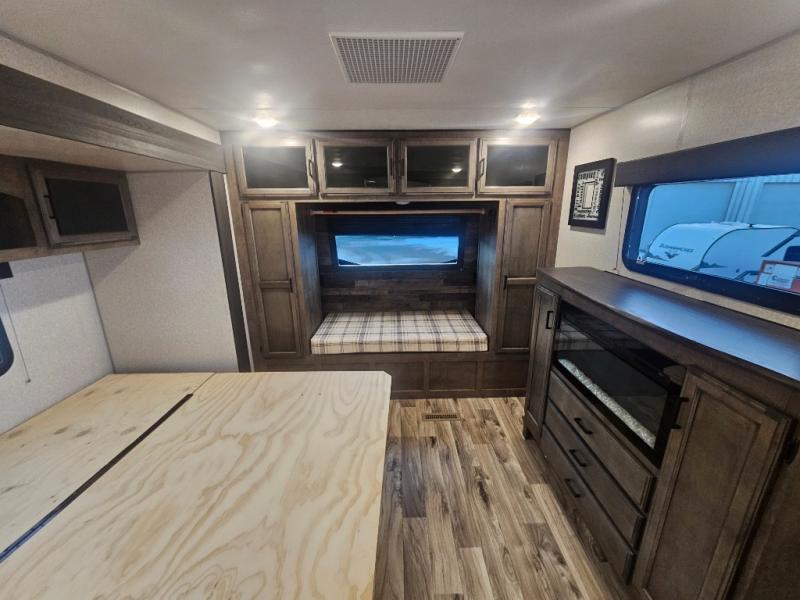 The 2022 Venture RV SportTrek 312VBH is a travel trailer from the SportTrek Touring Edition lineup, notable for its double-entry bunkhouse design, a front private bedroom, and an outdoor "Campfire Café" kitchen. Key features include two fireplaces, a king-size U-shaped dinette, a pass-through storage area, and modern farmhouse interior design elements like glazed Heirloom Maple and Antique White cabinets.