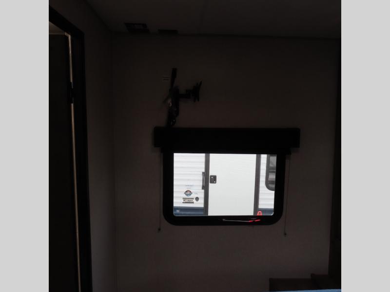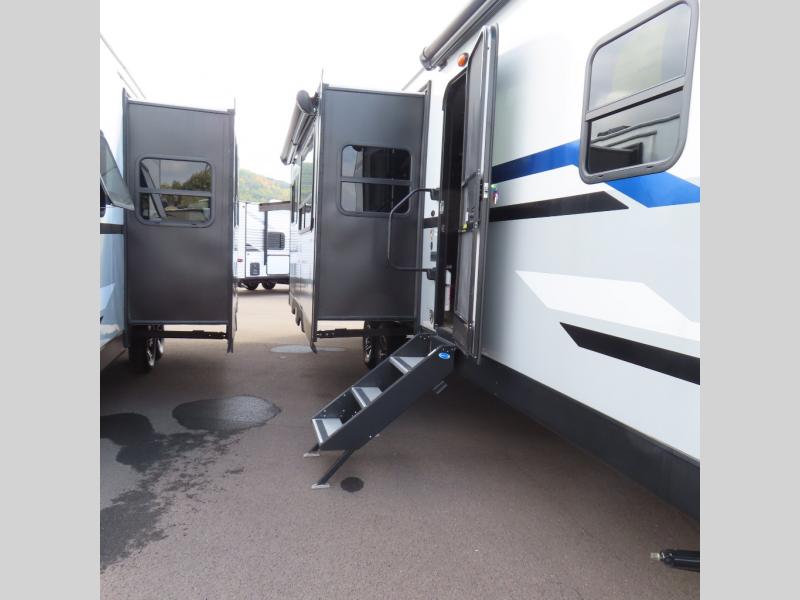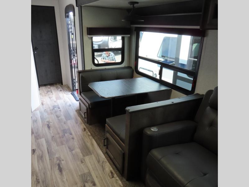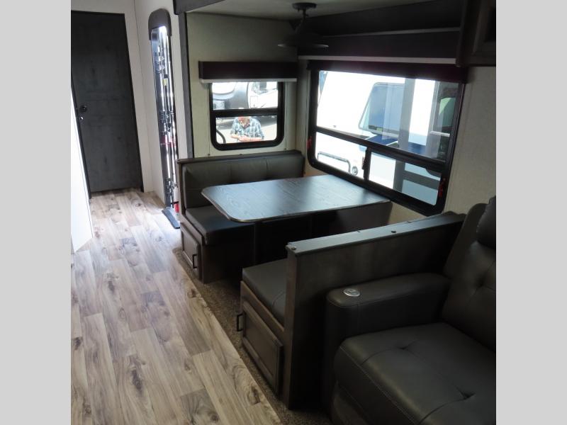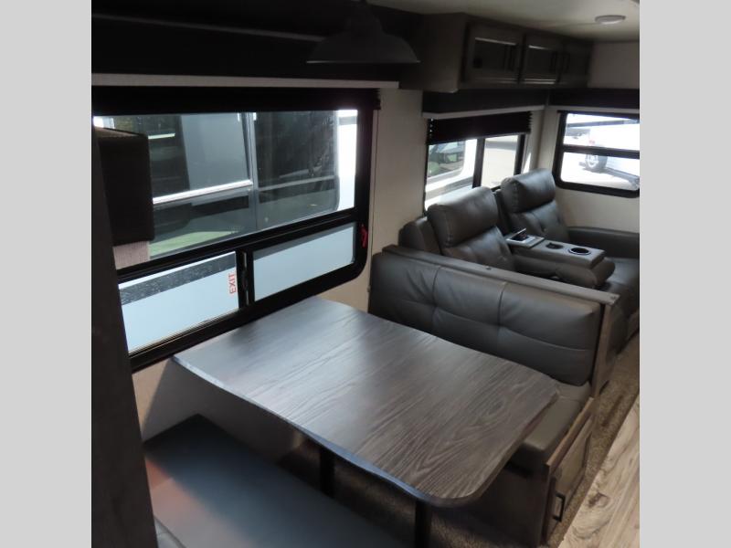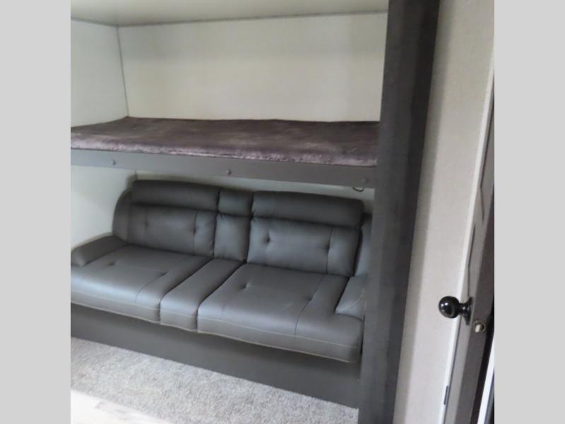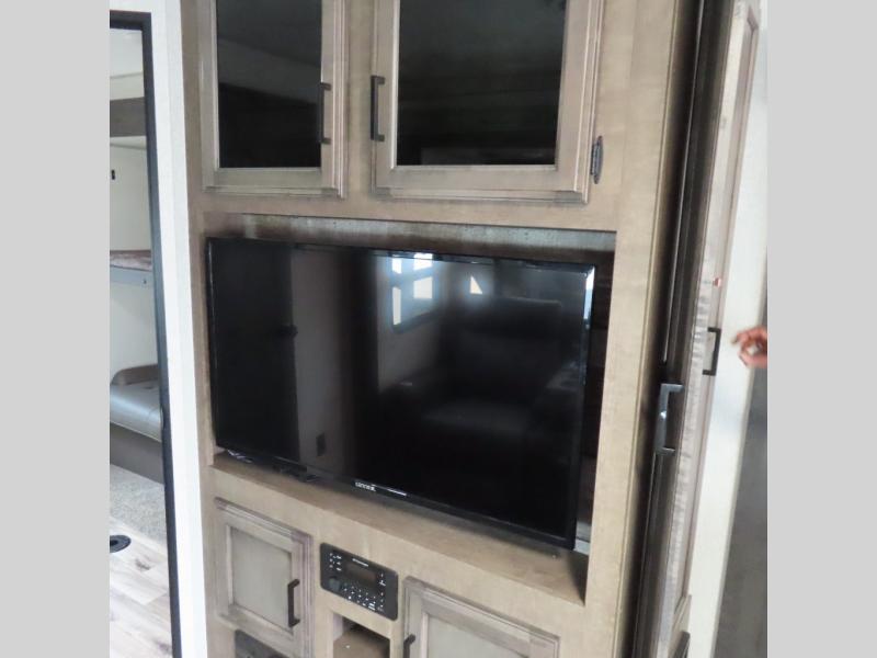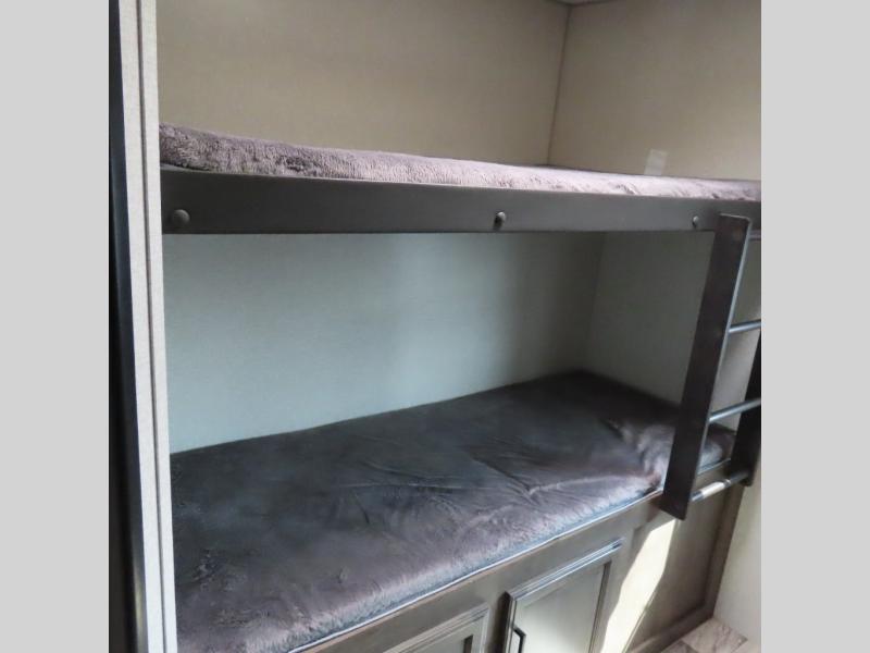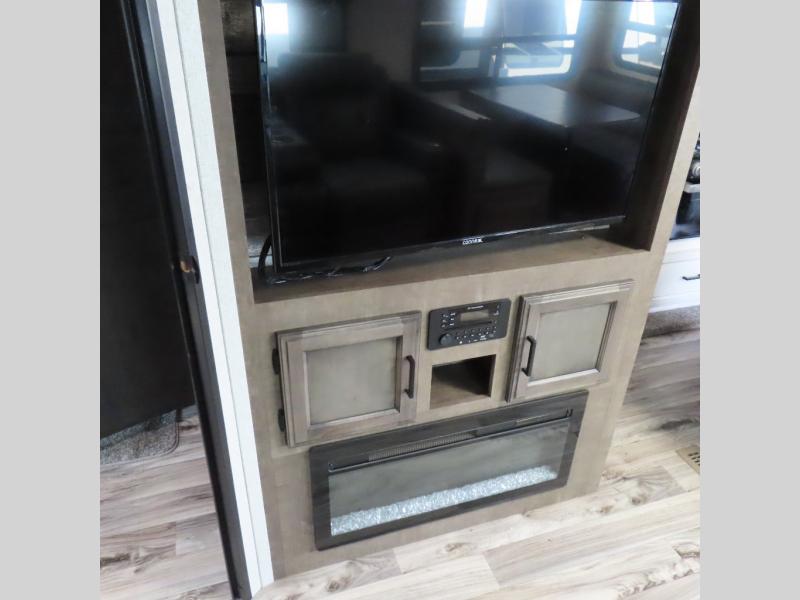 Stay protected rain or shine with the two 10' legless awnings with wind sensor on this travel trailer! Some other exterior features you will enjoy include a campfire café with a 38" TV to watch the big game while you grill steaks on the griddle, and the pass-through storage area with slam latch baggage doors will keep your gear in place. Inside there is a rear private bunkhouse with a closet, a 32" x 70" flip-up bunk above a 70" sofa with a table, and a 28" x 70" bunk above a 40" x 70" bottom bunk. The living area has a sofa across from an entertainment center with a 5,000 BTU frameless fireplace and a 40" TV with a swing arm so others can watch it from the 42" booth dinette. The dual entry bathroom has a 34" radius shower to freshen up in, and is easy to access, especially those staying in the front private bedroom!