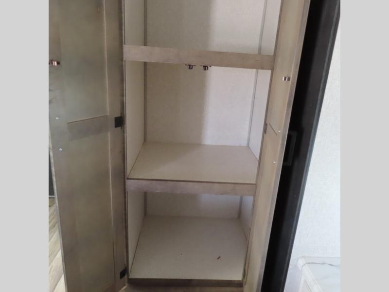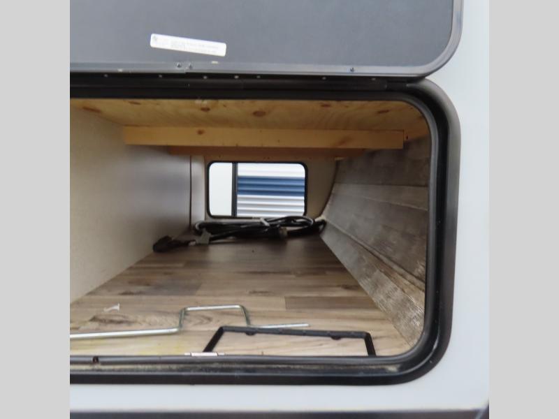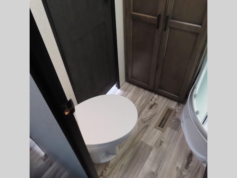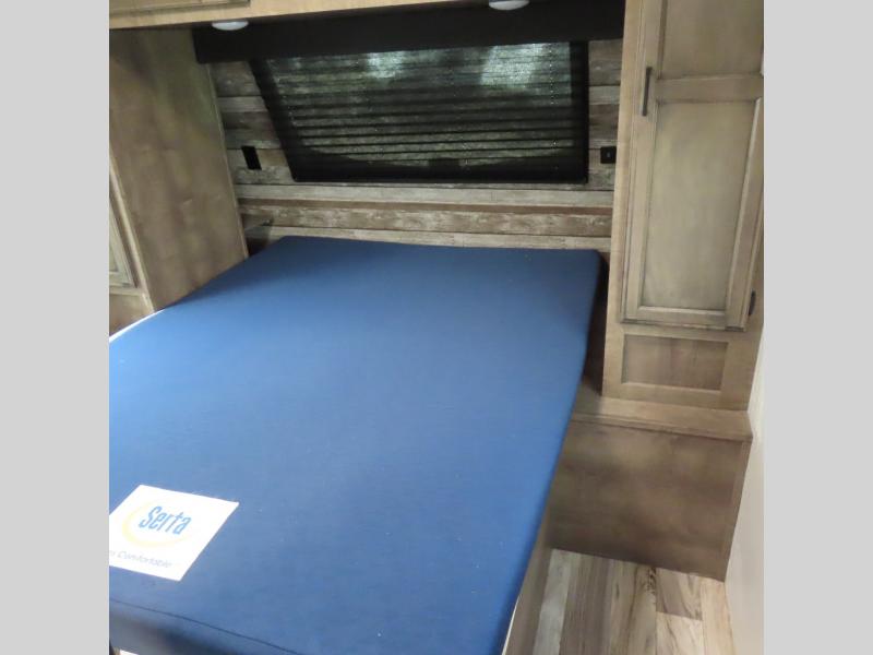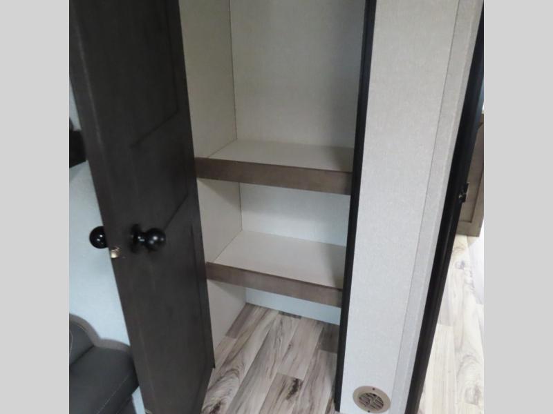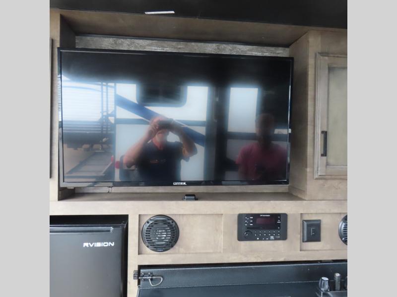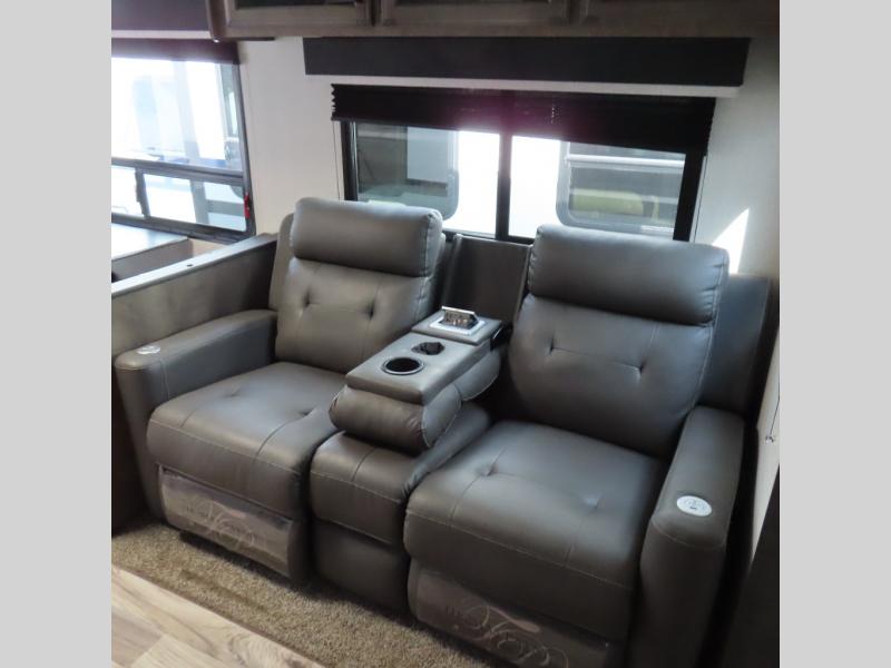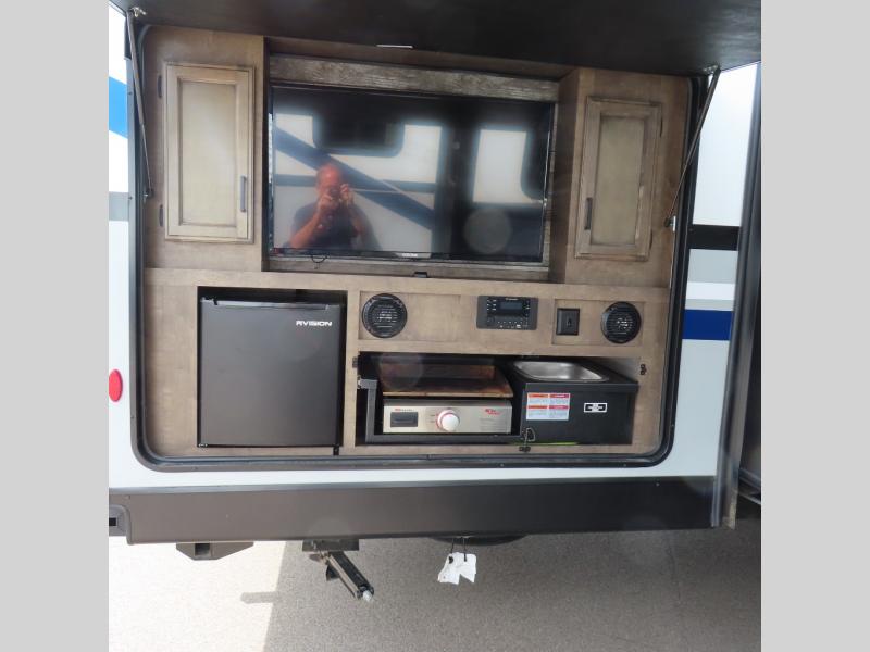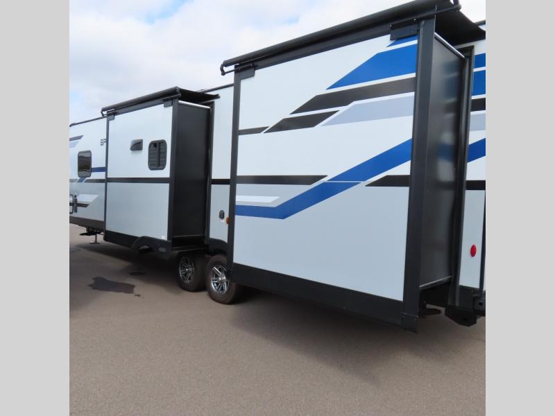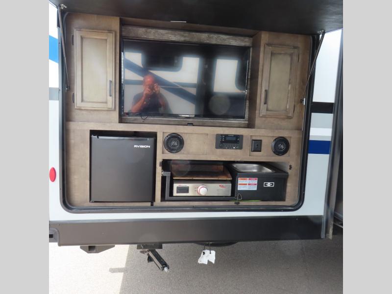 Stay protected rain or shine with the two 10' legless awnings with wind sensor on this travel trailer! Some other exterior features you will enjoy include a campfire café with a 38" TV to watch the big game while you grill steaks on the griddle, and the pass-through storage area with slam latch baggage doors will keep your gear in place. Inside there is a rear private bunkhouse with a closet, a 32" x 70" flip-up bunk above a 70" sofa with a table, and a 28" x 70" bunk above a 40" x 70" bottom bunk. The living area has a sofa across from an entertainment center with a 5,000 BTU frameless fireplace and a 40" TV with a swing arm so others can watch it from the 42" booth dinette. The dual entry bathroom has a 34" radius shower to freshen up in, and is easy to access, especially those staying in the front private bedroom!